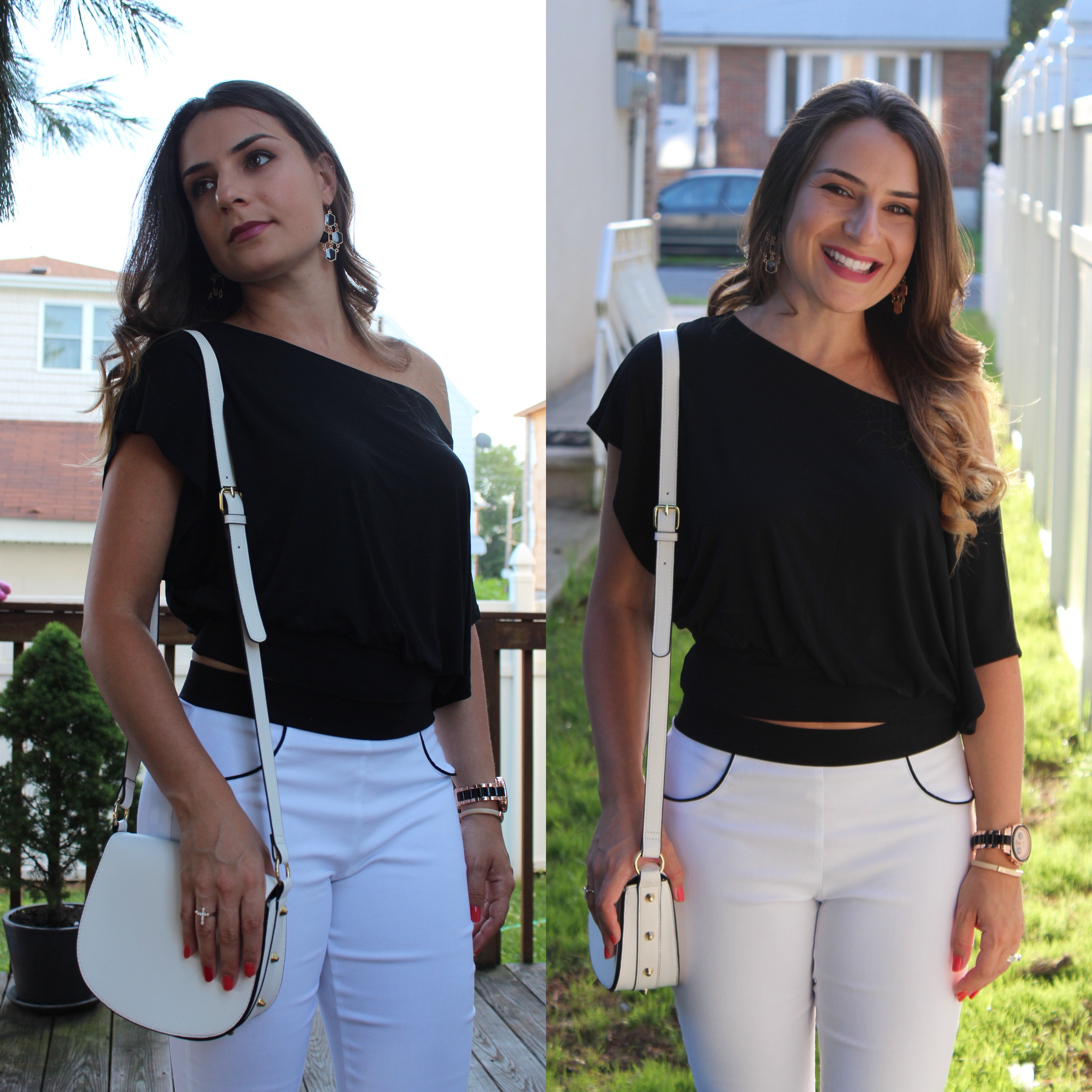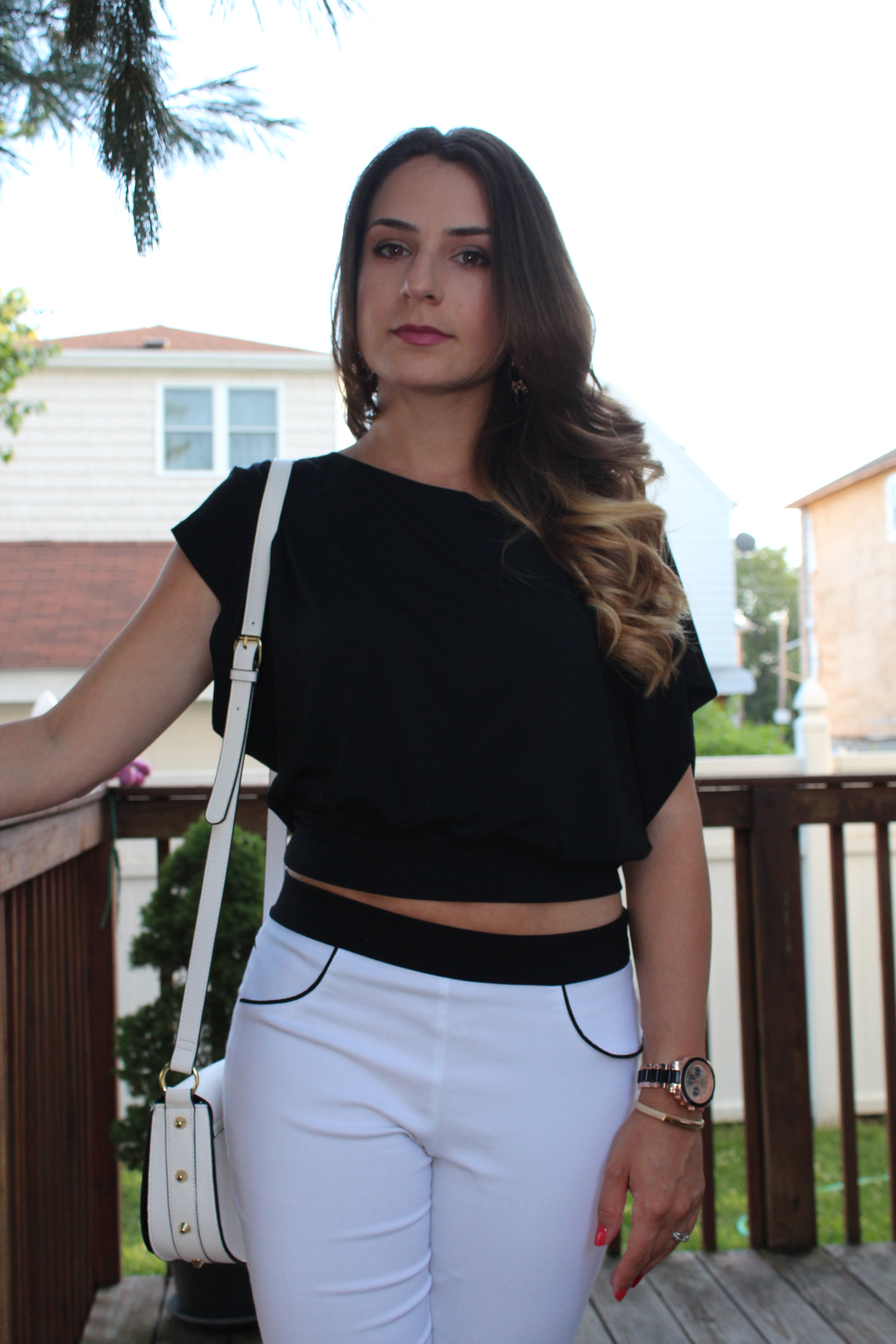 Usei uma calça branca de cintura alta com detalhes preto. Adoro calças de cintura alta, e acho que pra ficar bem tem que ser justamente abaixo do umbigo. Mais alta que isso acho um pouco brega hehe. A blusinha é um cropped top que também esta super em alta agora no verão. Finalizei o look com uma sandália nude e uma bolsinha branca.