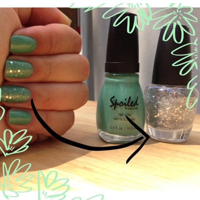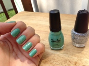 Essas ultimas semanas não tenho tido tempo de fazer nail art que eu amo tanto!:( Mas para não ficar sem postar minha unha da semana, segue minha escolha de hoje: usei um verde água da Wet & Wild Spoiled, ele é meio brilhoso e um pouco ralo entao passei duas camadas dele para obter um resultado melhor. E para dar um toque diferente resolvi passar o L.A. color glitter por cima, mas só em duas unhas.