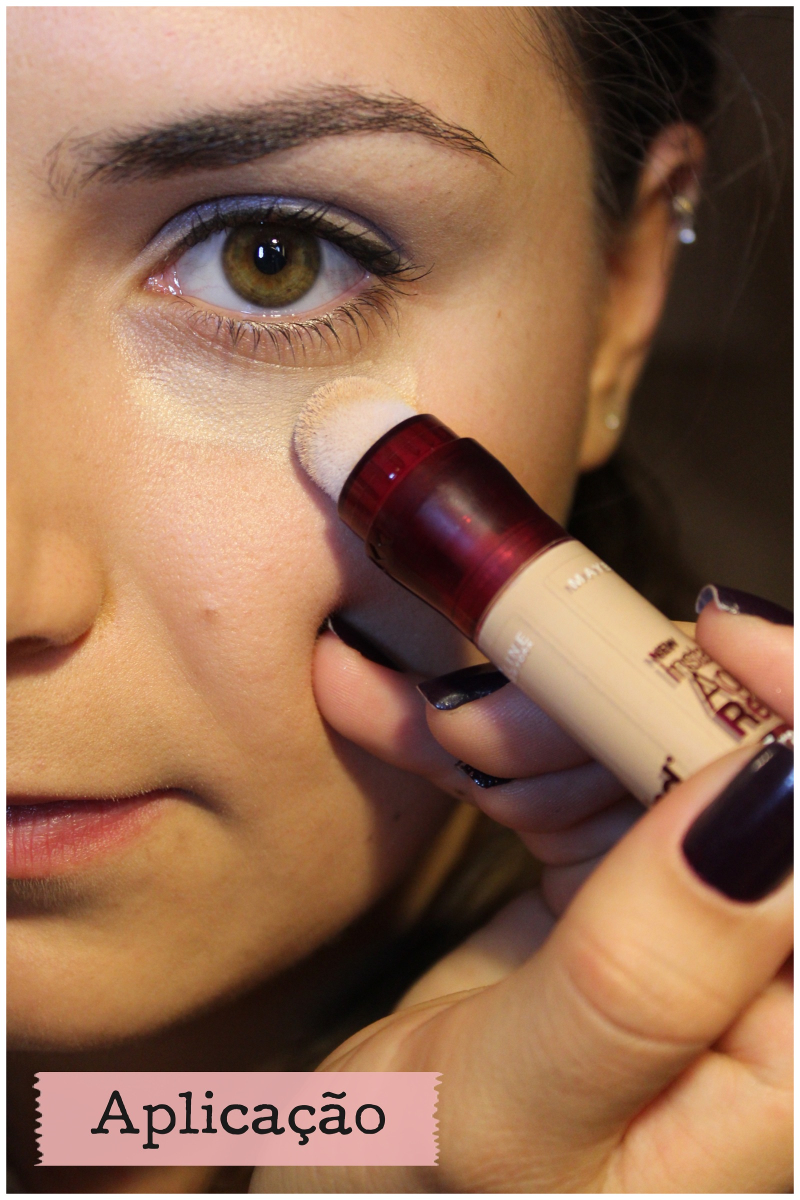 A embalagem é bem interessante: você gira a parte de plástico vermelha para que o produto chegue até a esponjinha e depois aplica diretamente na pele. Supostamente, você pode espalhar com a própria esponja, mas eu gosto de aplicar com a esponja em toda área abaixo dos olhos e depois com um pincel de base espalhar o produto. Sempre finalizo com um pouquinho de pó compacto num pincel fofinho de aplicar iluminador. Assim o produto fica intacto o dia inteiro e evita oleosidade na área.