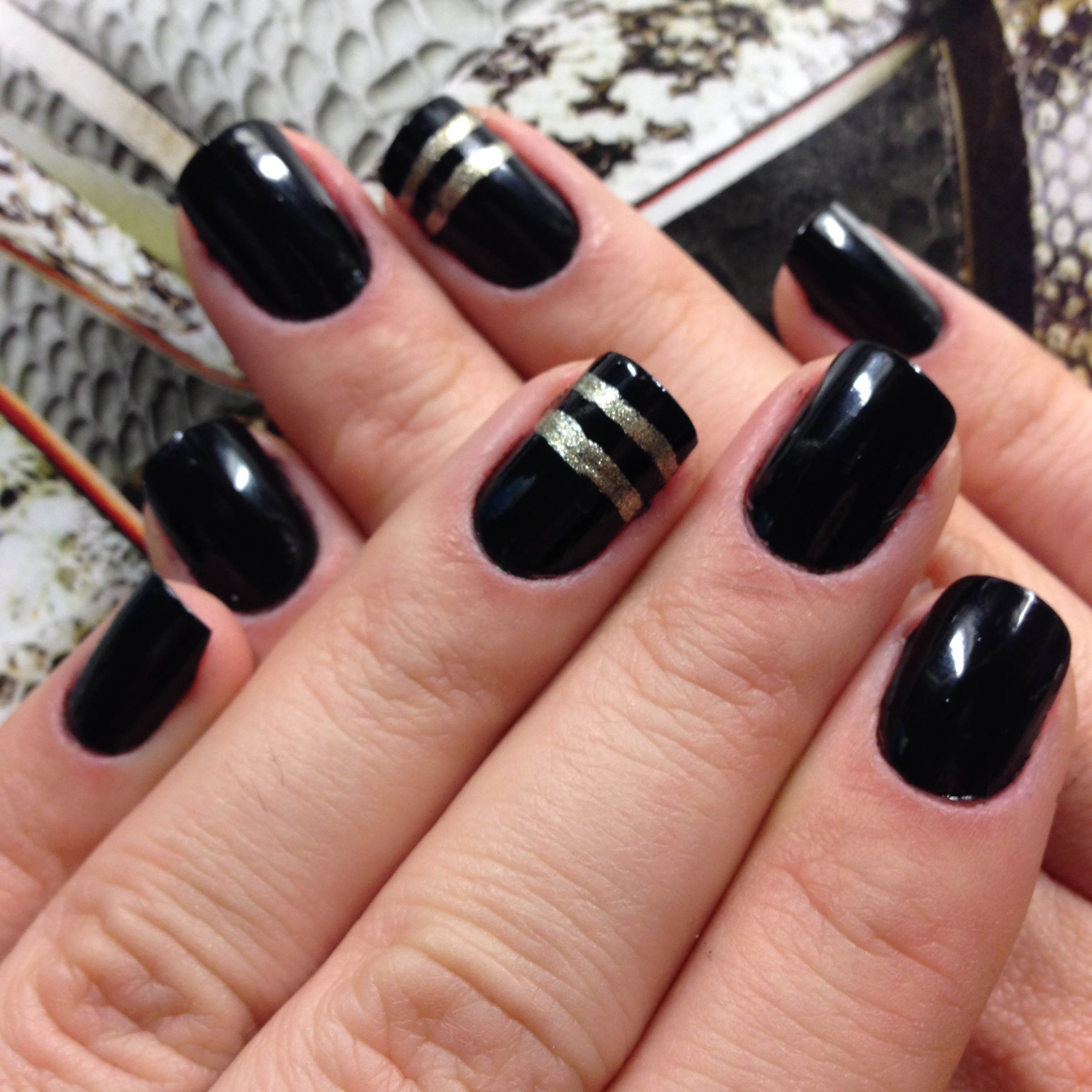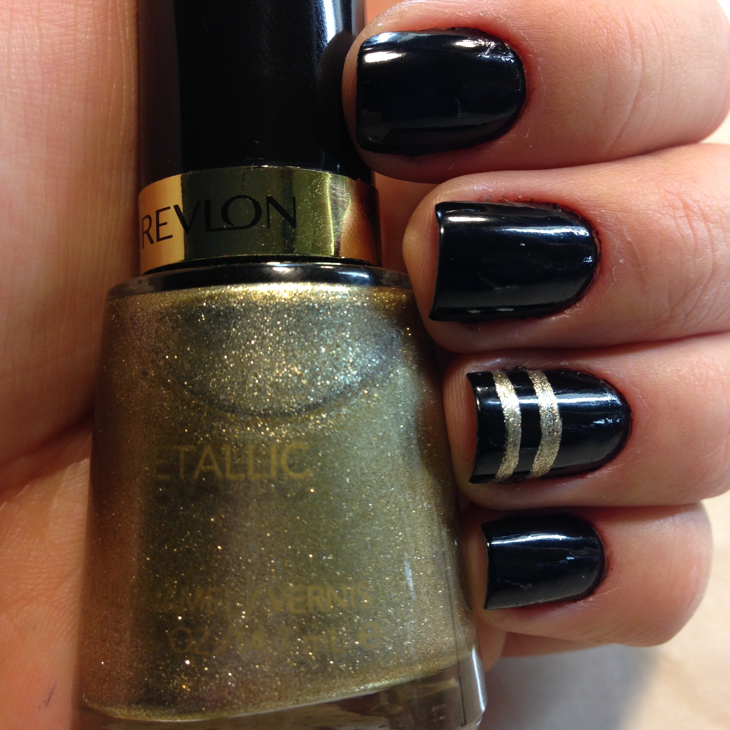 photo 2-1Eu adoro  esmalte escuro, e o preto e vinho são meus favoritos. Como eu fiz as minhas unhas na sexta a noite, optei por um esmalte de secagem rápida. Passei duas camadas do Ebony Hates Chris da marca Wet & Wild da linha Fast Dry, secagem rápida. Para dar um up nas unhas, resolvi fazer um nail art rápido e prático. Usei o esmalte Gold Coin da Revlon e fiz dois riscos  em uma filha única. Usei um pincel fininho com o esmalte dourado.