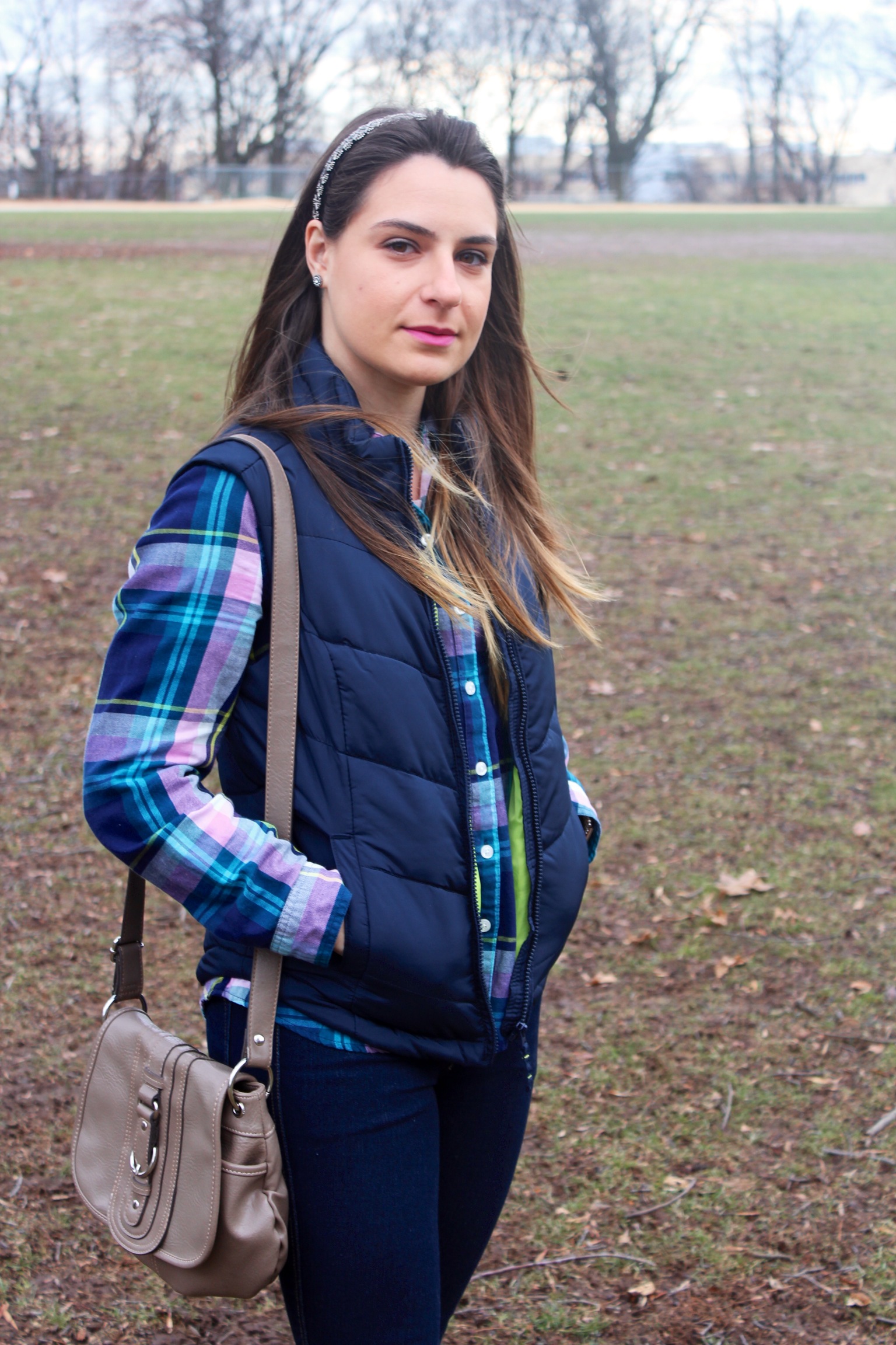 Escolhi um look super confortável com camisa xadrez que continua super em alta e colete de inverno bem quentinho, com calça jeans azul skinny e bota de coturno preta que eu adoro! Adorei a harmonia das cores da camisa que combinaram perfeitamente com as cores do colete. Deu um ar mais alegre para um dia frio e cinzento! Para dar um tom mais gracioso, coloquei uma tiara de pedrinhas e usei uma bolsa tira colo bem básica. Confesso que passei um pouco de frio lá no parque, mas esse look ficou perfeito para um dia de descanso e almoço em casa com a família.