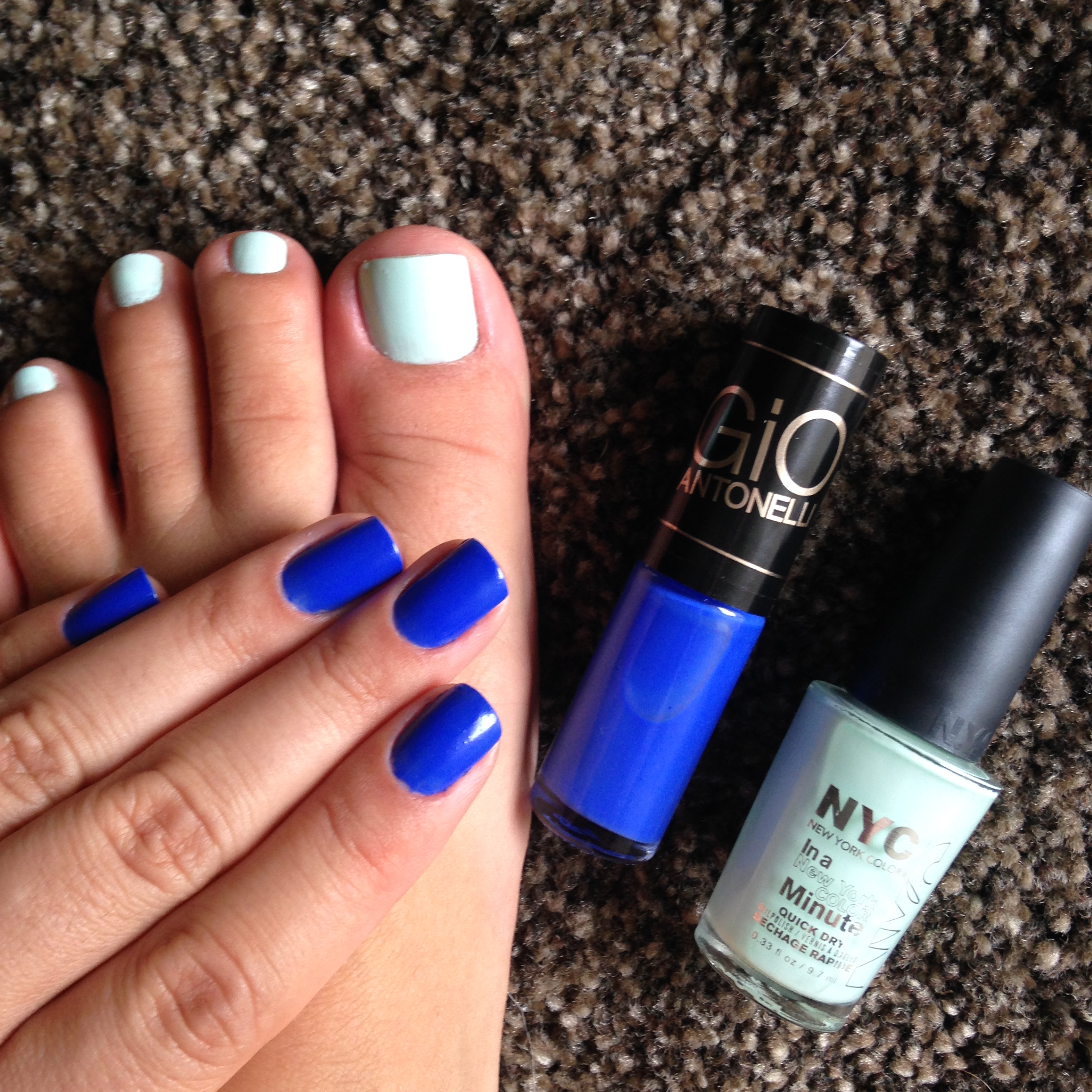 Como uma leitora me pediu, eu vou postar algumas fotos das unhas do pé também. Ela pediu dica de como combinar cores diferentes na mão e no pé. Hoje resolvi optar por uma cor pastél verde claro nos pés e achei que combinou e deu um contraste no azul da mão.