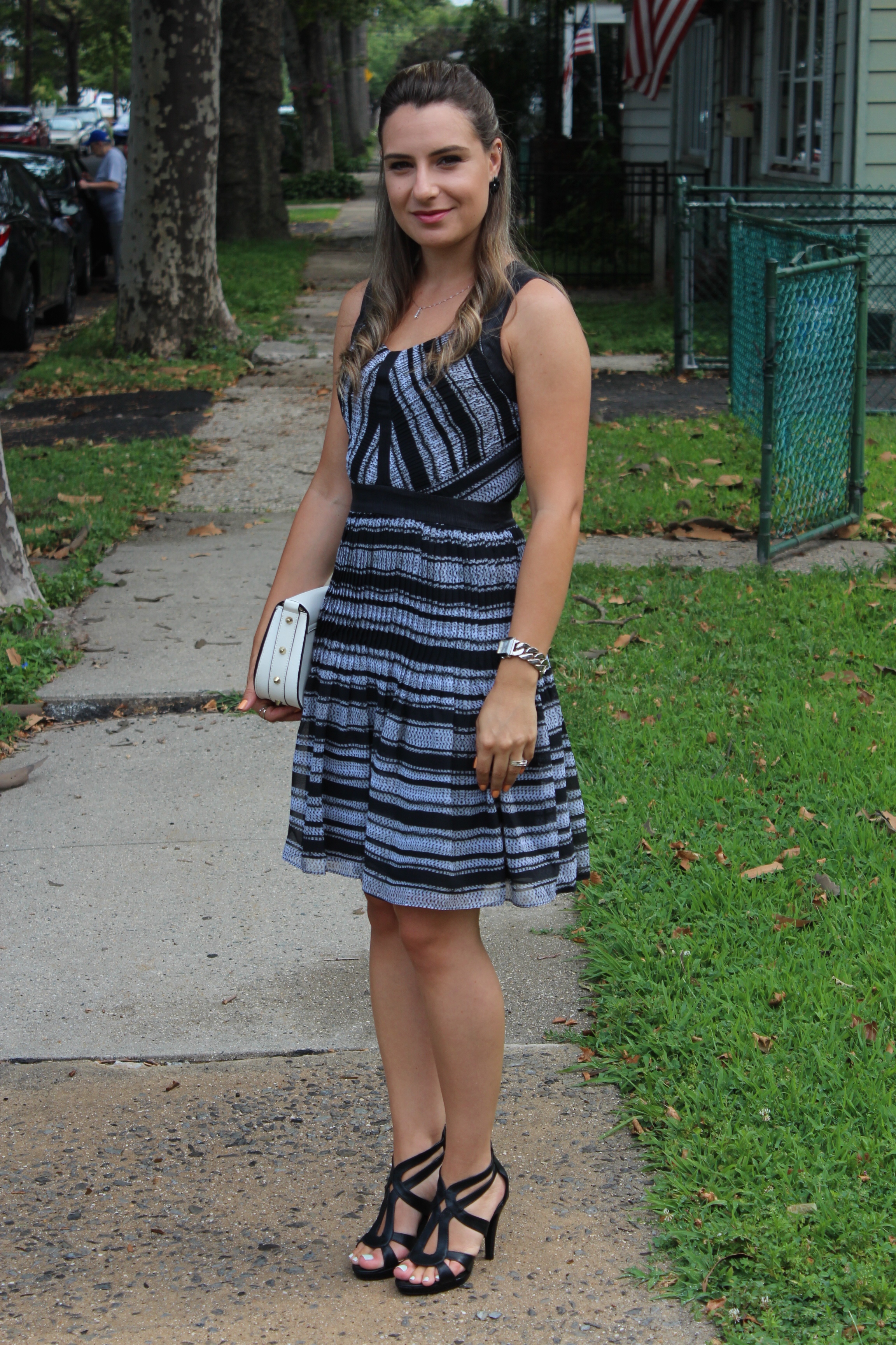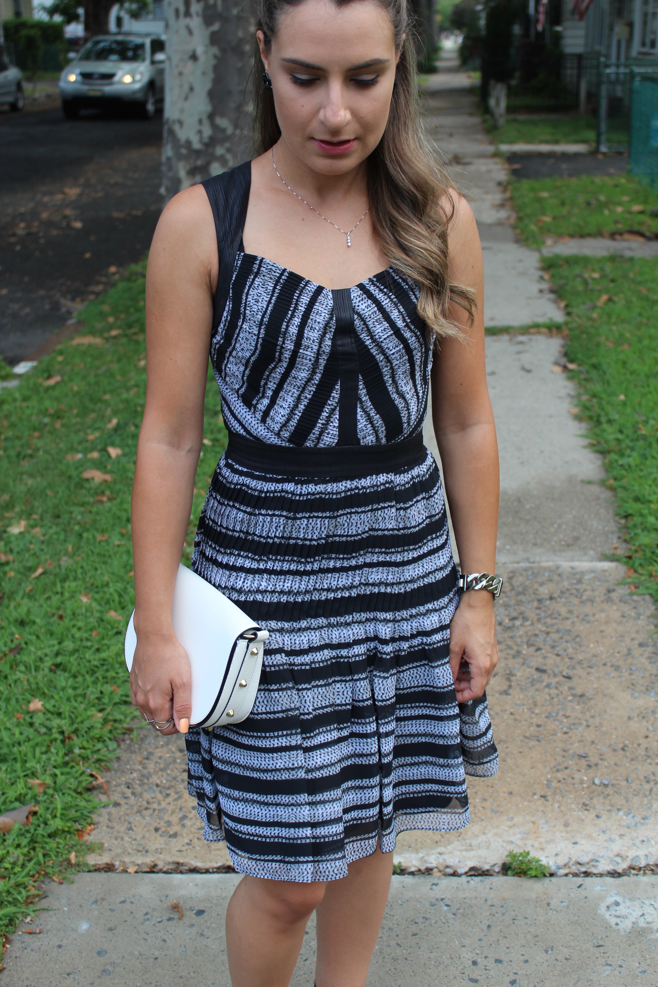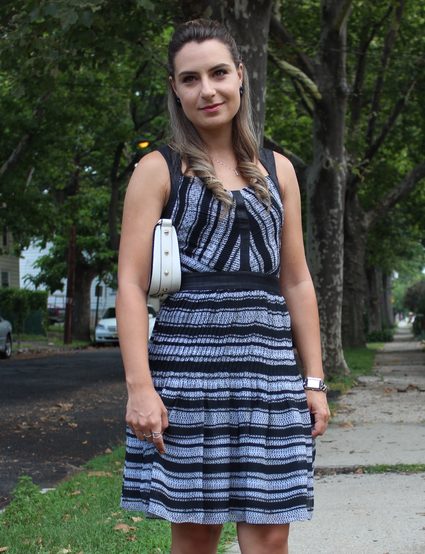 Oi pessoal, hoje vim mostrar o look que usei ontem para ir no chá de panela de uma amiga. Como o clima está bom por aqui, optei por um vestido com sandália. O vestido escolhido tem uma estampa composta pelo preto e o cinza então resolvi usar uma bolsa branca para dar um contraste no look.