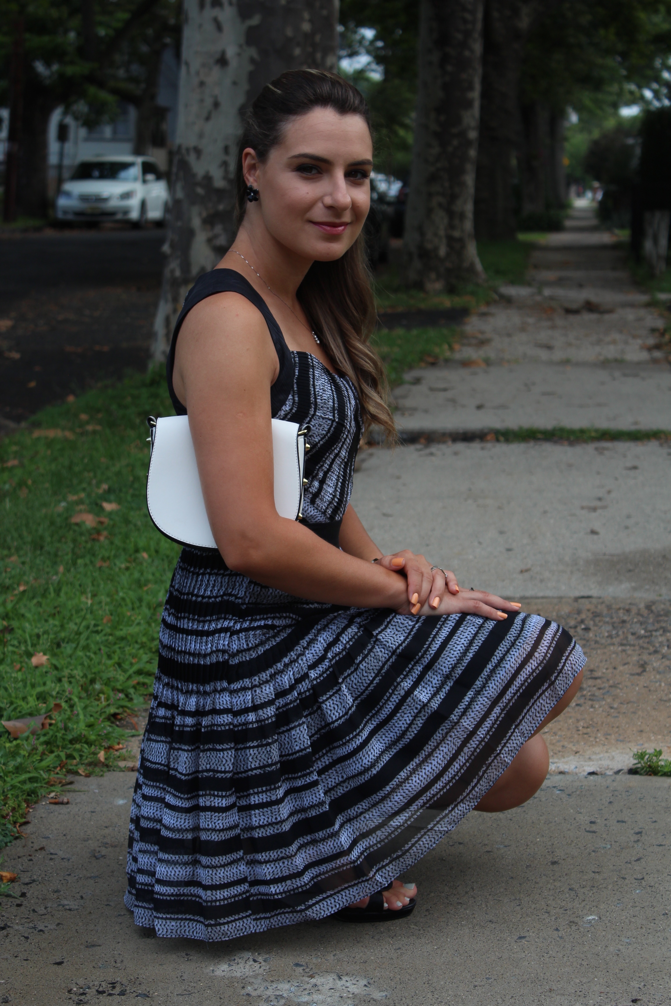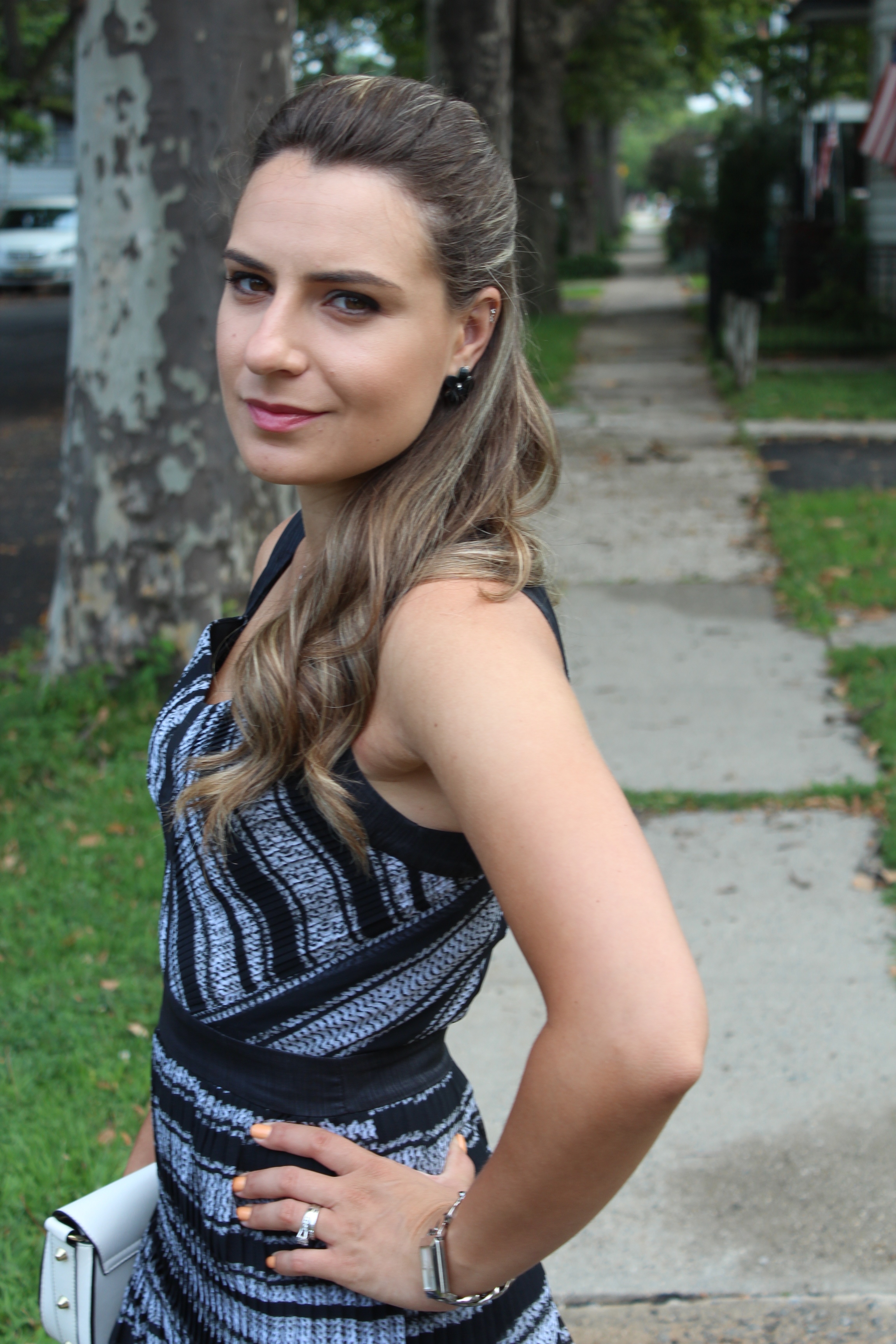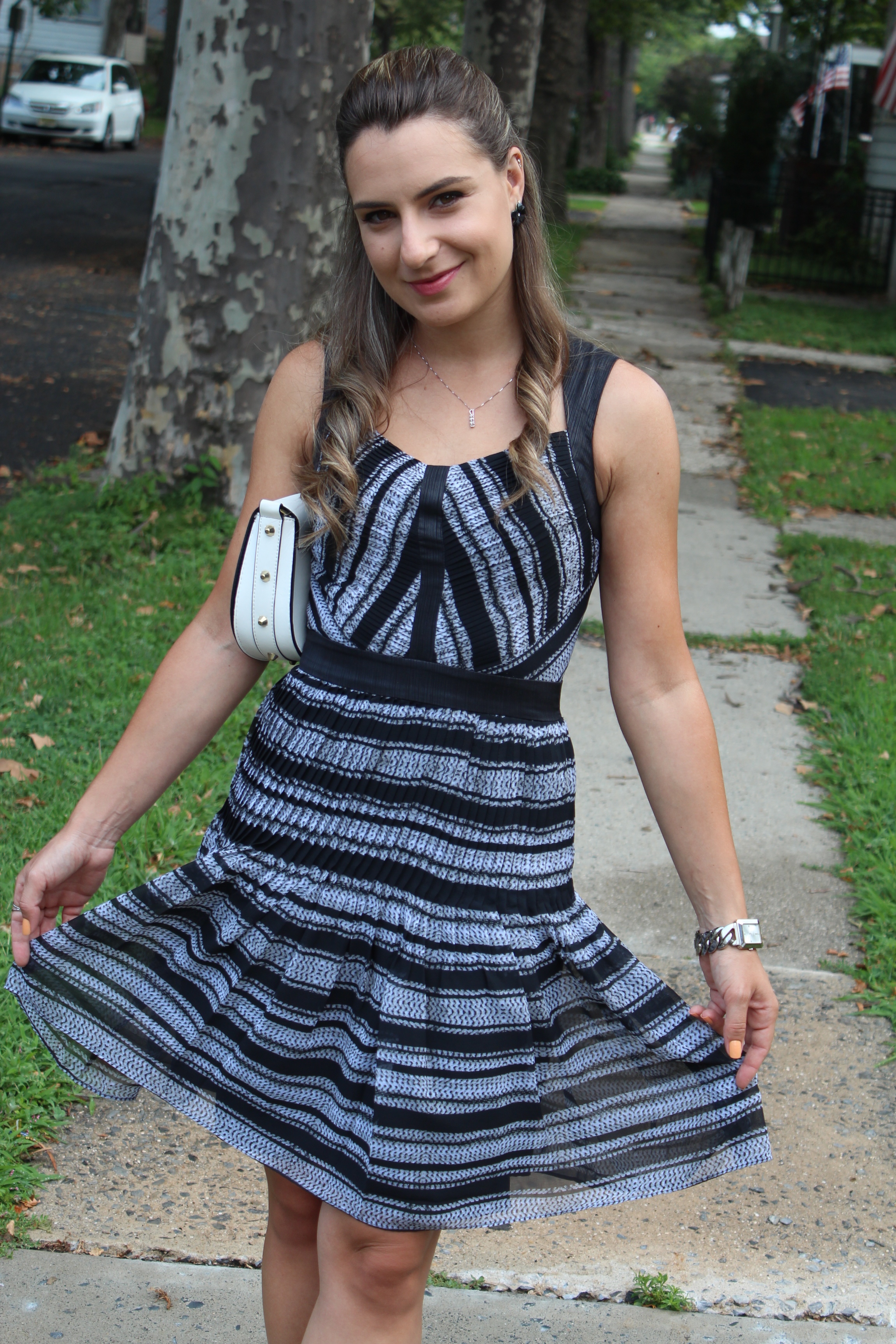 Oi pessoal, hoje vim mostrar o look que usei ontem para ir no chá de panela de uma amiga. Como o clima está bom por aqui, optei por um vestido com sandália. O vestido escolhido tem uma estampa composta pelo preto e o cinza então resolvi usar uma bolsa branca para dar um contraste no look.