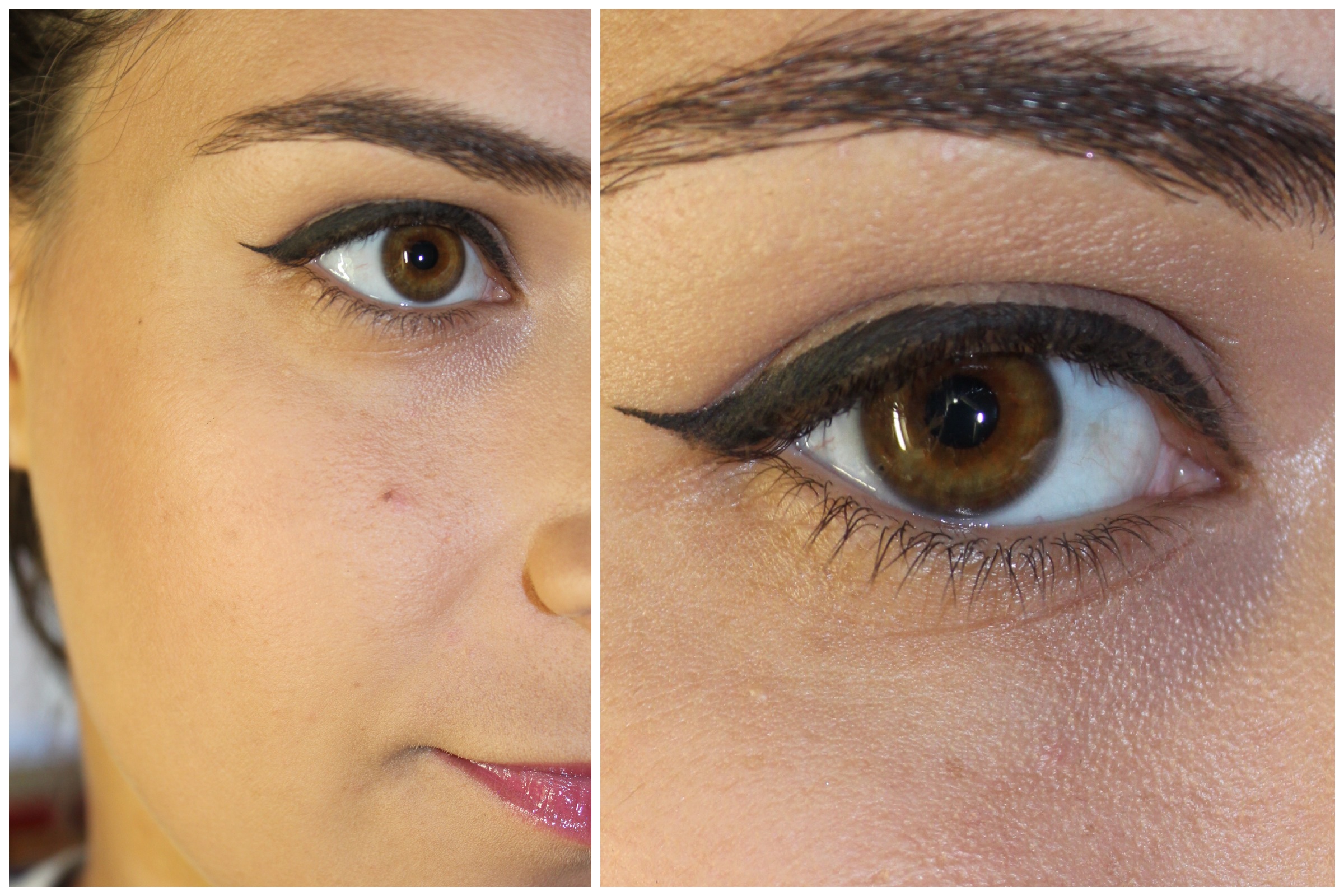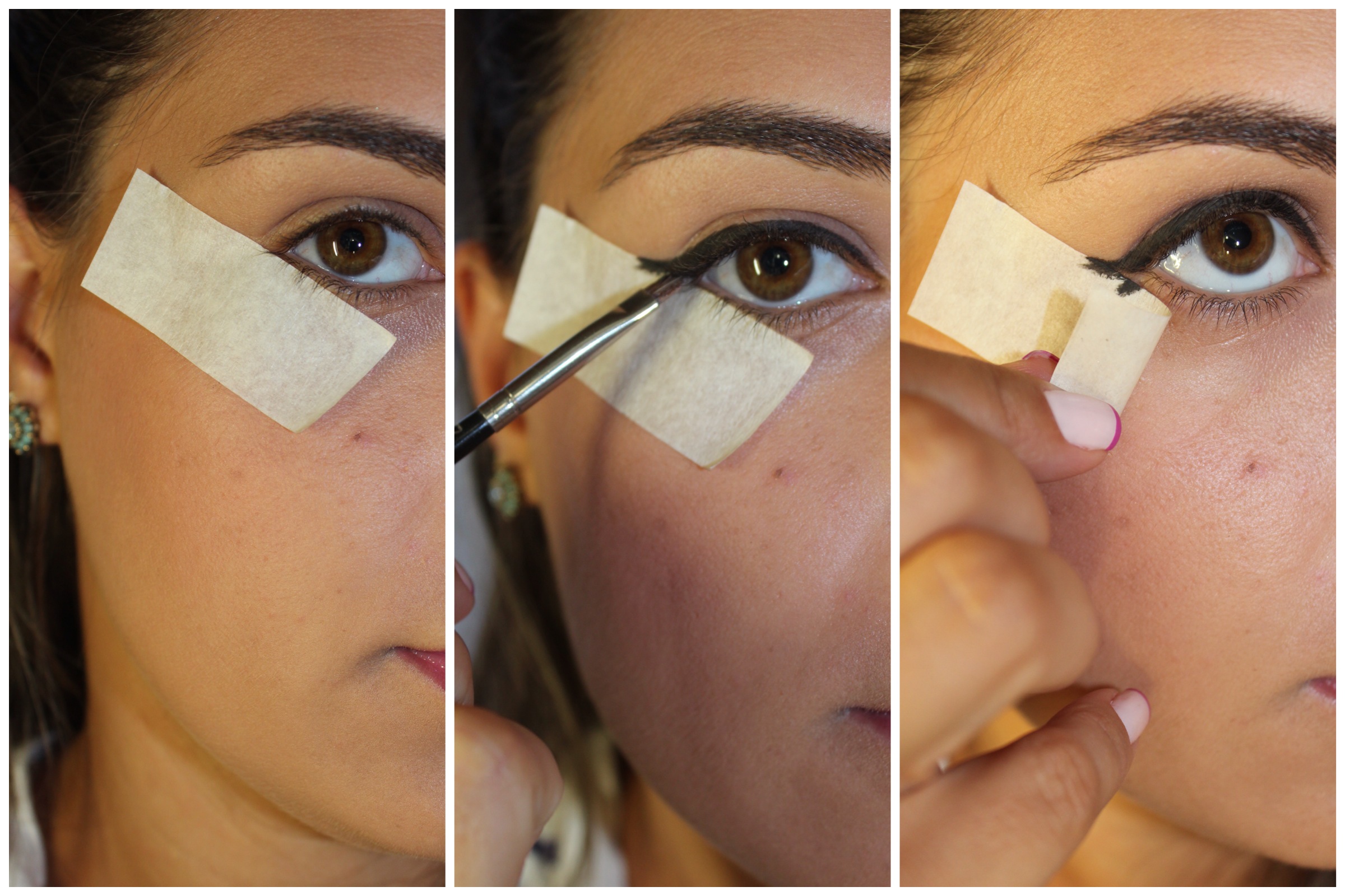 Eu começo colando a fita crepe no meu antebraço para ir tirando um pouco da cola e não machucar o rosto na hora de puxar. O certo é você aplicar a fita rente aos cílios inferiores e em direção do final da sua sobrancelha. A minha está um pouco mais curta do que seria o normal então deixei a fita mais pra fora mesmo. Em seguida comece traçando o delineador do meio da pálpebra para o canto exterior e aí você faz o puxado rente a fita adesiva. Eu fiz mais curto porque é como eu gosto de usar para a make do dia a dia, mas a escolha é sua.