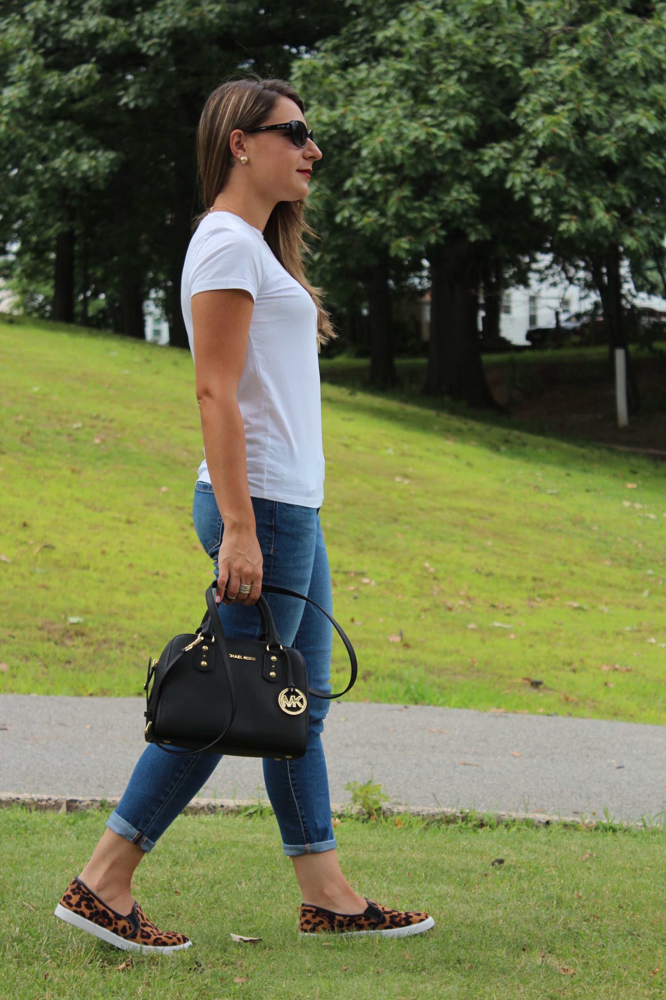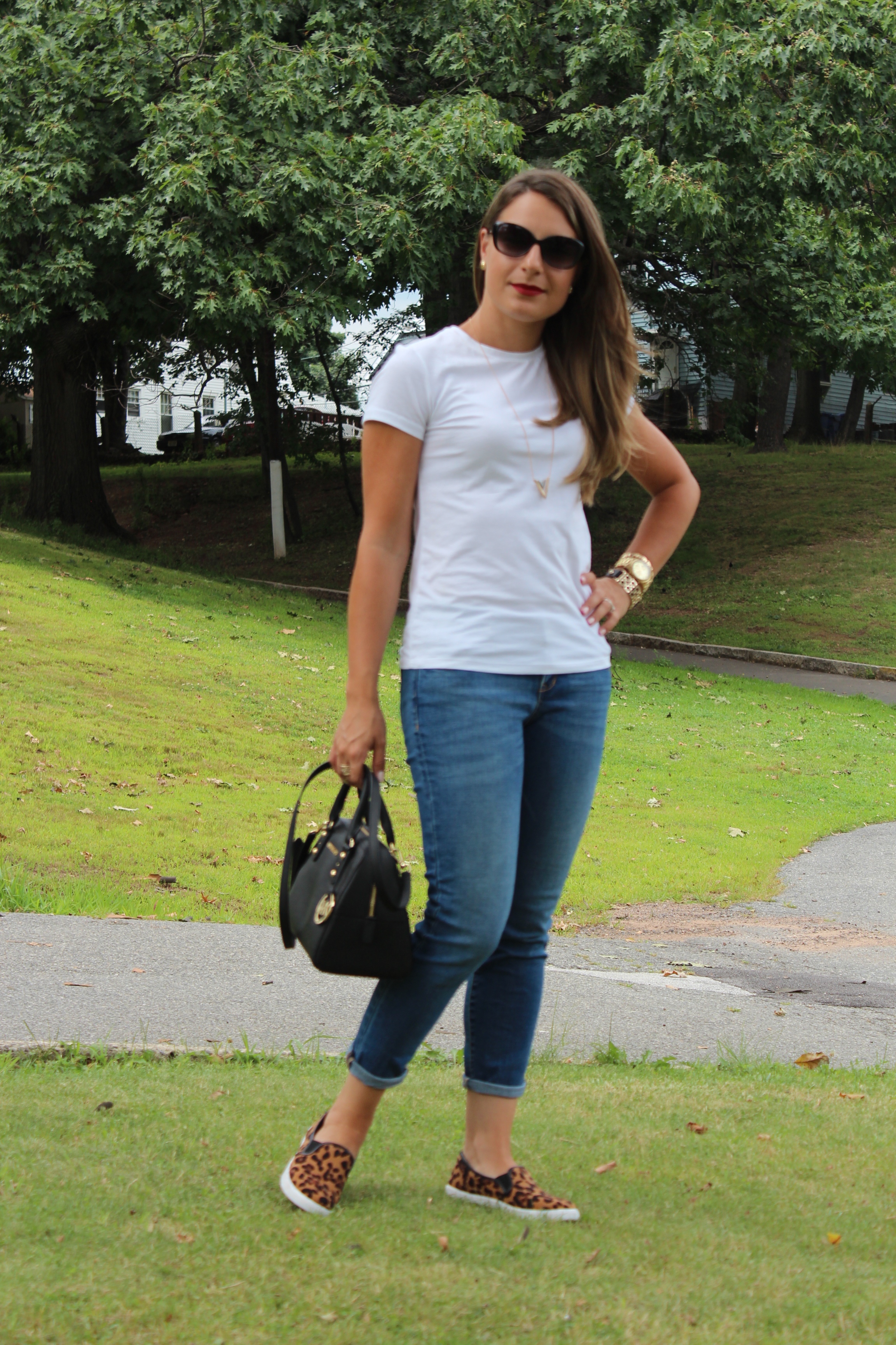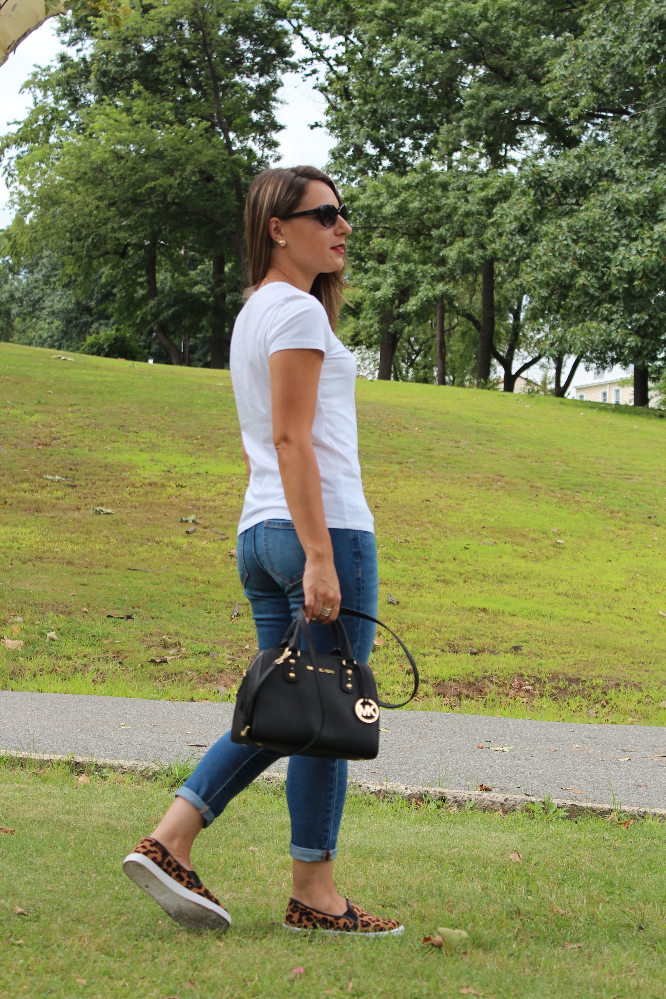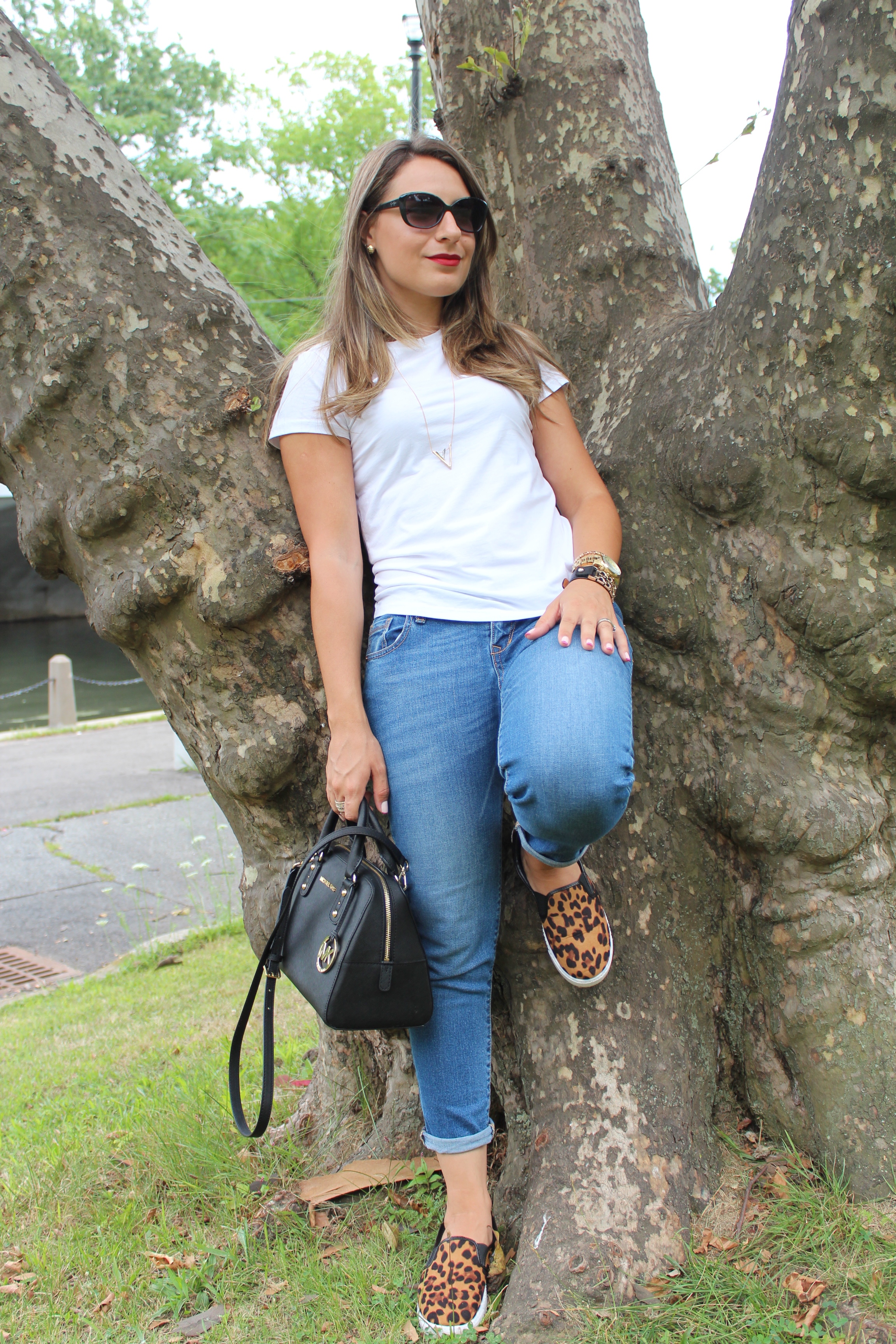 Eu amo essa combinação e se pudesse usava todos os dias! Esse look escolhi para o sábado que foi bem corrido por aqui. Pela manhã fui as compras, depois fomos levar o niky para caminhar no parque (onde batemos as fotos) e a tarde fomos passear e ver o por do sol na marina perto da estátua da liberdade. Um look super confortável para caminhar e para a correria do dia. Para dar um toque chic e quebrar um pouco aquela combinação super básica, eu usei um sapatenis de oncinha, acessórios dourado e um batom vermelho. Também dobrei a barra da calça para dar um ar mais cool.