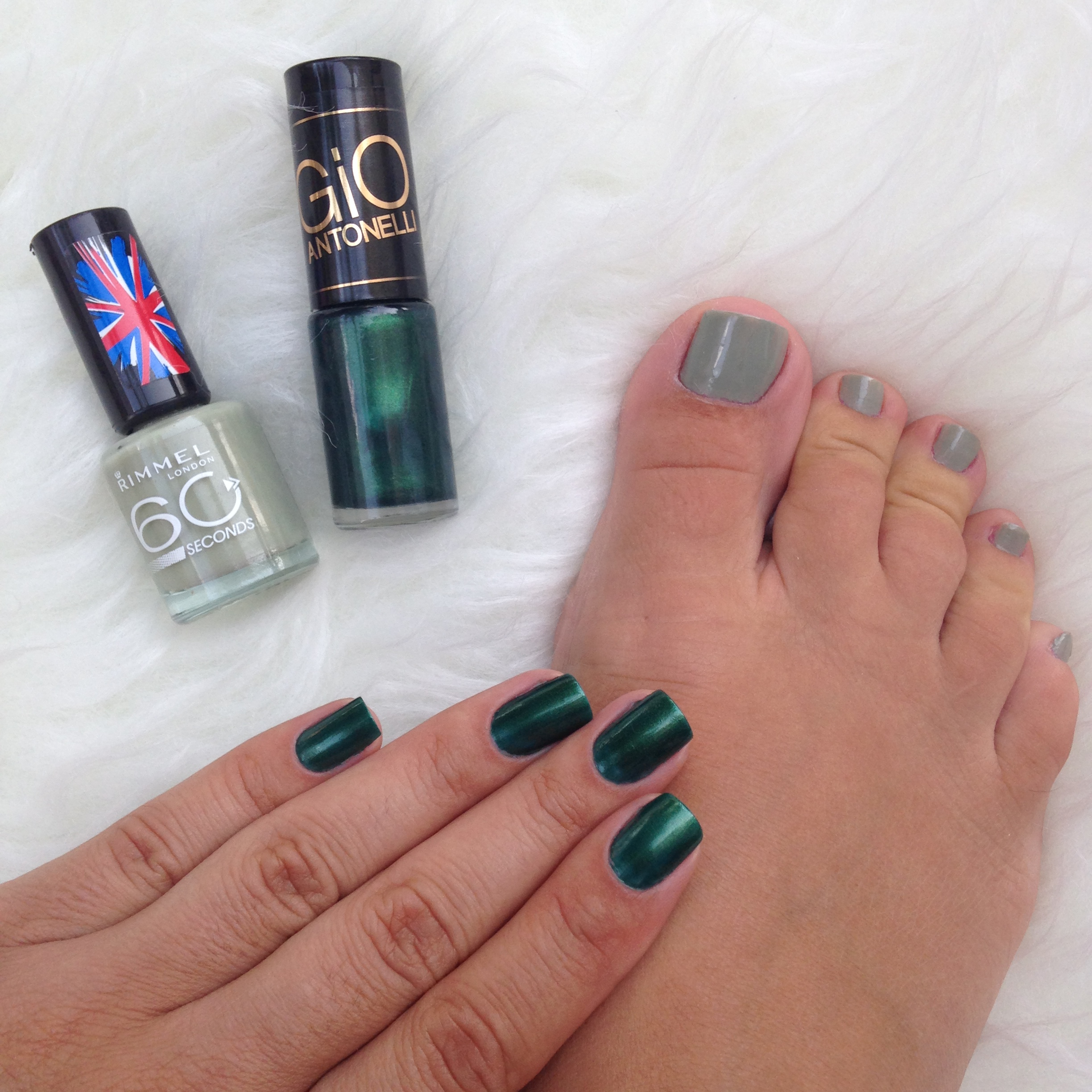 Nos pés eu passei o Sage all the Rage da marca Rimmel London que é um verde musgo pastel sem brilho. Não gosto de usar a mesma cor que uso nas mãos então optei por algo mais claro mas que fosse entrar em harmonia com o verde escuro Alegria Perolado.
