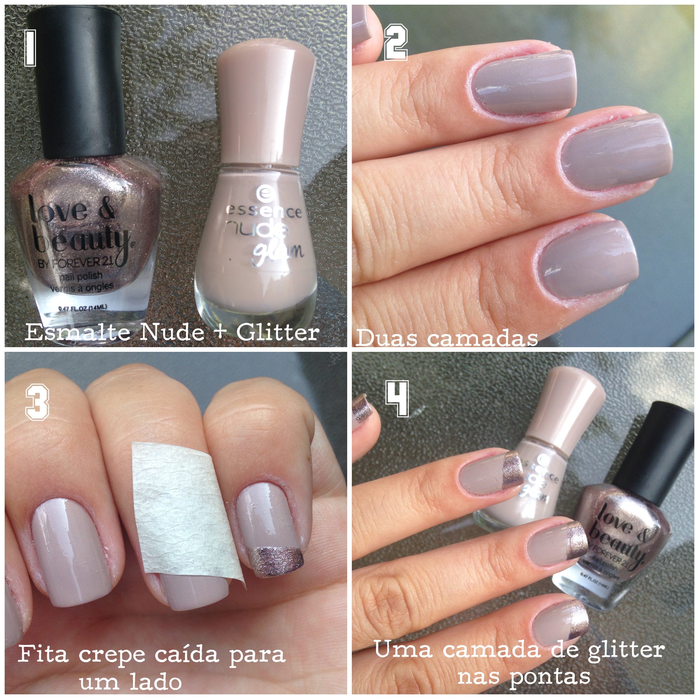 Usei o Pinterest como minha fonte de inspiração para hoje e achei cada unha linda que deu vontade de fazer todas! Mas escolhi fazer essa combinação com um esmalte nude e um esmalte de glitter prateado num tom rosado. Ao invés de fazer a francesinha retinha e delicada, apostei em descer o pincel verticalmente deixando um lado mais grosso. Para isso, eu usei uma fita crepe para evitar borrar no esmalte nude.