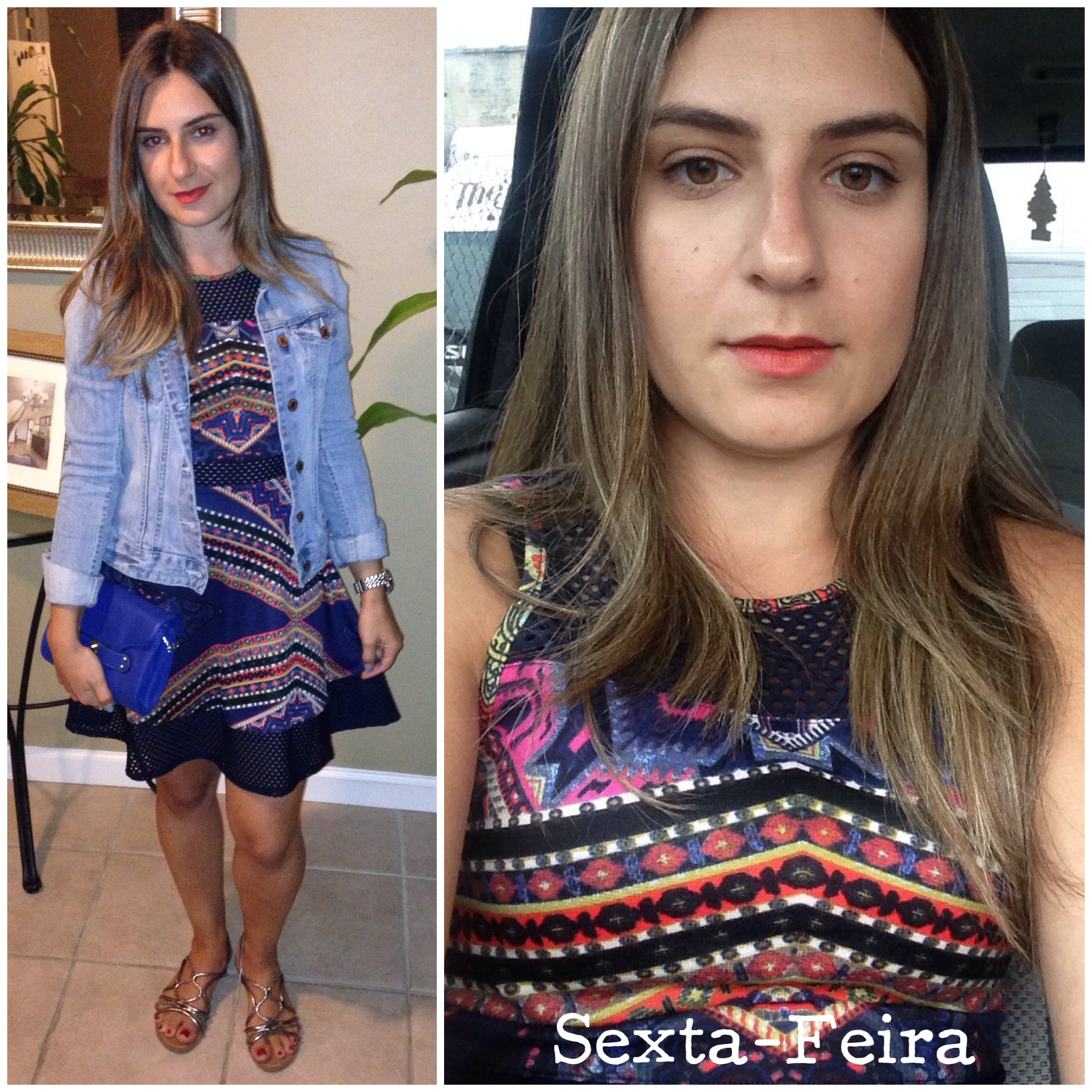 Vestido TJ Max, Jaqueta H&M, Rasteira Target, Bolsa Jessica Simpson, Relógio Fossil e Batom Sweet Nectar Milani.