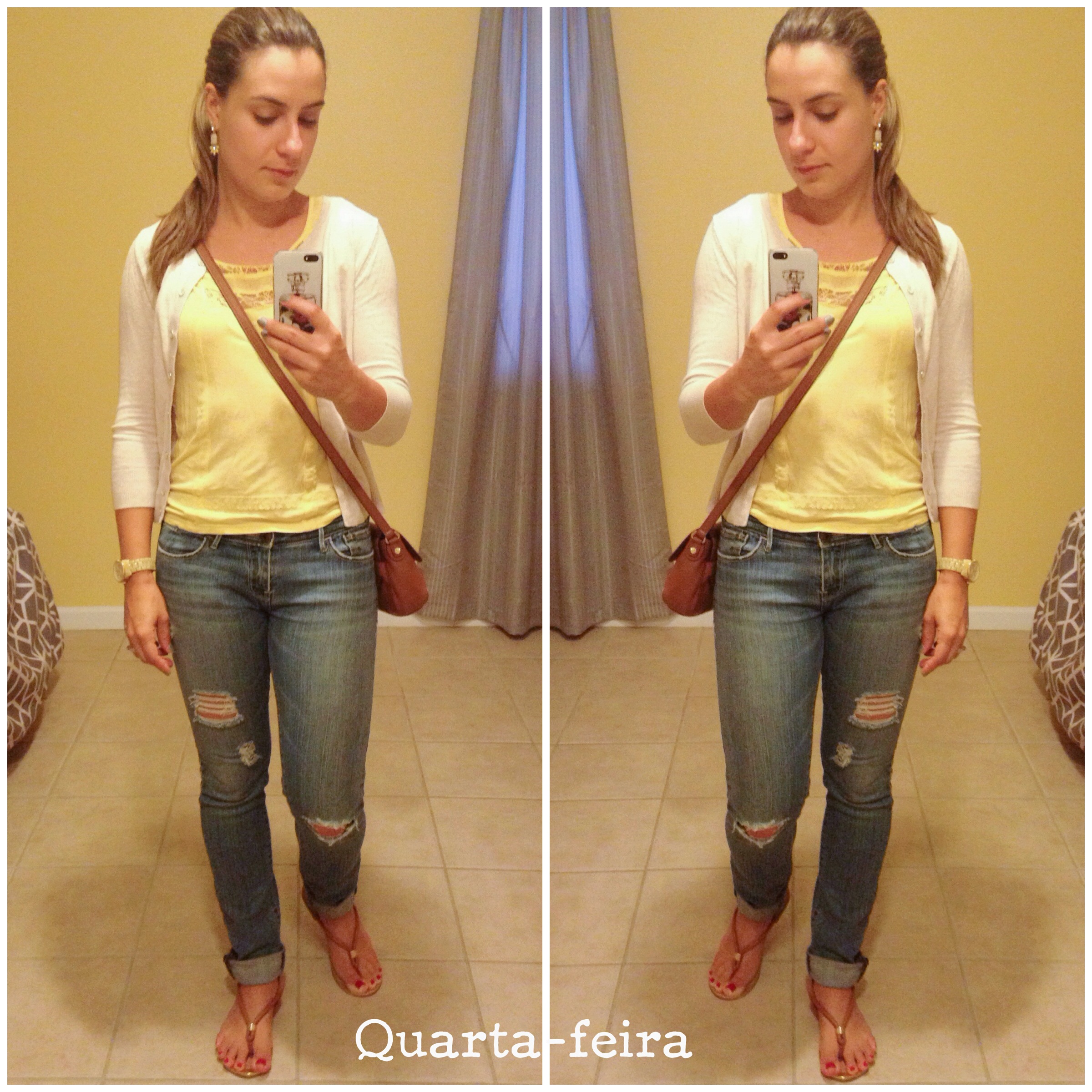 Calça Abercrombie & Fitch, Top H&M, Cardigan GAP, Rasteira Steve Madden, Bolsa e Relógio Michael Kors