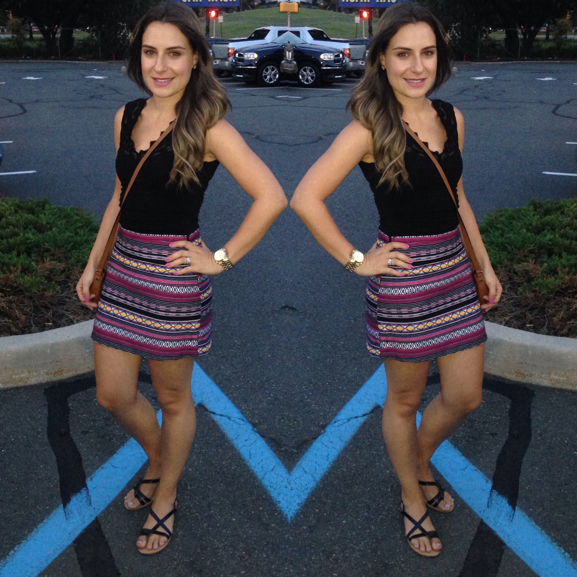 Saia Forever 21, Blusa H&M, Rasteira Old Navy, Bolsa e Relogio Michael Kors.