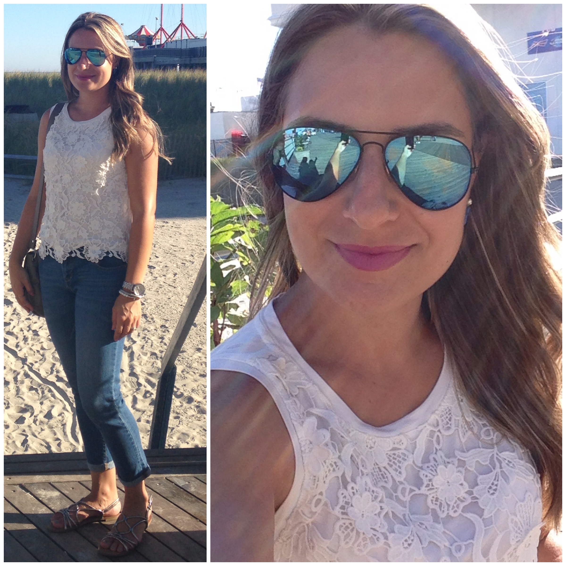 Jeans Old Navy, Blusa Forever 21, Rasteira Target, Óculos Ray Ban, Batom Smokin Hot Pink da Wet & Wild.