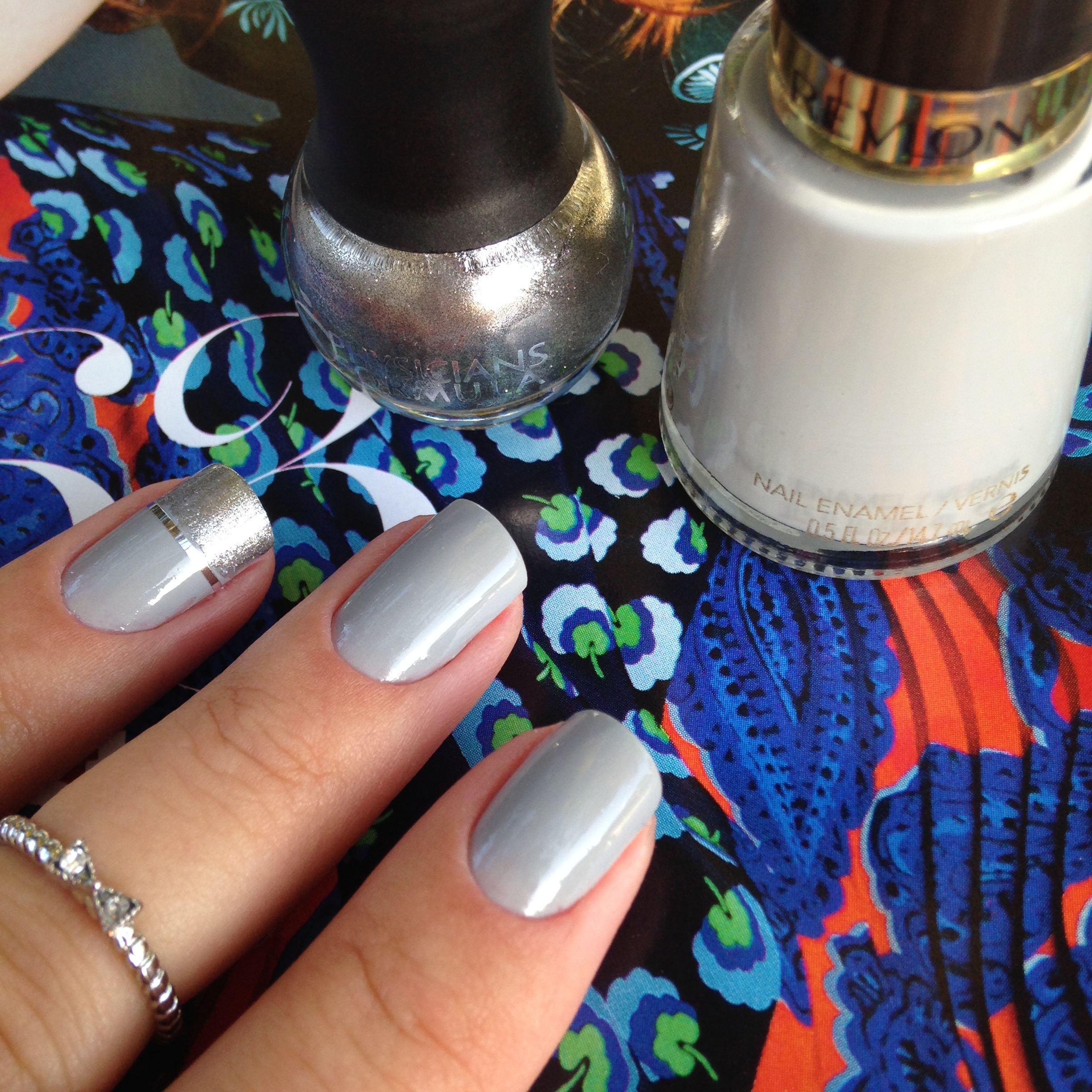 A filha única foi bem fácil fazer. Depois que o esmalte secou, apliquei uma tirinha adesiva prateada e pintei as pontas da unha com um esmalte prateado. Adorei o efeito. Ficou super charmosa!!!