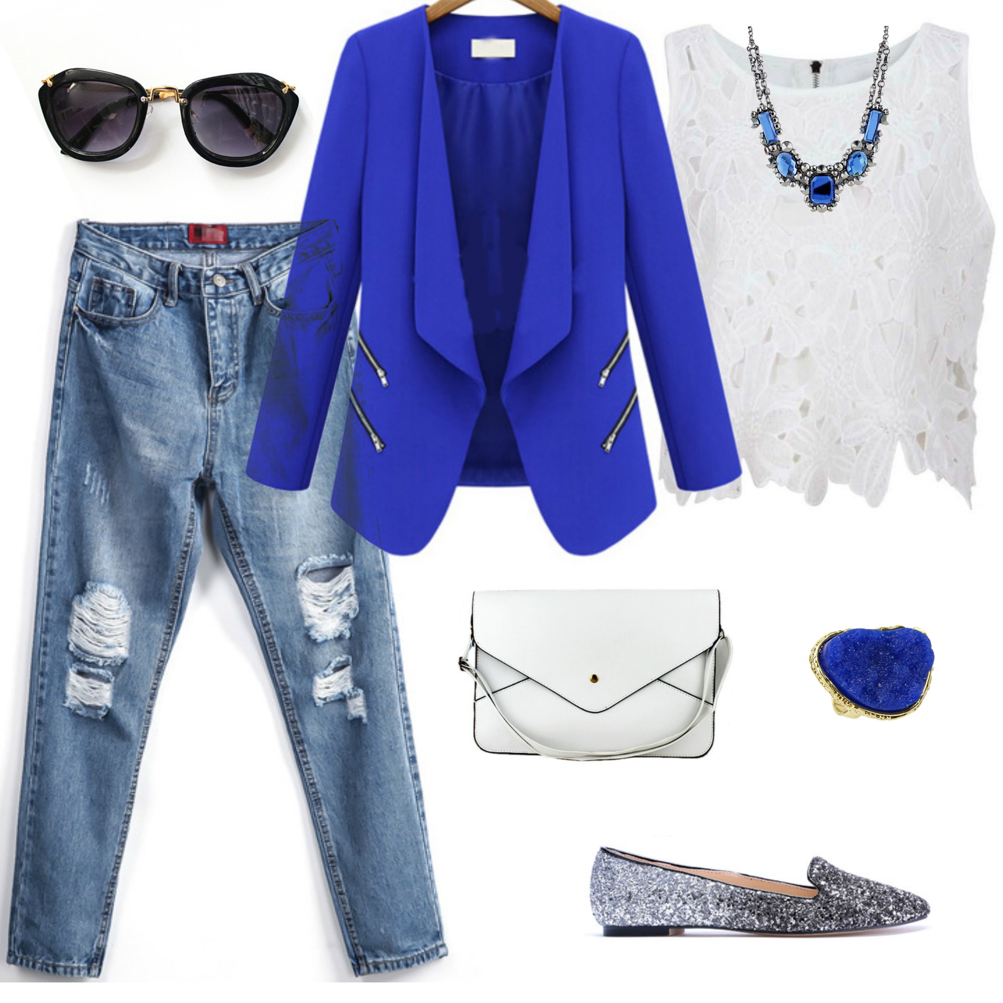 Hoje eu trago uma dica bem bacana para você que quer comprar roupas que estejam na moda com um preço bem em conta. O site SheInside tem varias roupas e acessórios super lindos e entregam no mundo inteiro. Se você esta nos EUA eles não cobram frete. Para o Brasil eles enviam de graça ordens acima de US$30 e abaixo de US$30 o frete custa $20.99. Tem varias roupas lindas, então fiz uma colagem para mostrar algumas peças que encontrei la no site e que adorei. Montei um look bem casual para a primavera ou outono com o azul royal que esta predominando as vitrines de moda. As calças jeans destroyed estão super em alta e combinada com um blazer mais moderninho não tem erro. A camiseta em textura é no estilo croped e fica lindo com calça de cintura alta. Para completar o look acessórios em tons de azul e sapatilha em cor metálica que também é tendência. Os óculos são inspirados no modelo da marca Miu Miu e custa apenas US12,60!!! Amoooooo!