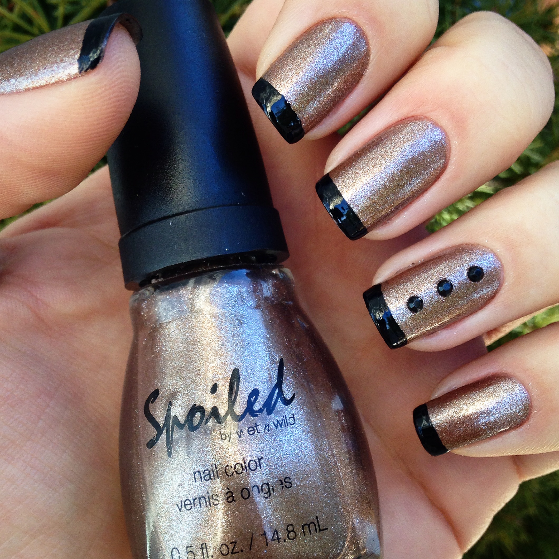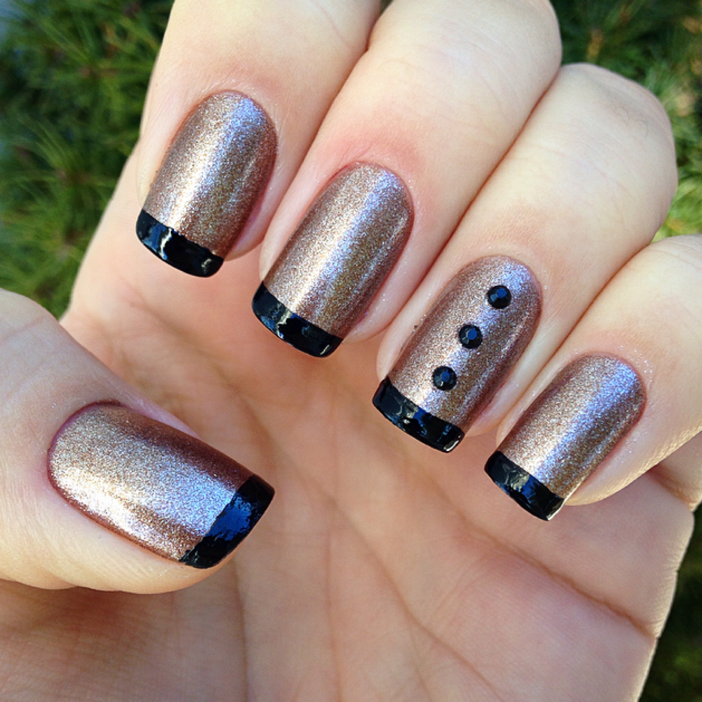 Acabei de fazer minhas unhas para o final de semana e escolhi um esmalte lindo dourado cintilante. Para dar um toque final resolvi fazer estilo francesinha mas com as pontas preta e acrescentei três pedrinhas preta em uma unha de destaque. Adorei o resultado achei que ficou super diferente e clássico ao mesmo tempo!