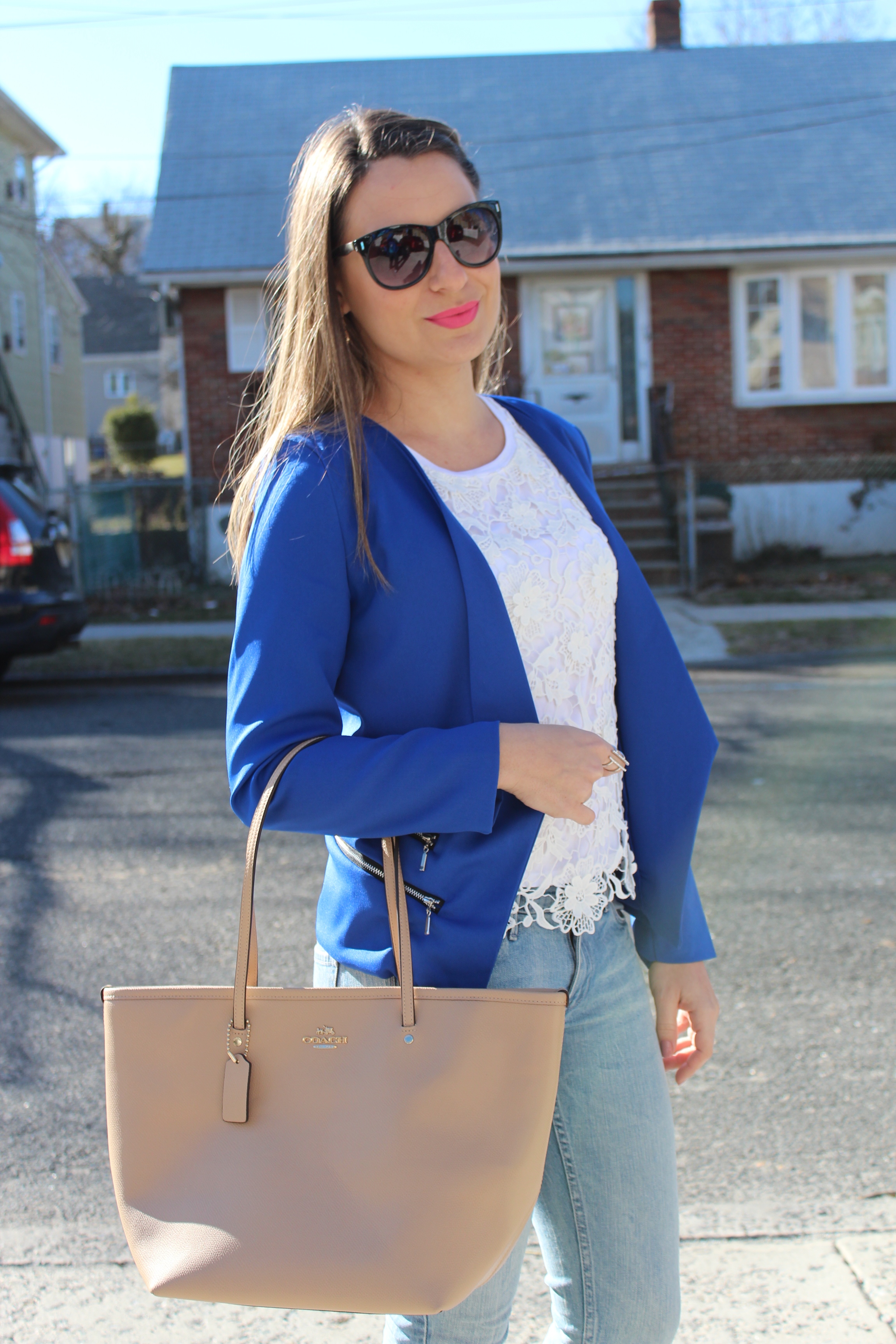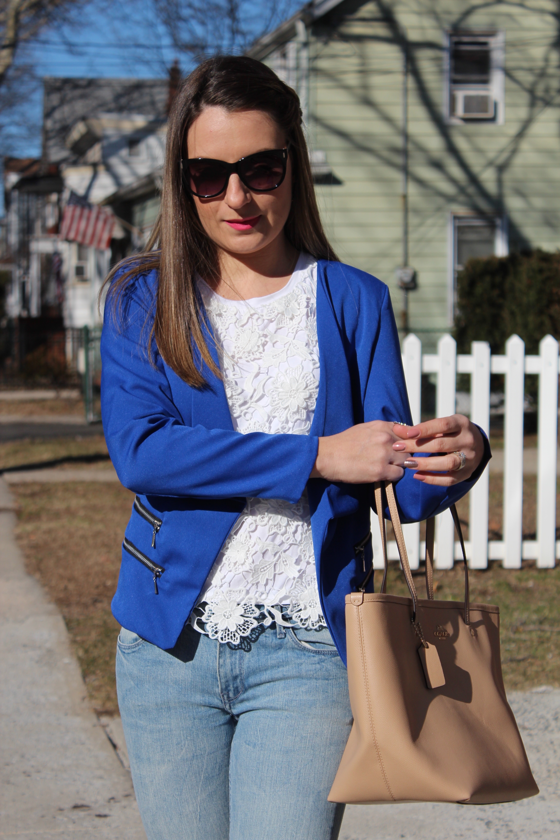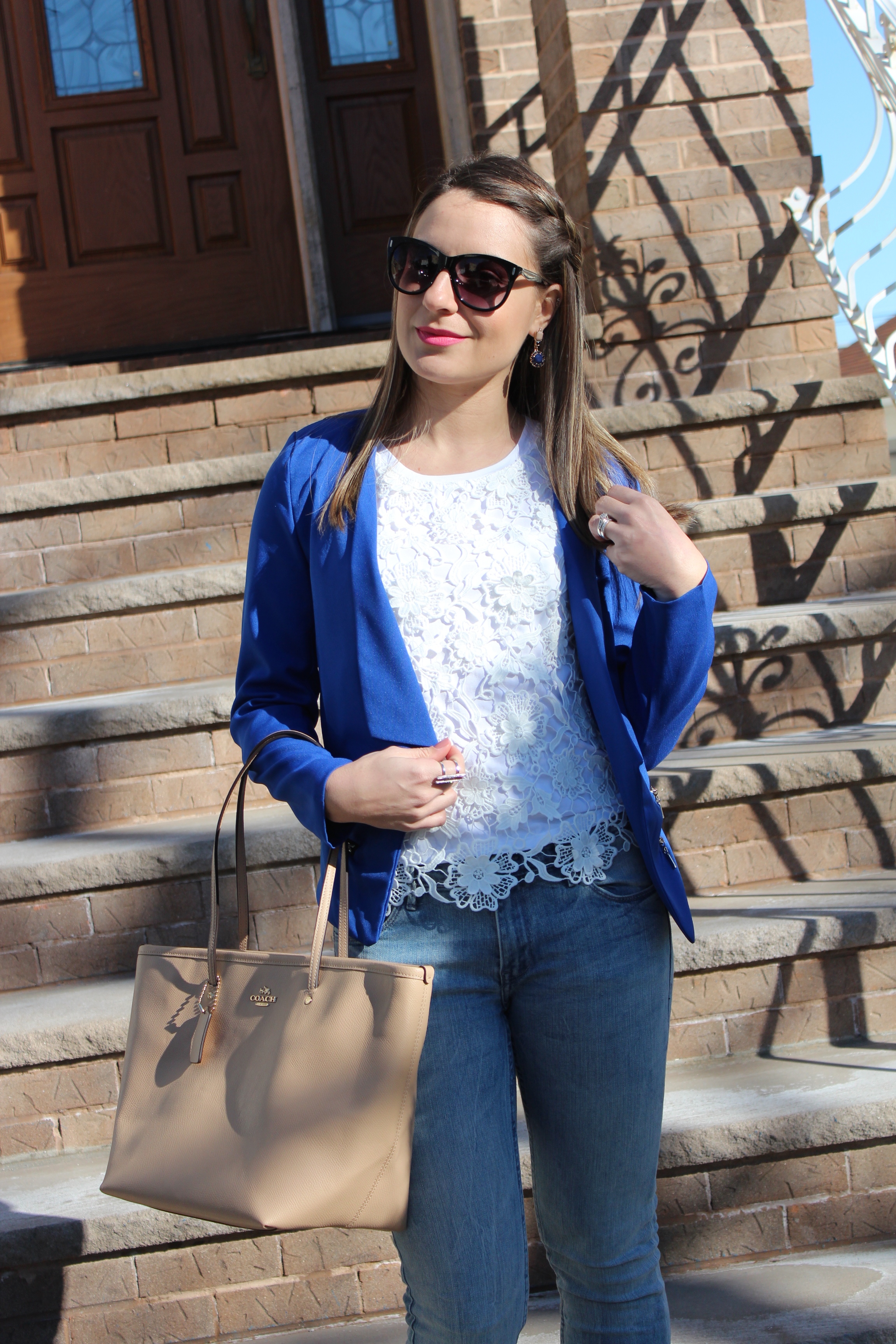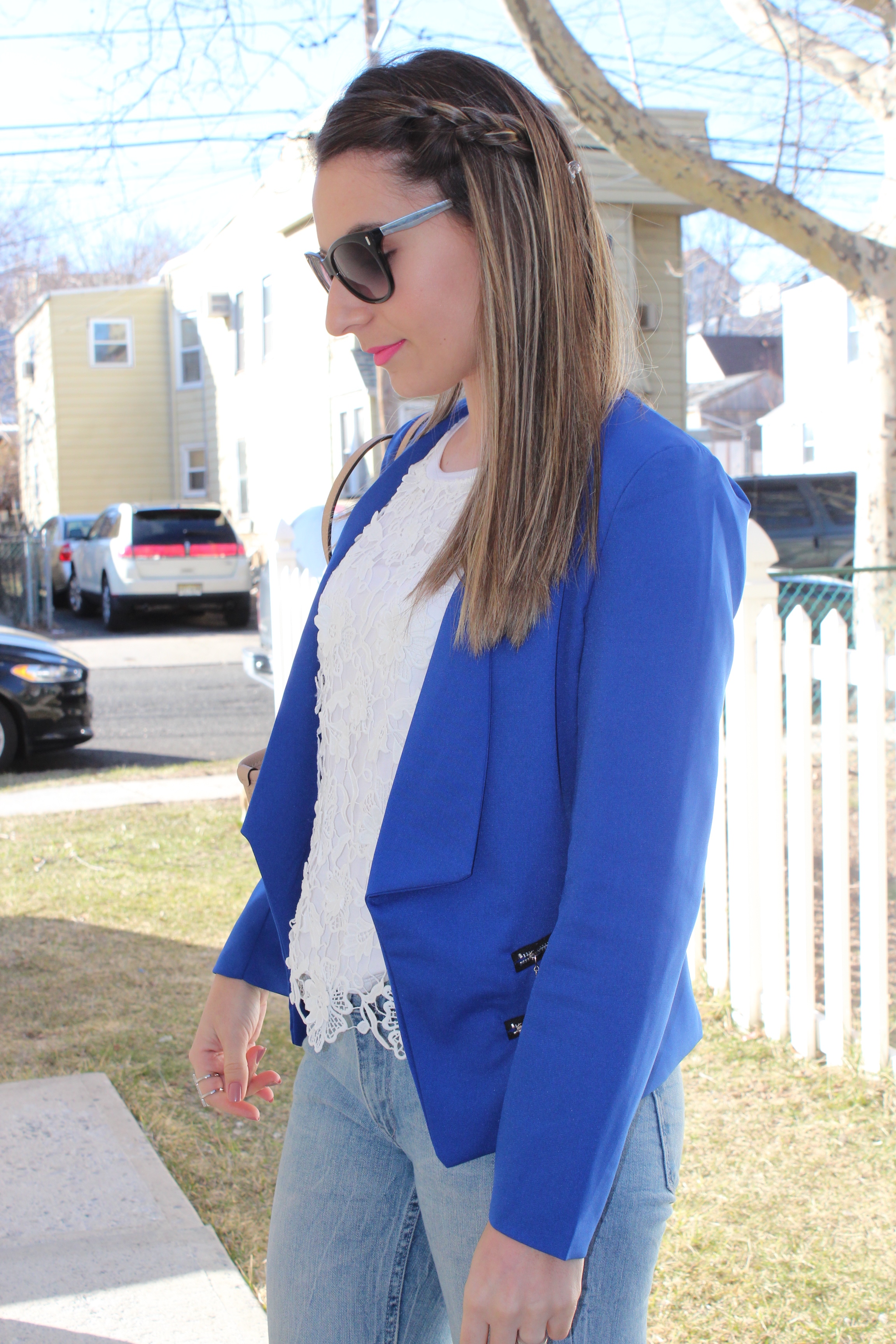 Hoje tem um look bem primavera que usei esse final de semana. Apesar de ainda estar muito frio por aqui, no Domingo abriu um solzinho bem quentinho e aproveite para clicar um look usando esse blazer azul lindo que comprei da SheInside, loja parceira aqui do blog. Antes de firmar parceria com eles, eu sempre comprava acessórios dessa loja e estava muito satisfeita com a qualidade e acabamento dos produtos. Ai ordenei esse blazer para conhecer a qualidade e o estilo das roupas e adorei! Para o look escolhi uma calça jeans de lavagem clara, com uma blusinha branca bordada e finalizei com bolsa e sapato nude. O blazer azul deu vida ao look e ficou super charmoso. Vejam só: