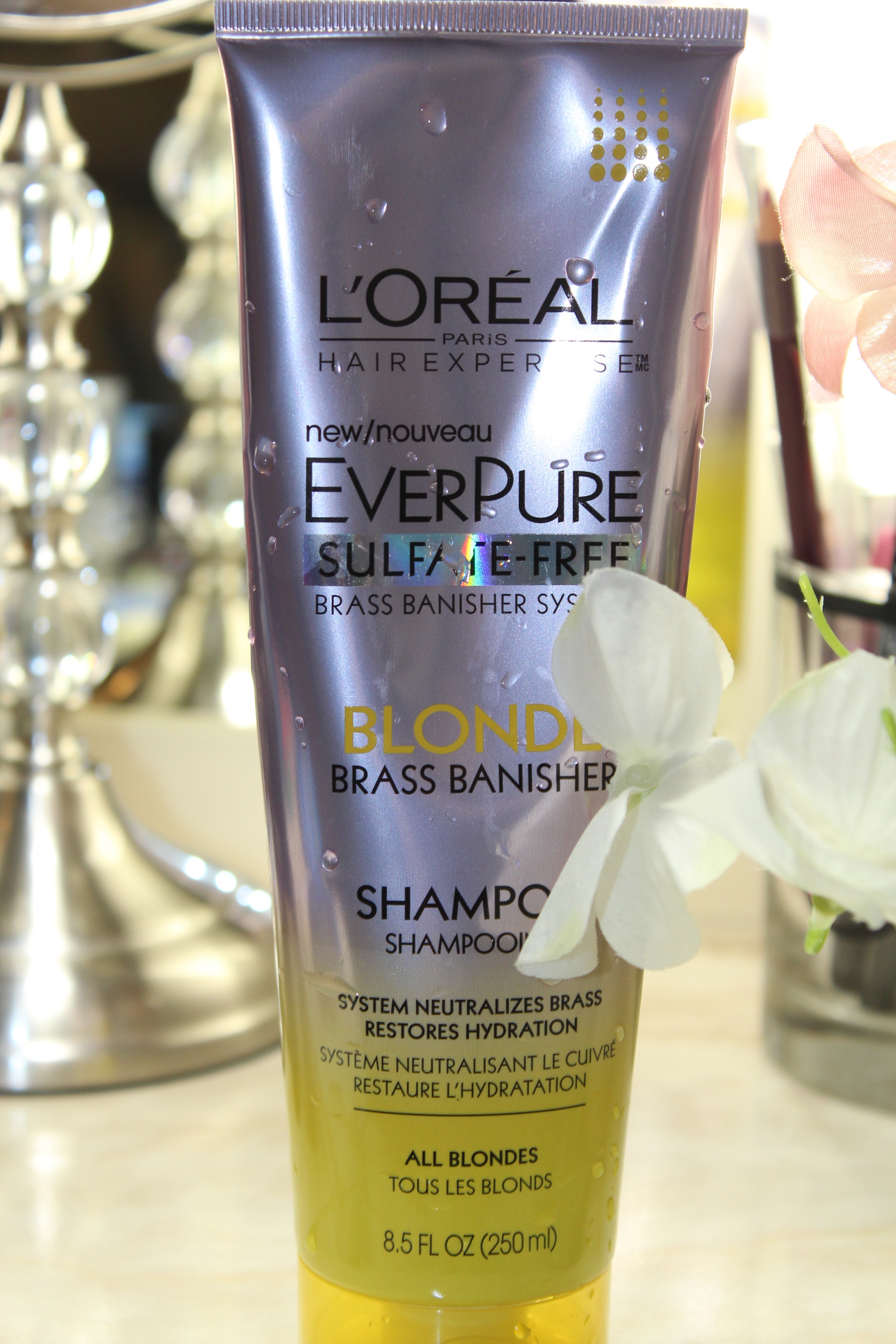 O post de hoje é uma dica para as leitoras loiras e com highlights! Eu tenho usado e testado bastante shampoos para cabelos claros ou com mechas. Meu cabelo esta crescendo e já tem alguns meses que não retoco os highlights, estou dando um tempo na tintura porque resseca muito minhas madeixas. Então, durante esse tempo que fico sem retocar, as mechas loiras tendem a ficar sem vida, muitas vezes sem brilho e com aspecto alaranjado. Por isso estou procurando usar shampoo roxo e produtos que ajudam a reviver a cor. Alem do shampoo da John Frieda que mencionei no meu video de comprinhas de beleza, estou adorando usar o da L’oreal EverPure que promete diminuir o aspecto opaco e alaranjado dos cabelos loiros.