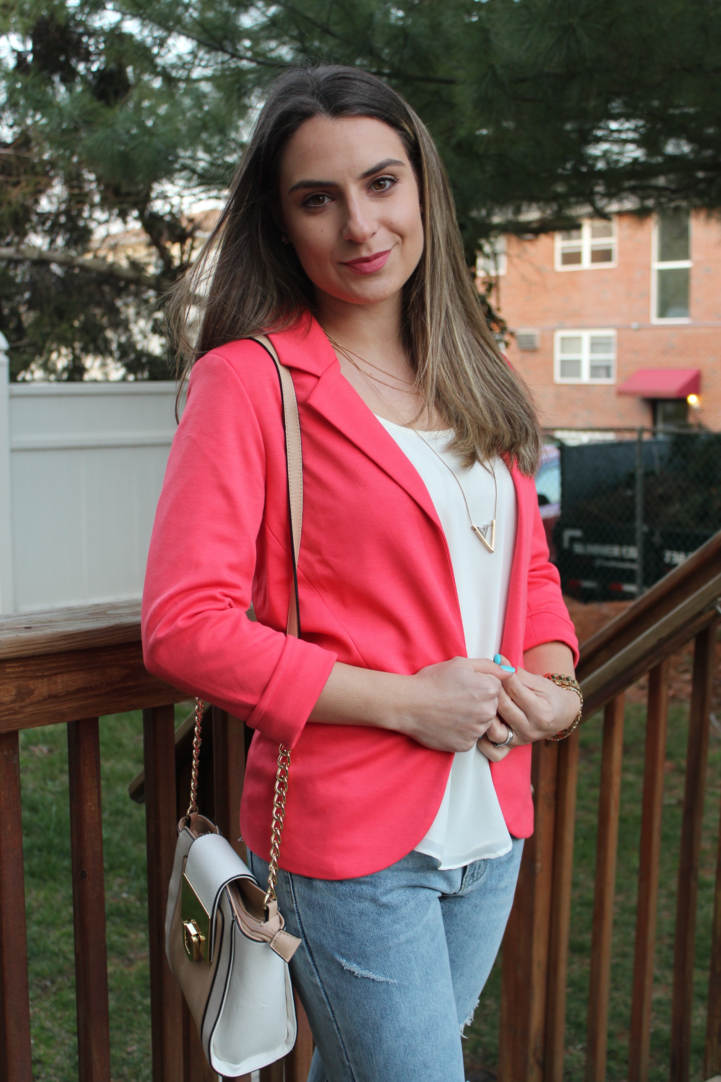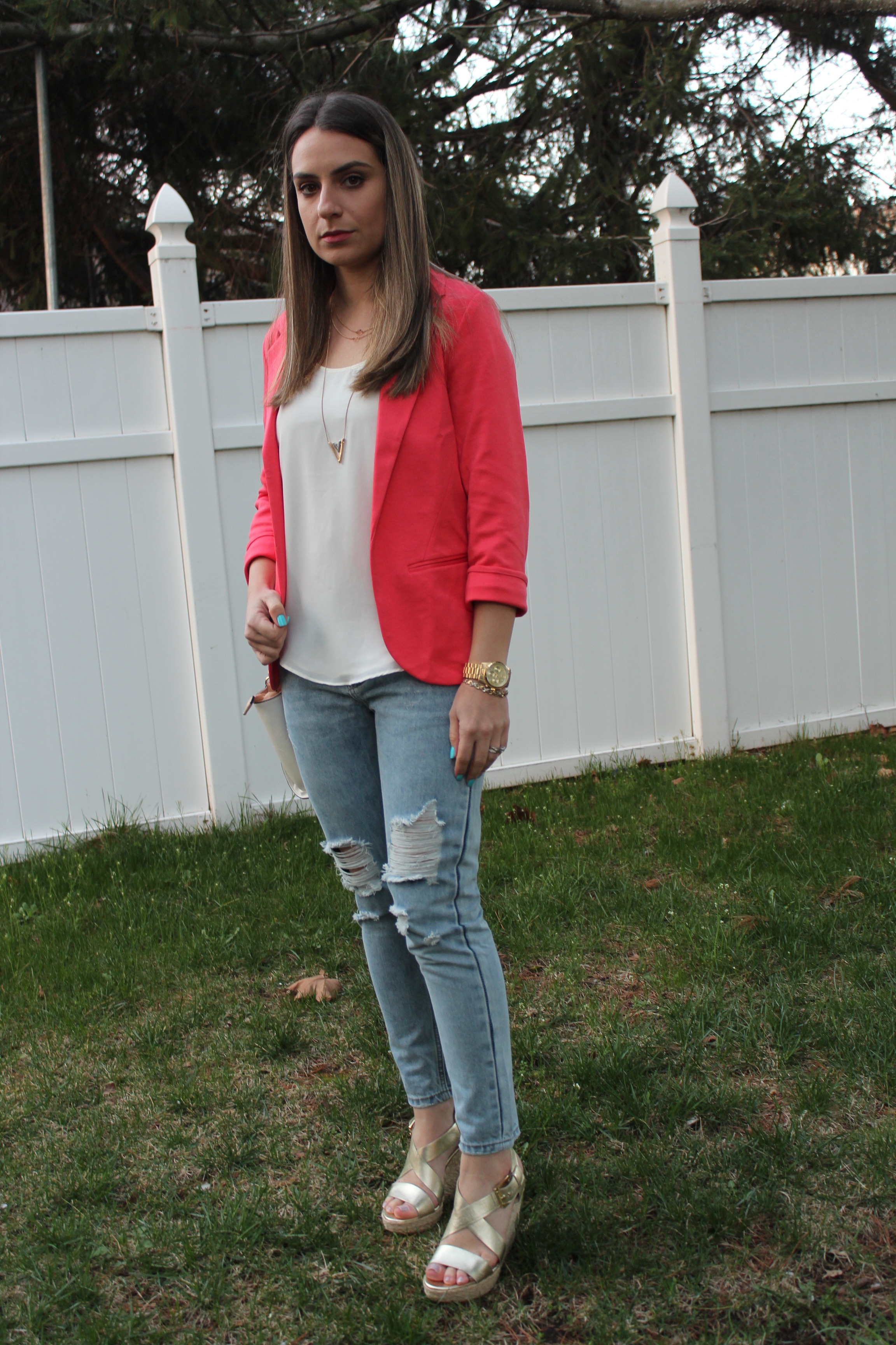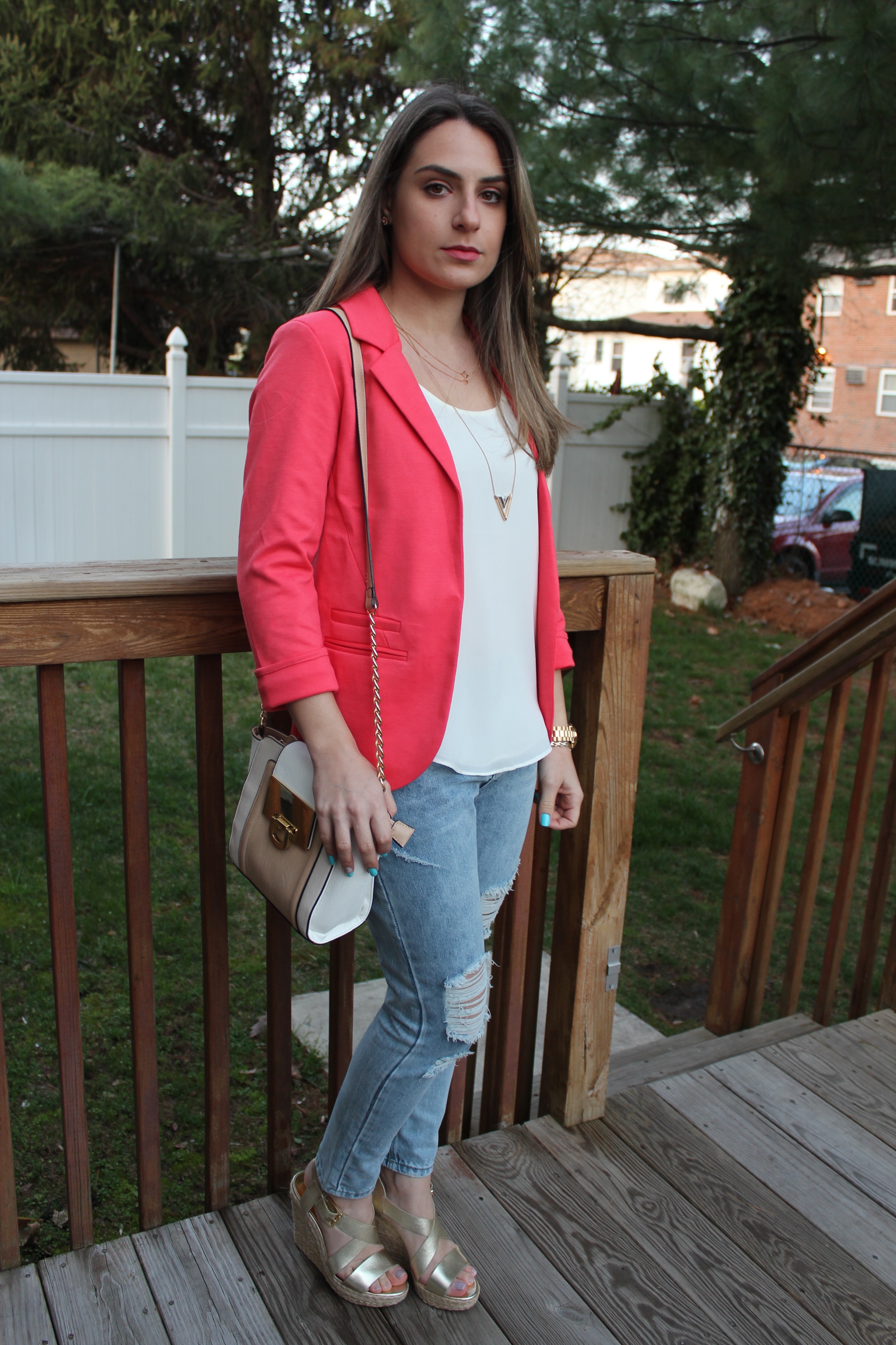 O look de hoje tem um toque de cor especial! Com a temperatura esquentando por aqui, eu começo a me animar e já sinto uma vontade de me jogar em cores mais vivas e vibrantes hehe 🙂 O look de hoje é super casual e bem alegre. A chave principal aqui é o blazer da Sheinside, no estilo boyfriend com um tecido mais grosso em um tom de coral. Como vocês já devem ter percebido, eu amo blazers, acho que deixa qualquer look mais sofisticado! Aqui, coloquei com uma blusinha creme bem leve e uma calça jeans rasgada. Para os acessórios escolhi os tons de dourado que estão super em alta. A sandália plataforma alongou minha silhueta e deu um toque a mais a esse look despojado. Confiram: