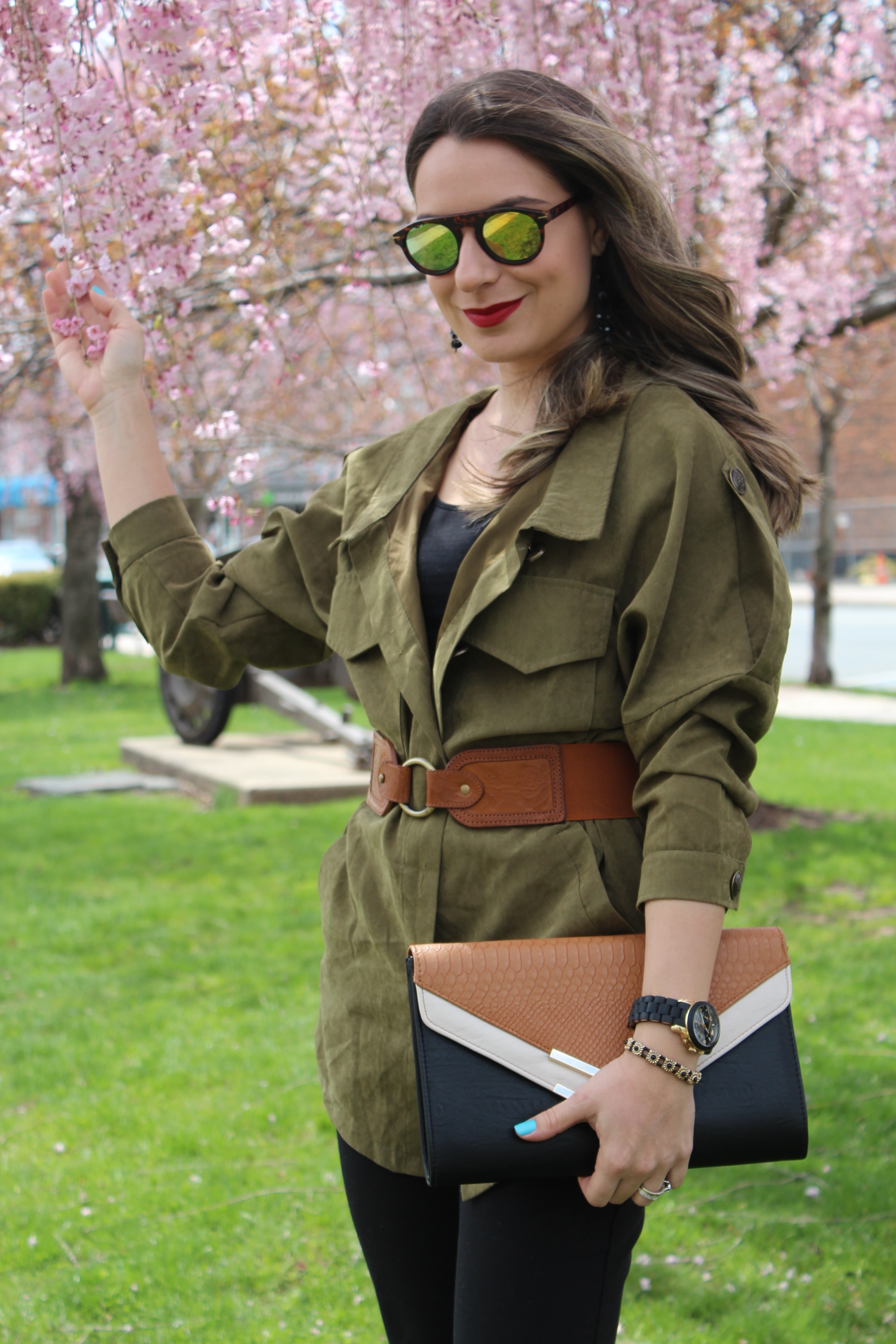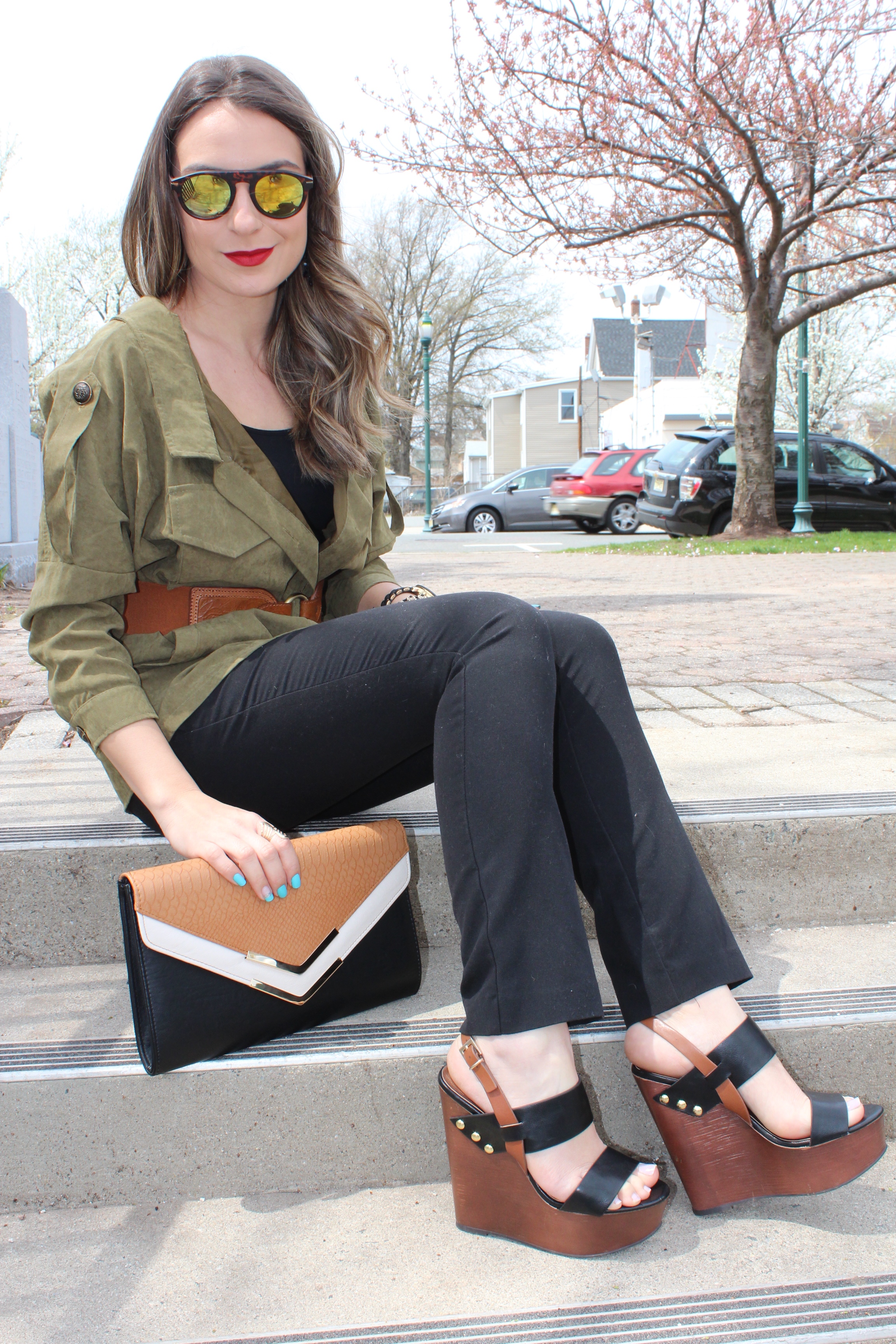 O look de hoje é voltado a uma tendência que é a influencia militar. Essa tendência esteve presente no ultimo inverno e agora volta com força, principalmente no street style. Então aproveitando que ainda não esquentou totalmente por aqui, montei um look super street chic usando uma jaqueta militar verde em tecido leve de camurça. Essa jaqueta é bem larguinha, então, para deixar o look mais sofisticado, combinei uma calca preta social mais colada no corpo junto com uma t-shirt preta também mais justinha. Finalizei com um salto plataforma multicolor e um cinto mais largo para dar forma ao casaco despojado. O truque para se jogar no militarismo de uma forma mais feminina e delicada, é optar por um item verde militar e compor um look mais neutro e discreto. Vejam como ficou minha produção:
