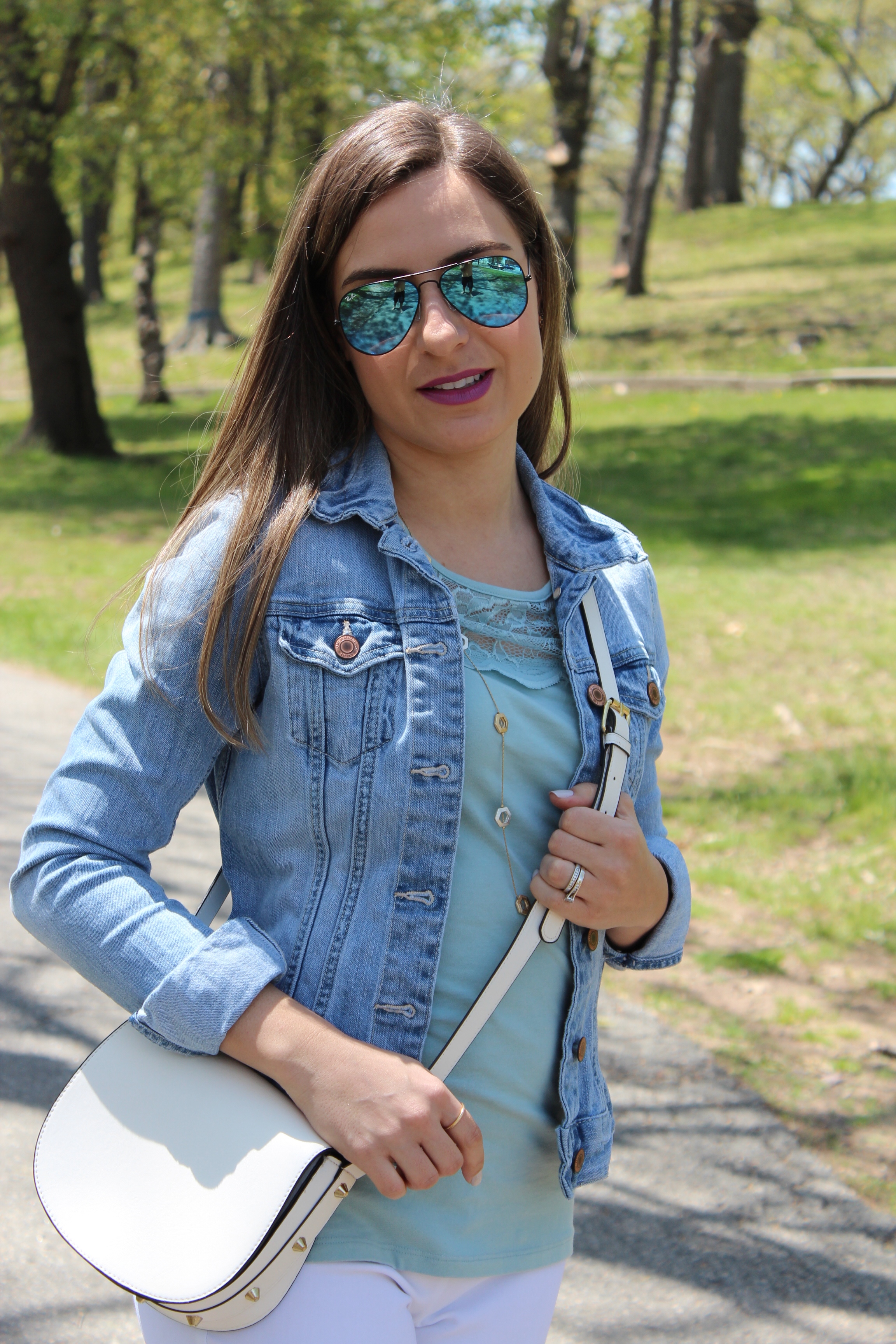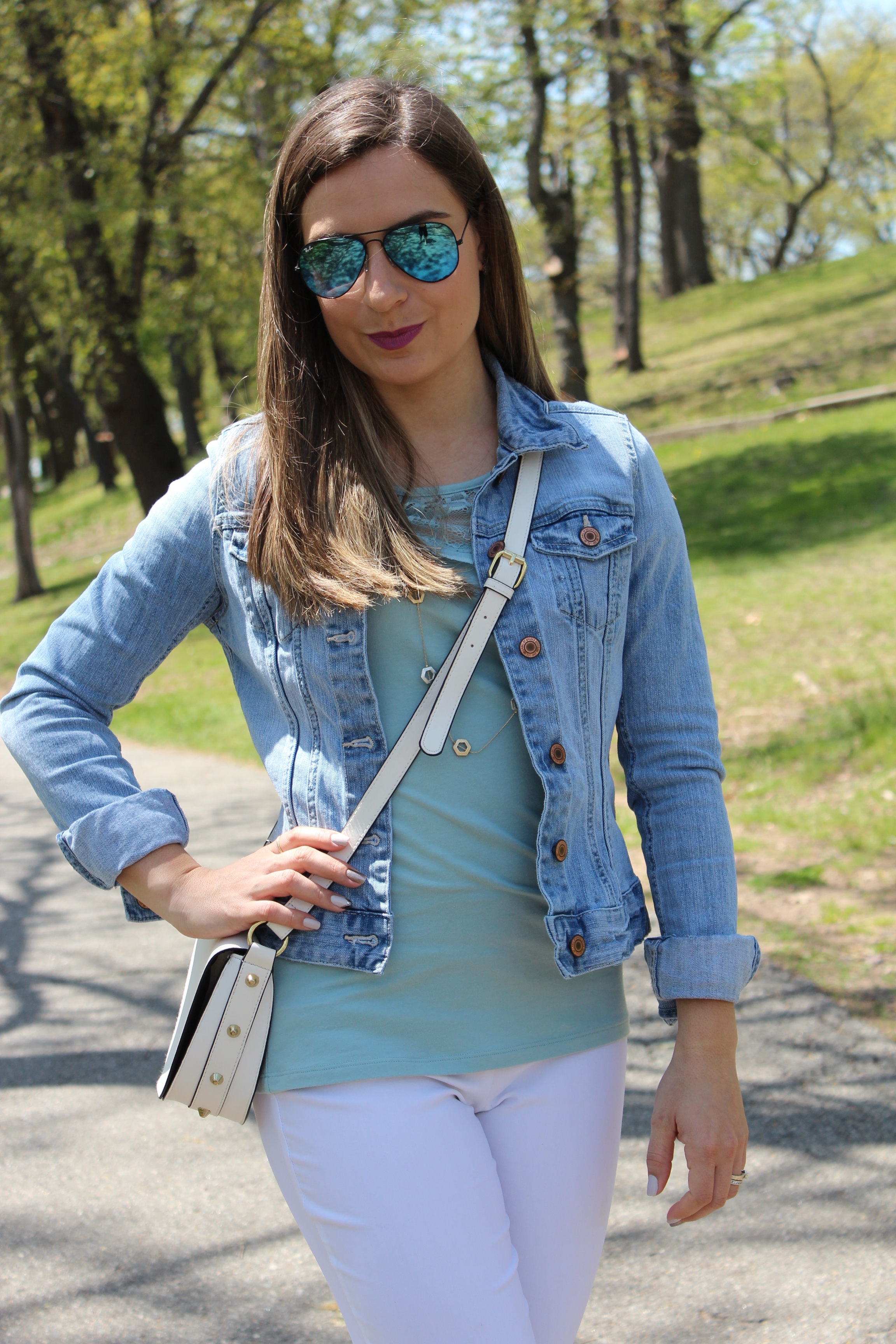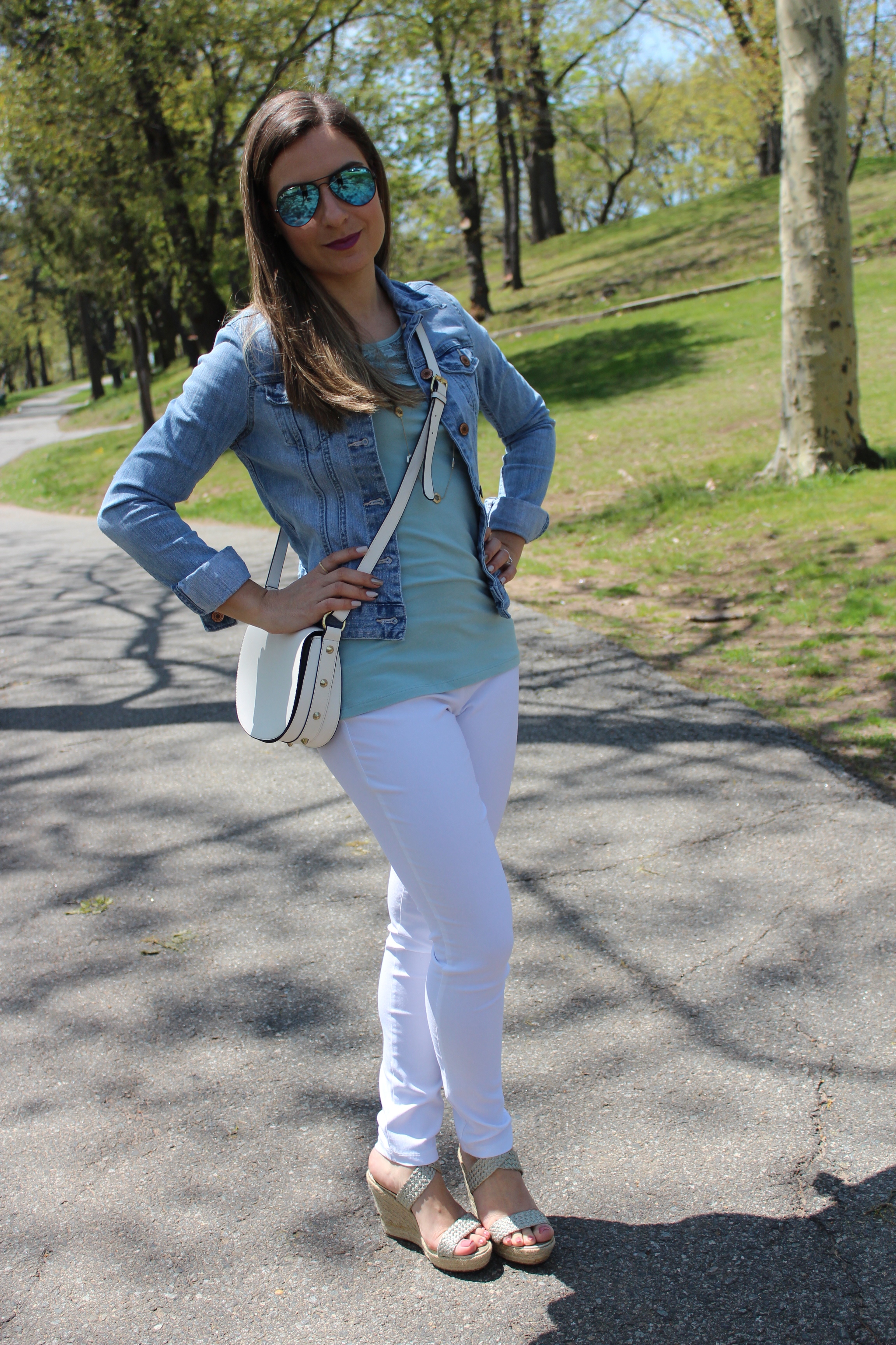 Tudo bem pessoal? Como foi o final de semana de vocês? Espero que tenham aproveitado bastante o feriadão ai! Aqui não teve feriado mas tivemos um final de semana bem relax. No domingo escolhi uma produção bem leve, a cara da primavera, usando uma combinação que eu amo: calça branca com jaqueta jeans. Quem ai também adora esse combo? Acho que fica super casual e combina com salto, rasteira, sapatilha e é um look perfeito para o dia a dia. Nessa produção eu adicionei uma camiseta com detalhe em renda na cor azul meio esverdeado pastel, outra tendência que estou amando. Os tons pasteis estão super em alta e eu adoro montar looks com essas cores. Finalizei com uma sandália anabela dourada com salto de corda super confortável e uma bolsinha branca também com detalhes de tachas dourada. Vejam como ficou essa produção super fácil de montar: