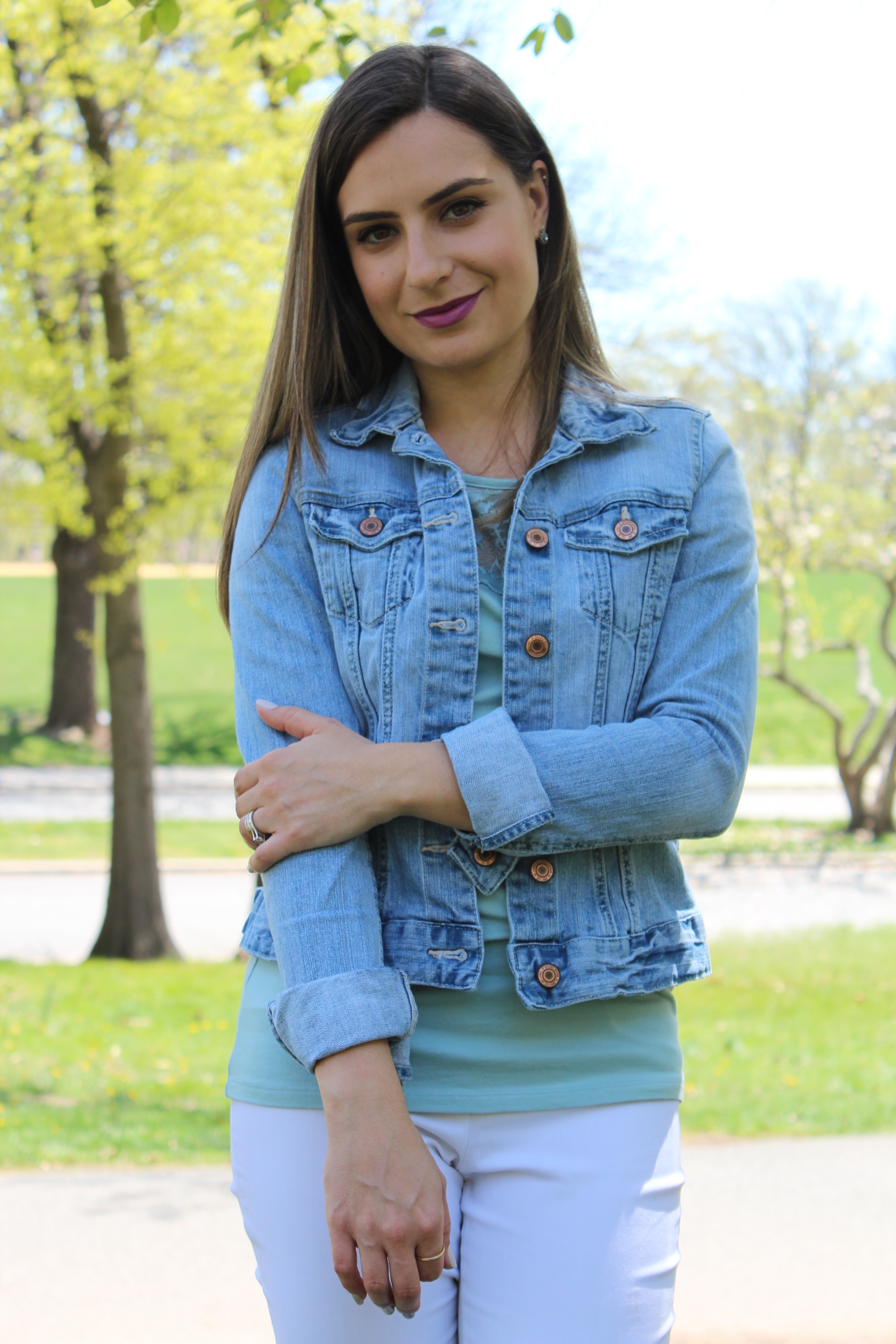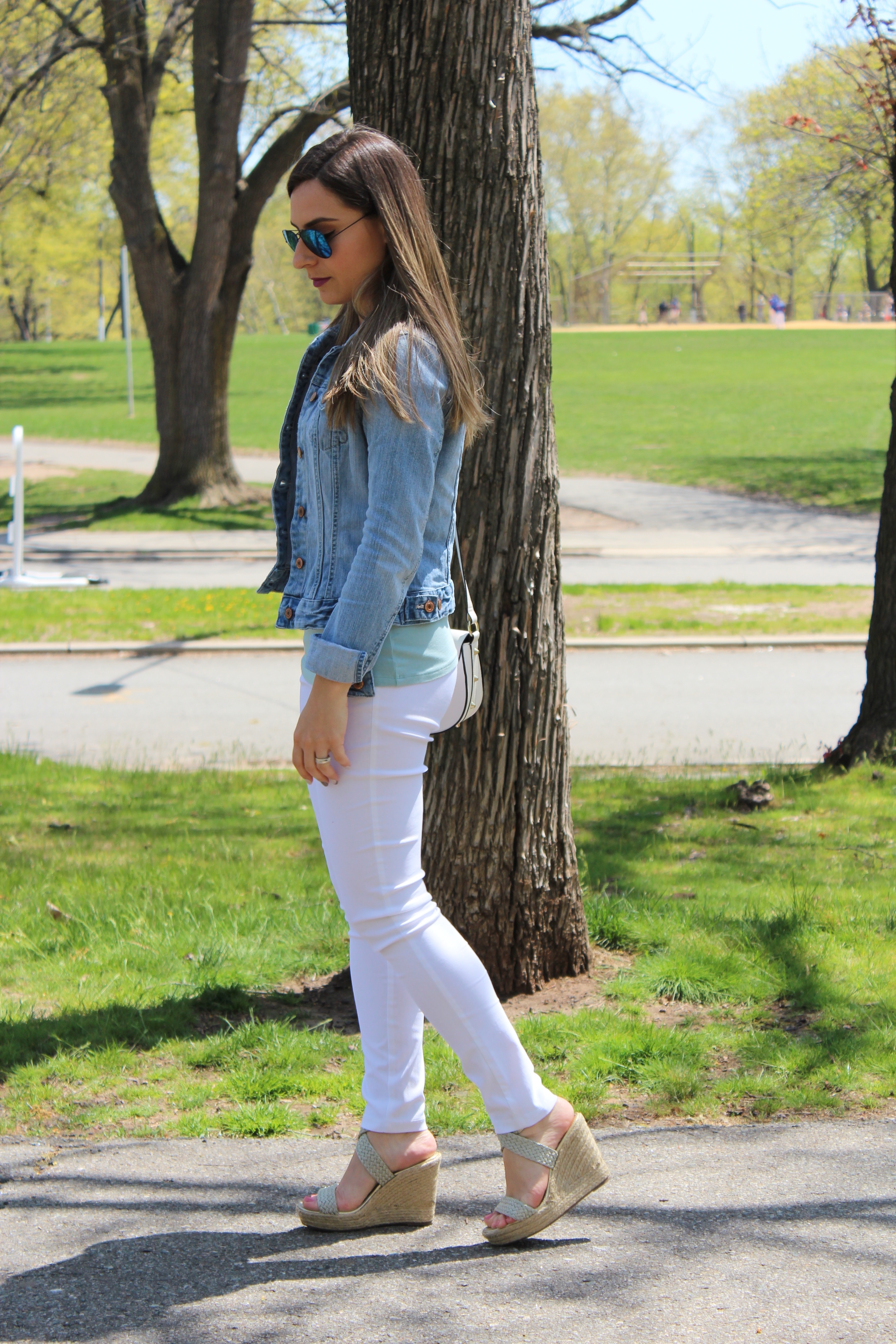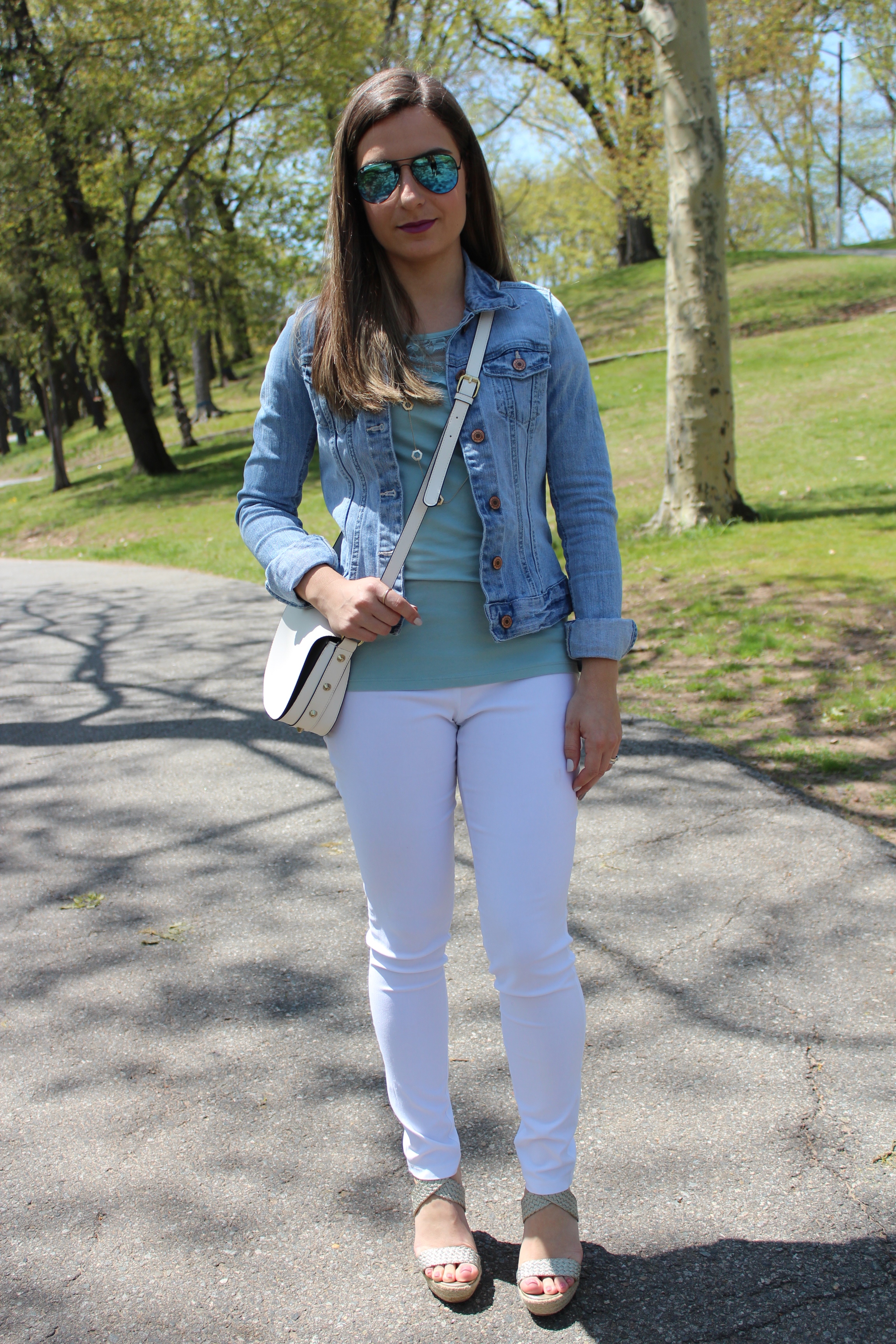 Tudo bem pessoal? Como foi o final de semana de vocês? Espero que tenham aproveitado bastante o feriadão ai! Aqui não teve feriado mas tivemos um final de semana bem relax. No domingo escolhi uma produção bem leve, a cara da primavera, usando uma combinação que eu amo: calça branca com jaqueta jeans. Quem ai também adora esse combo? Acho que fica super casual e combina com salto, rasteira, sapatilha e é um look perfeito para o dia a dia. Nessa produção eu adicionei uma camiseta com detalhe em renda na cor azul meio esverdeado pastel, outra tendência que estou amando. Os tons pasteis estão super em alta e eu adoro montar looks com essas cores. Finalizei com uma sandália anabela dourada com salto de corda super confortável e uma bolsinha branca também com detalhes de tachas dourada. Vejam como ficou essa produção super fácil de montar: