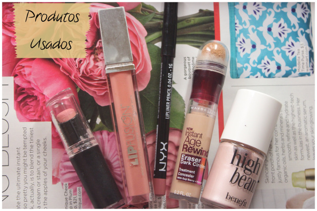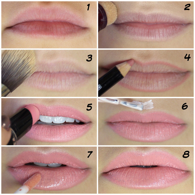 Primeiro apliquei um corretivo ao redor da boca inteira e espalhei com um pincel de base passando inclusive em cima dos lábios (truque para você ver realmente a cor do batom e não misturar com a cor natural dos seu lábios). Em seguida, contornei todo o lábio com um lápis mais ou menos da cor do batom, traçando um pouco mais afora da linha para dar mais volume. Depois passei o batom distribuindo bem todo o lábio. Para destacar mais a parte superior dos lábios, apliquei duas gotinhas de iluminador e espalhei com os dedos mesmo. Por ultimo, apliquei gloss de uma cor semelhante ao batom somente no meio do lábio para dar a impressão que os lábios são mais carnudos.