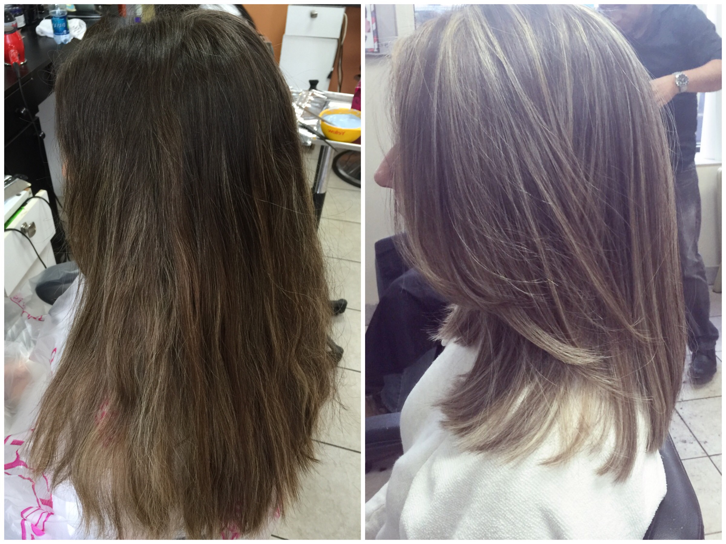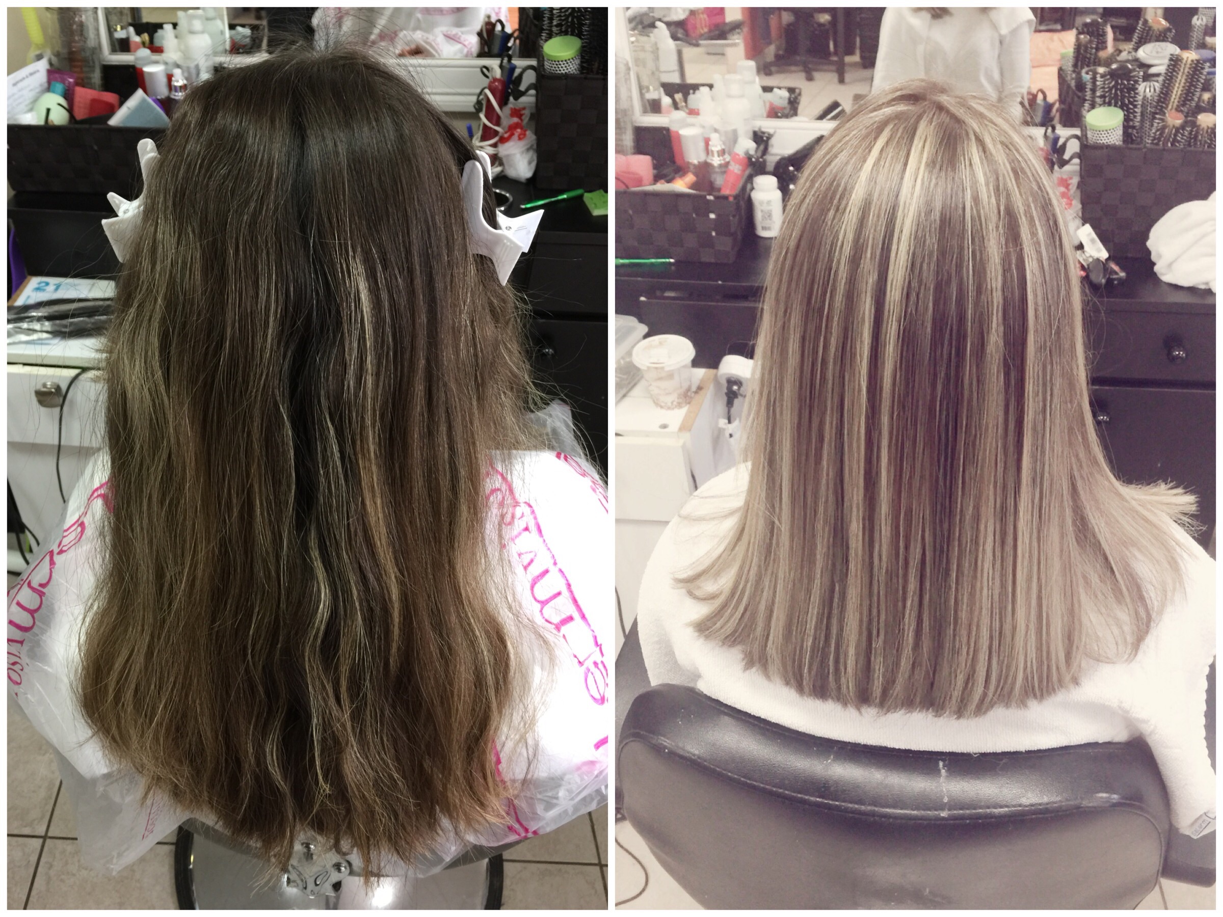 O corte foi totalmente reto com um pouco de desfiado (layers) nas pontas para dar movimento e controlar o volume. O comprimento ficou um dedo abaixo do ombro. Minha franja esta em fase de crescimento, então só aparamos as pontas.Os highlights foi puxado para o loiro champanhe usando de base minha cor natural mesmo que é um loiro escuro. Vejam como estava e como ficou: