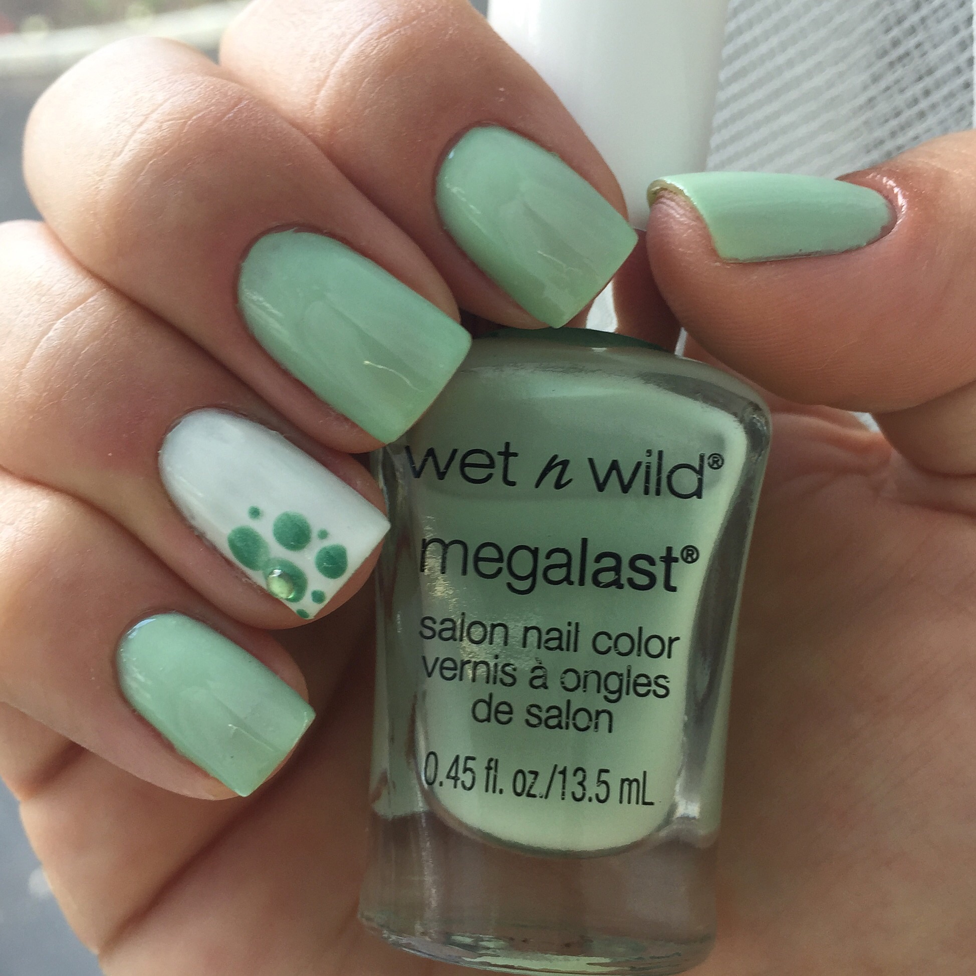 A cor é a Tree Hunger da marca Wet & Wild. Passei duas camadas e fiz uma filha única na unha do anelar. Passei esmalte branco e fiz umas bolinhas com a ponta de um grampo usando um esmalte verde mais escuro. E finalizei com uma pedrinha verde em cima de uma das bolinhas.