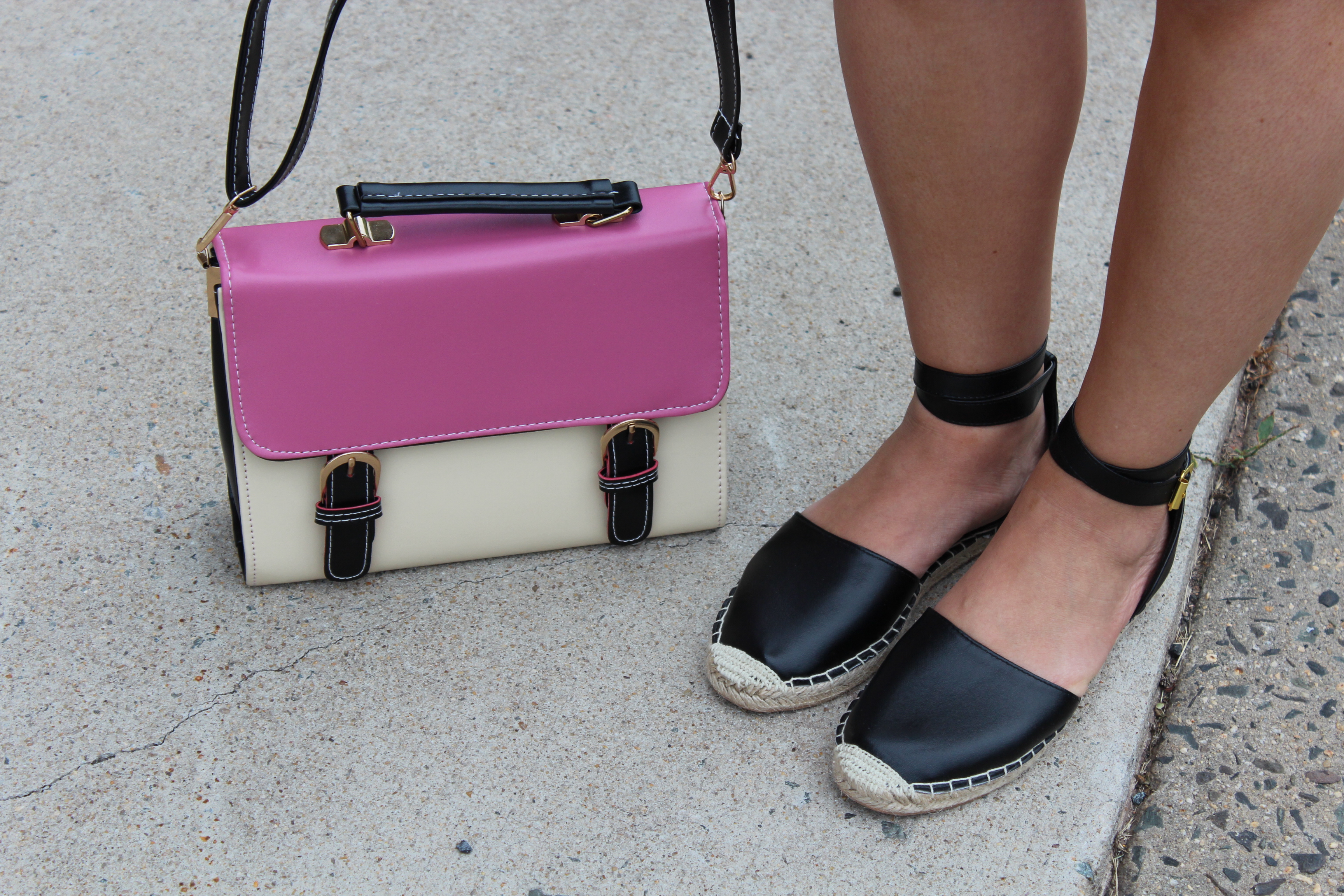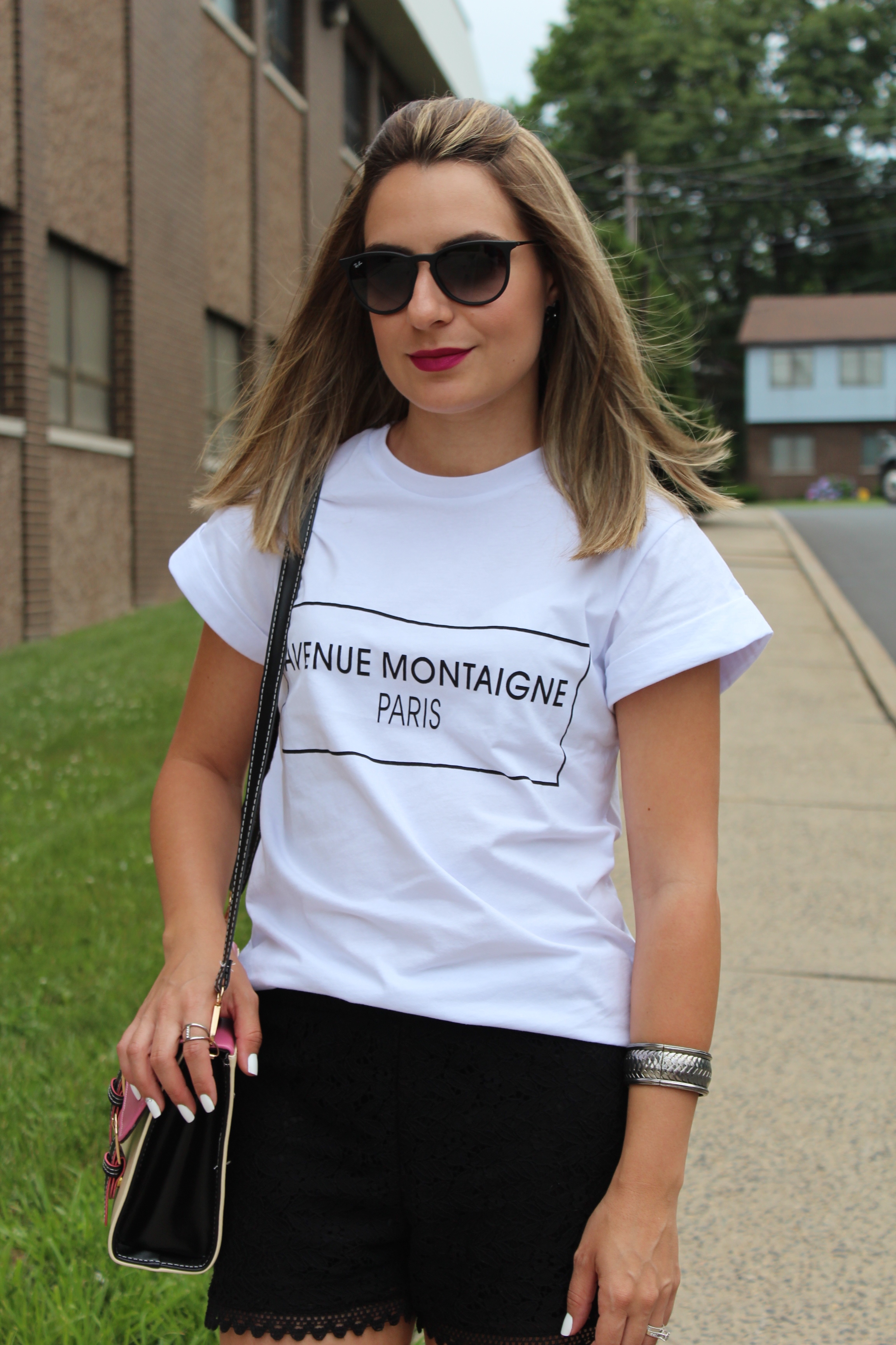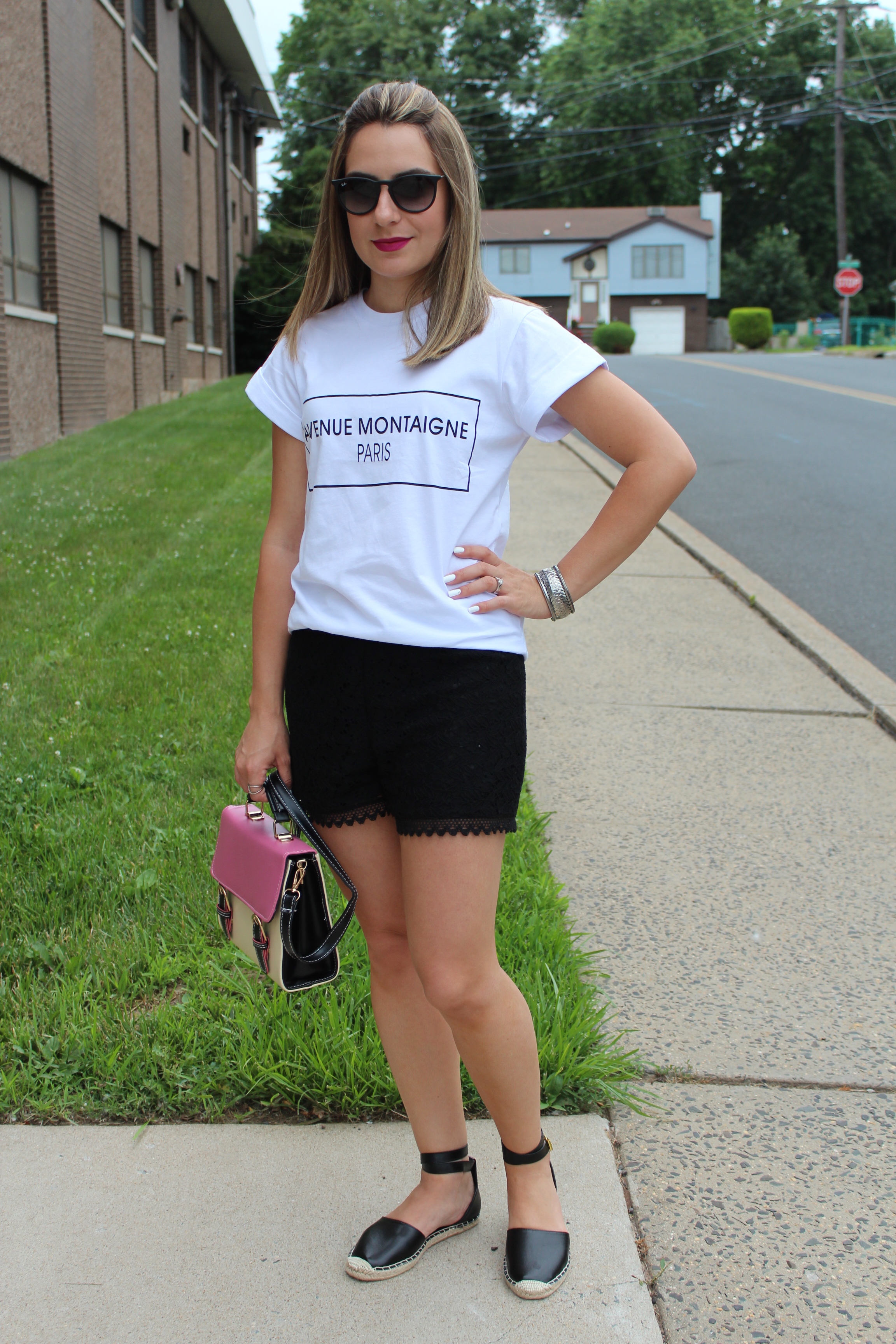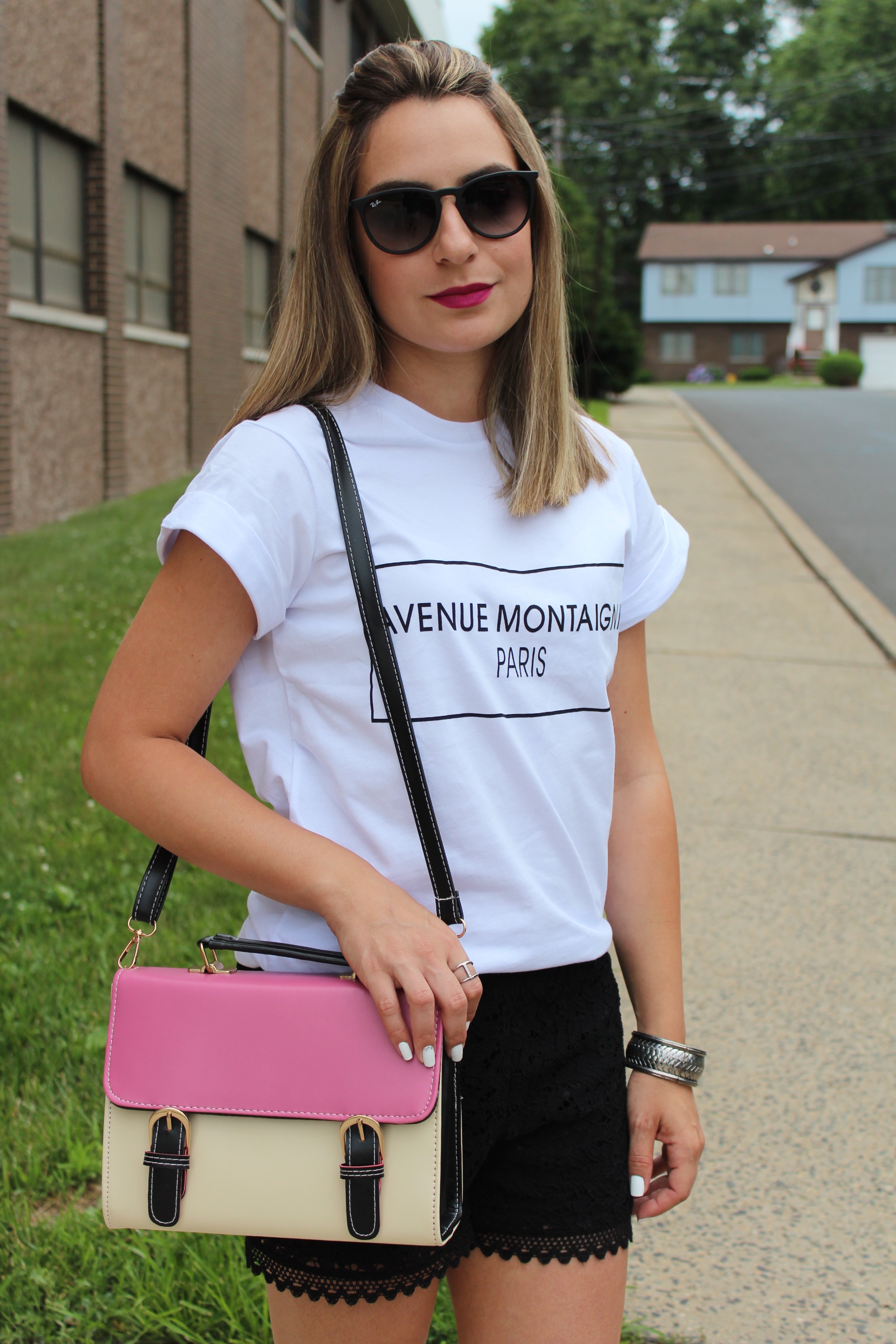 E hoje tem mais um look para mostrar para vocês! Essa semana rendeu vários cliques, entao aproveitei para deixar o blog cheio de looks para inspirar minhas leitoras, afinal não é sempre que sobra tempo e que o marido esta disponível para fotografar. Esse look foi o escolhido de ontem. Mais um look super simples, mas com muito estilo. Adoro produções assim para o dia a dia. Combinei uma T-shirt gráfica linda da CNDirect com shortinhos de renda e flats estilo espadrille. Para quebrar o P&B do look, usei uma bolsinha super fofa com modelo quadradinho color block em uma mistura de preto, rosa e creme também da CNDirect. Recebi a camiseta e a bolsa no correio essa semana e fiquei impressionada com a qualidade. Muito boa mesmo! A CNDirect é baseada na China e tem roupas e acessórios lindos por um preço super camarada. A bolsinha mais a camiseta deu menos de US$15!!!