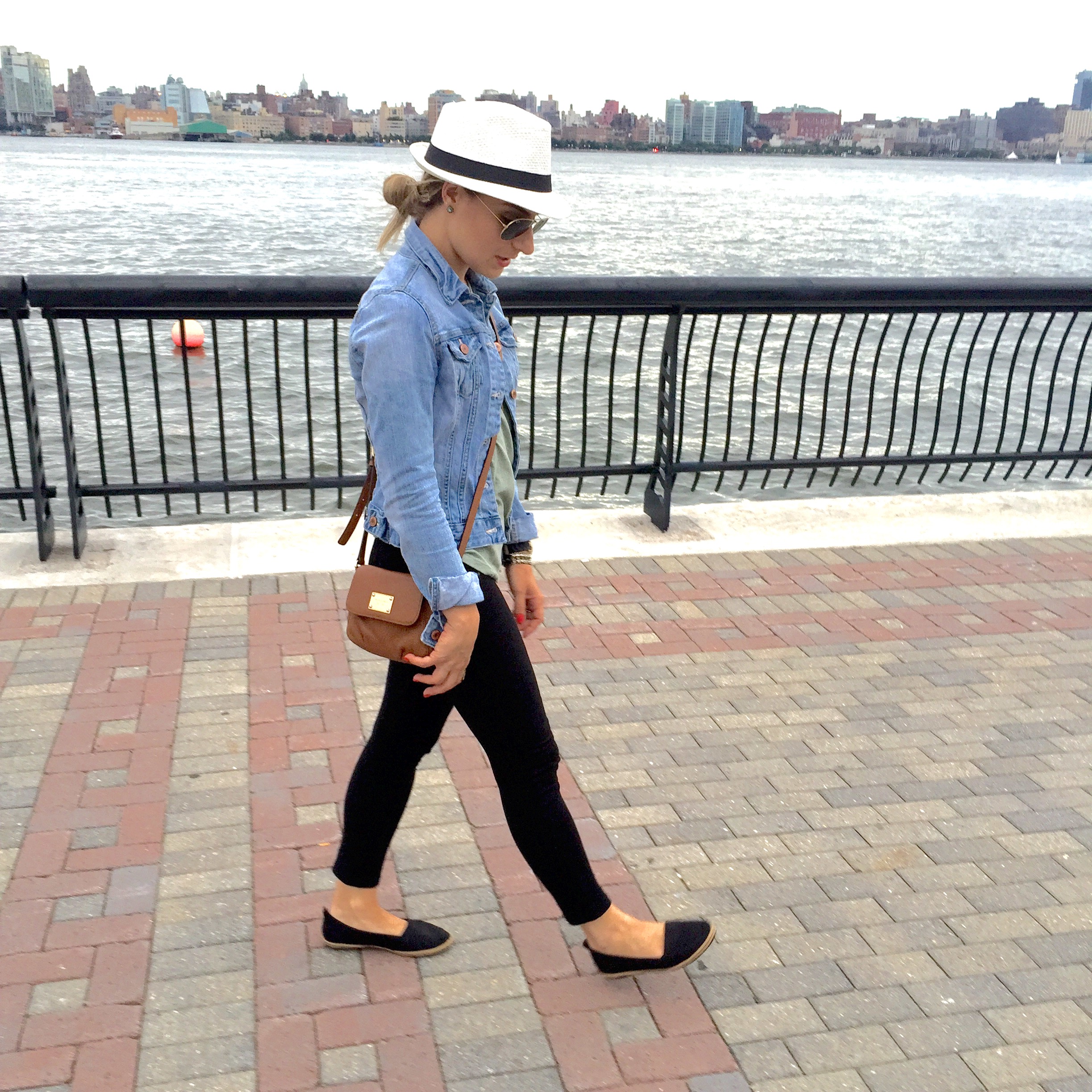 Meu look foi intencional para um almoço com a família e acabou sendo perfeito para um passeio a beira do rio Hudson. Coloquei uma legging preta bem confortável, com uma camiseta verde militar em um tecido bem fininho. Finalizei o look com uma jaquetinha jeans, pois estava uma temperatura mais gelada. Nos pés usei uma sapatilha espadrille preta e na cabeça um chapeuzinho fedora para deixar o look mais despojado.
