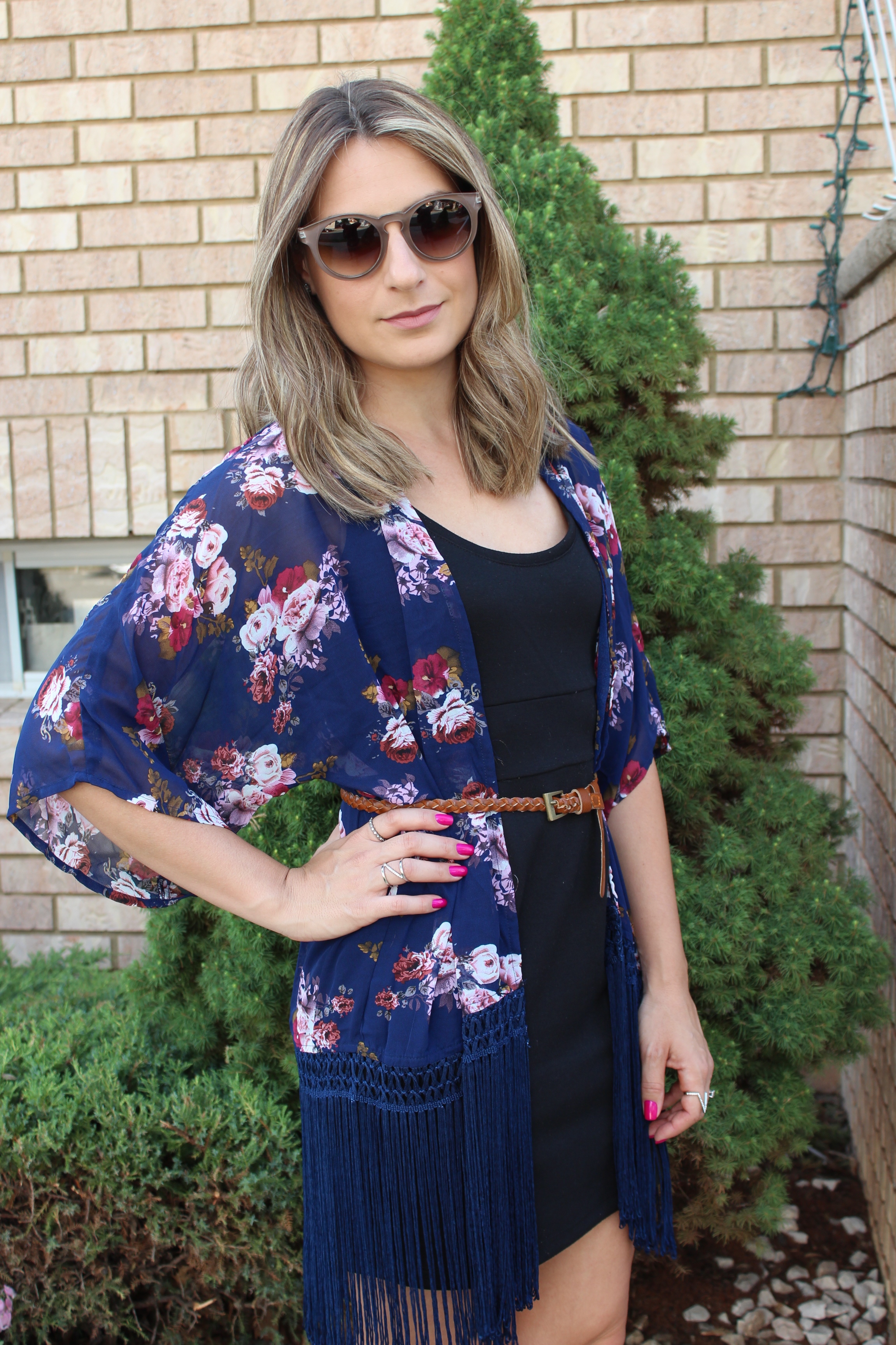 E o ultimo look é bem clássico: usando o nosso querido vestidinho preto! Escolhi um vestido preto de malha e coloquei um cinto bem fininho por cima do kimono para dar um charme e deixar o look em harmonia. Finalizei com sandália de salto baixo estilo gladiadora. O look ficou super romântico e feminino!