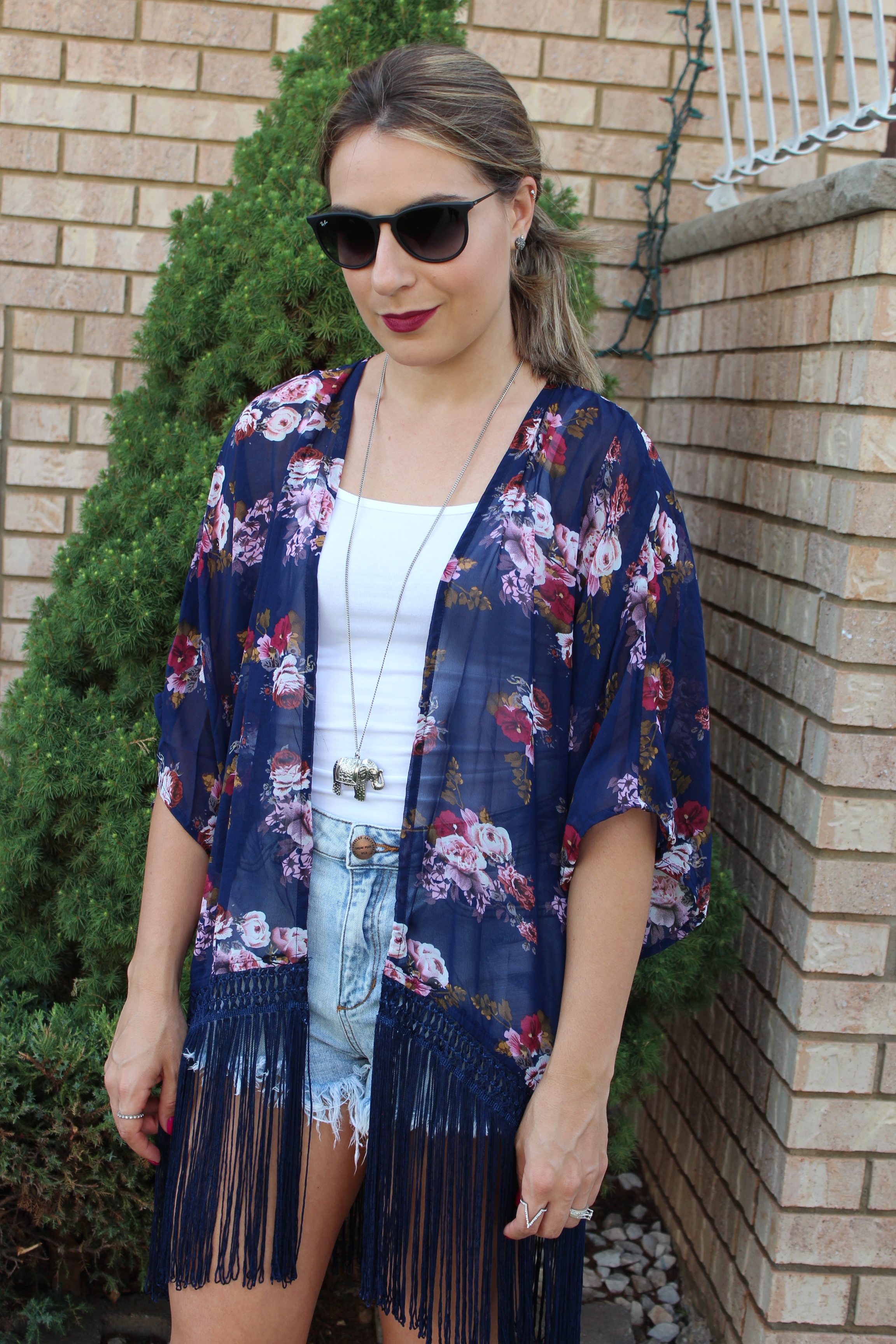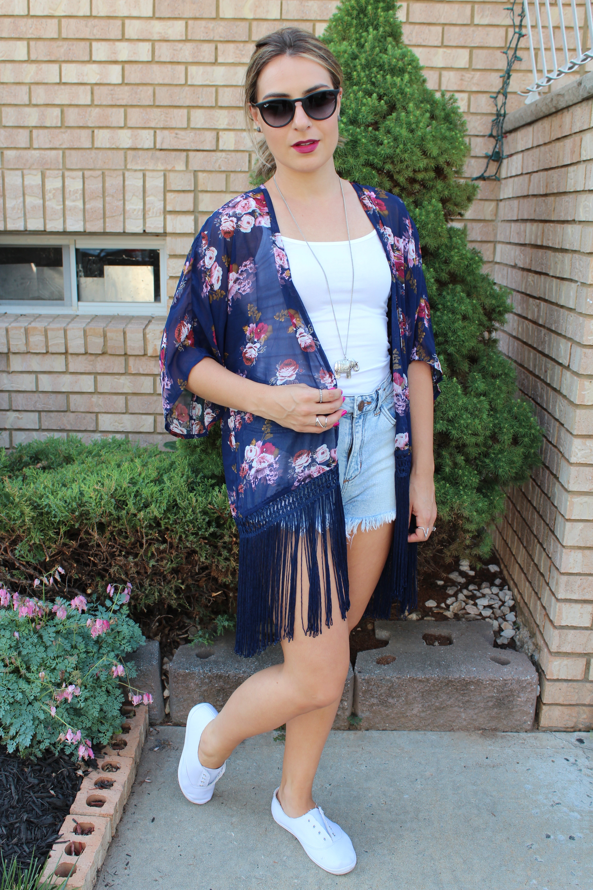 Um jeito bem fácil de usar um kimono, é optar por um look bem básico. O jeans (calça, shorts ou saia) é uma peça que fica linda com kimono. Como estamos em pleno verão aqui, escolhi um shorts jeans e completei o look com uma blusinha branca e tênis. Esse look ficou super despojado e básico e o kimono foi a peça principal da produção!