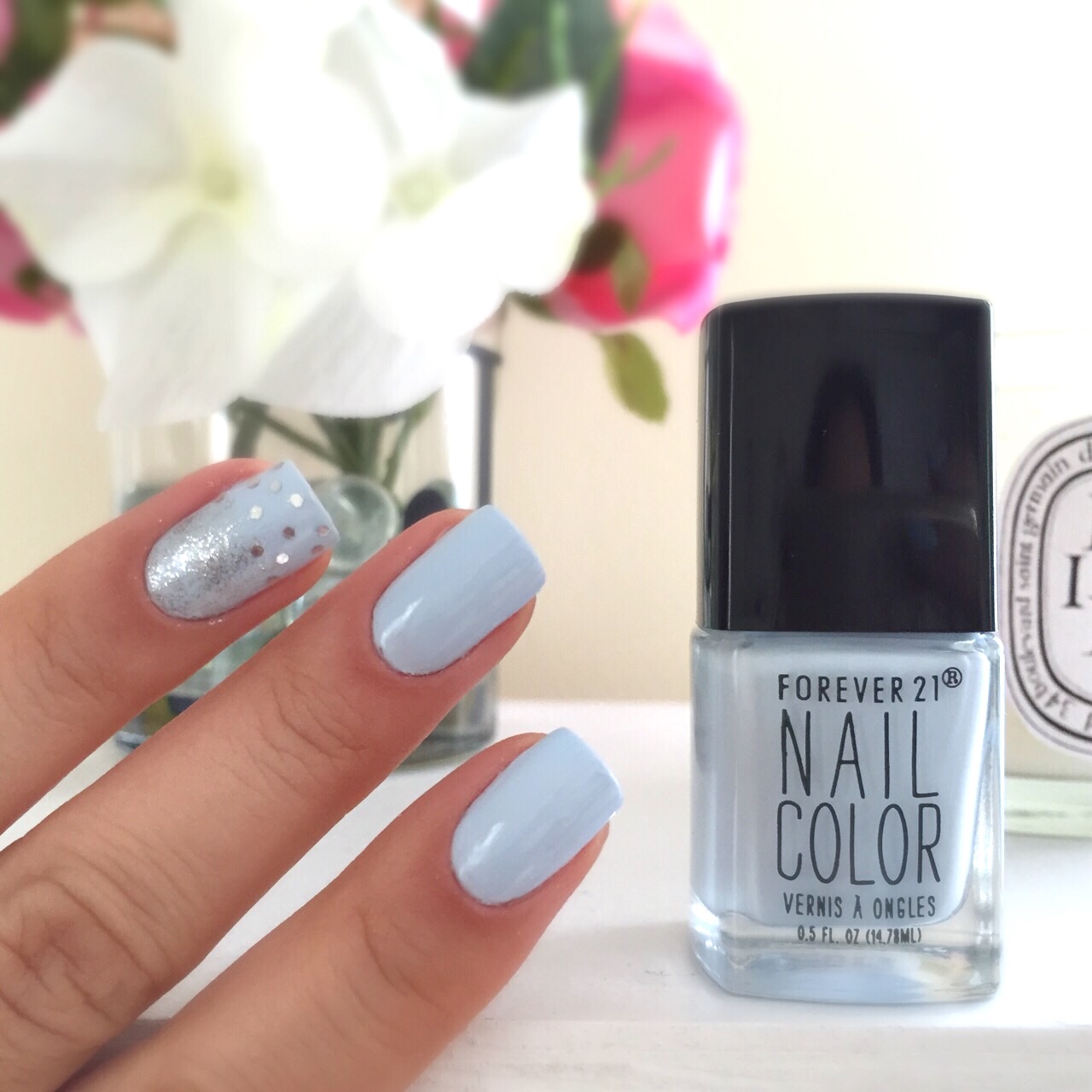 Hoje vim mostrar meu esmalte que usei na semana passada. Escolhi um azul bebe bem clarinho na cor Baby Blue da Forever 21. Eu adoro esmalte azul e ainda não tinha usado nenhum nessa tonalidade mais clara. Os esmaltes em tons pasteis estão super em alta agora no verão e deixam as unhas super delicadas. Para adicionar um charme, passei glitter prateado na unha do anelar e finalizei com partículas maiores do glitter nas pontas da unha. Vejam como ficou: