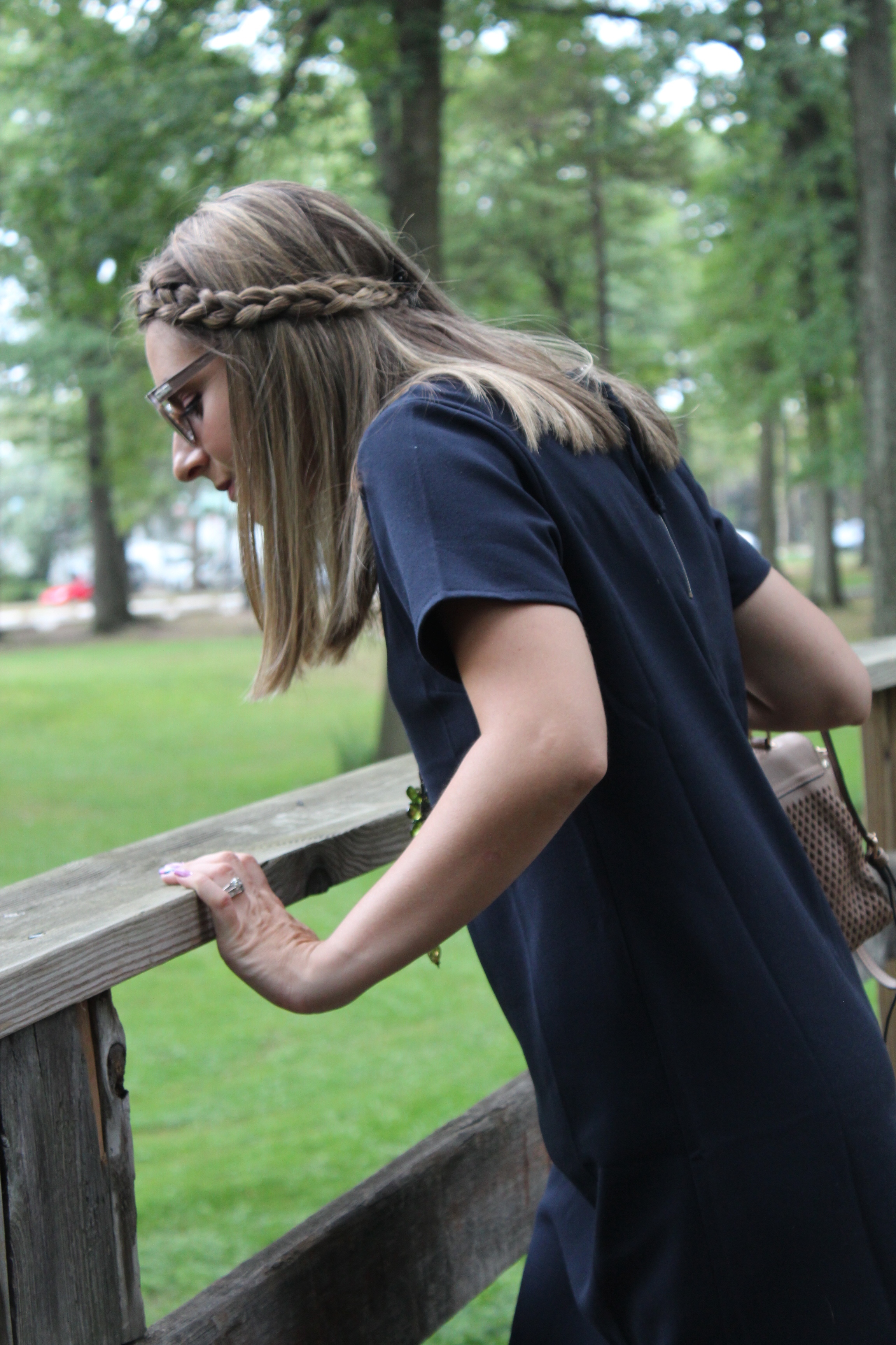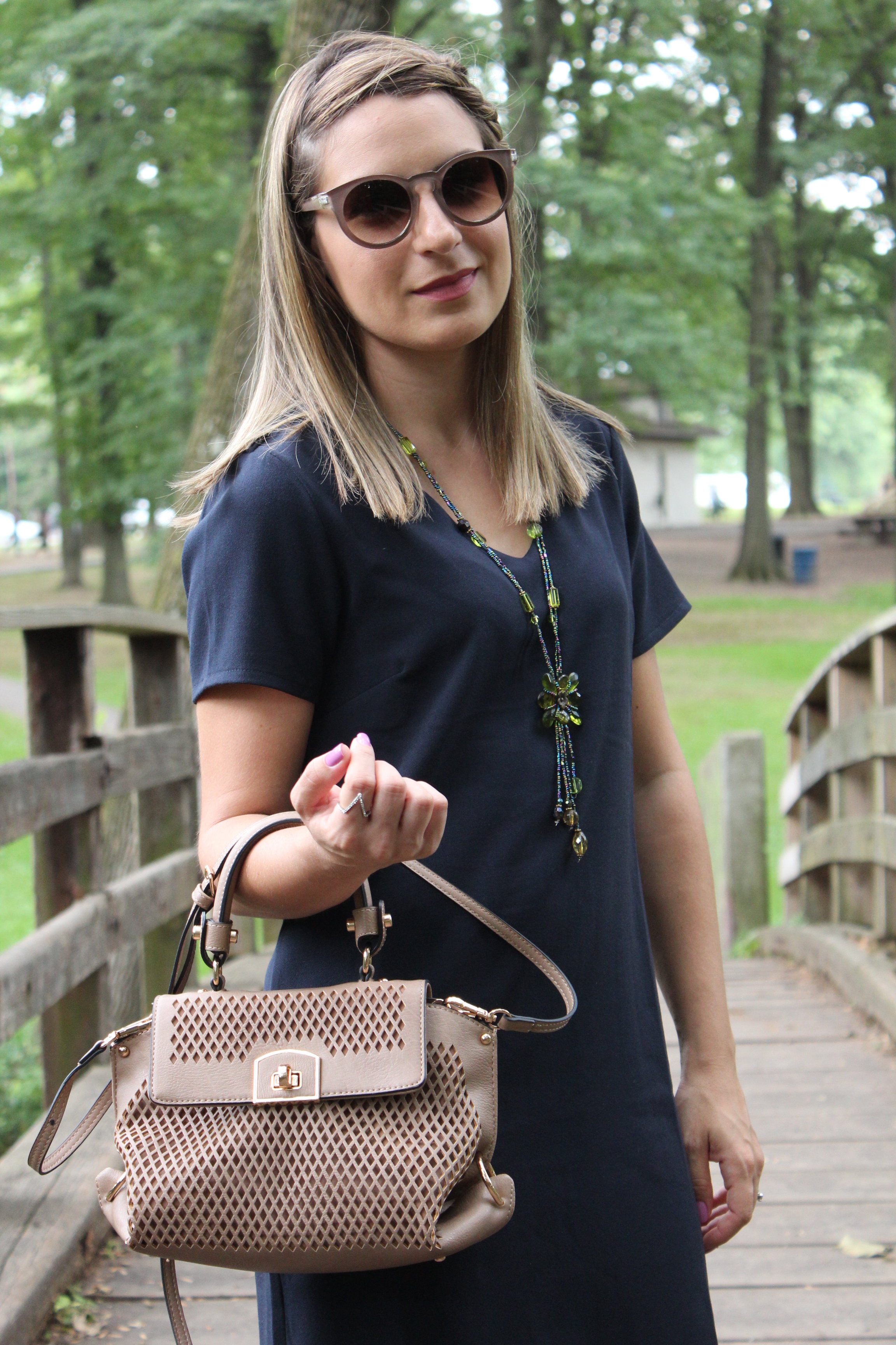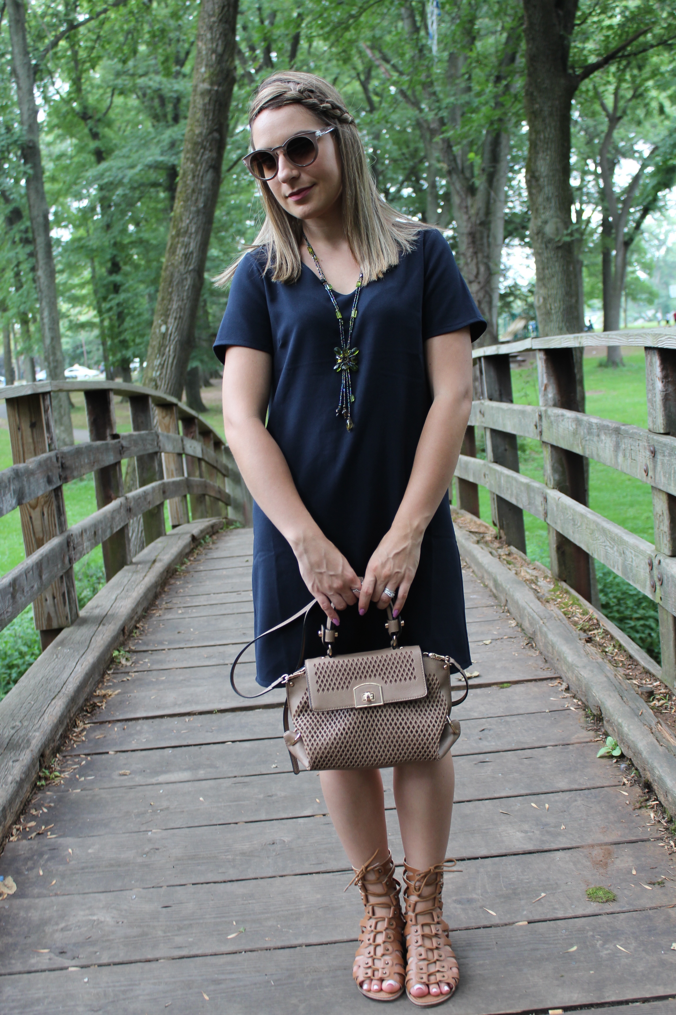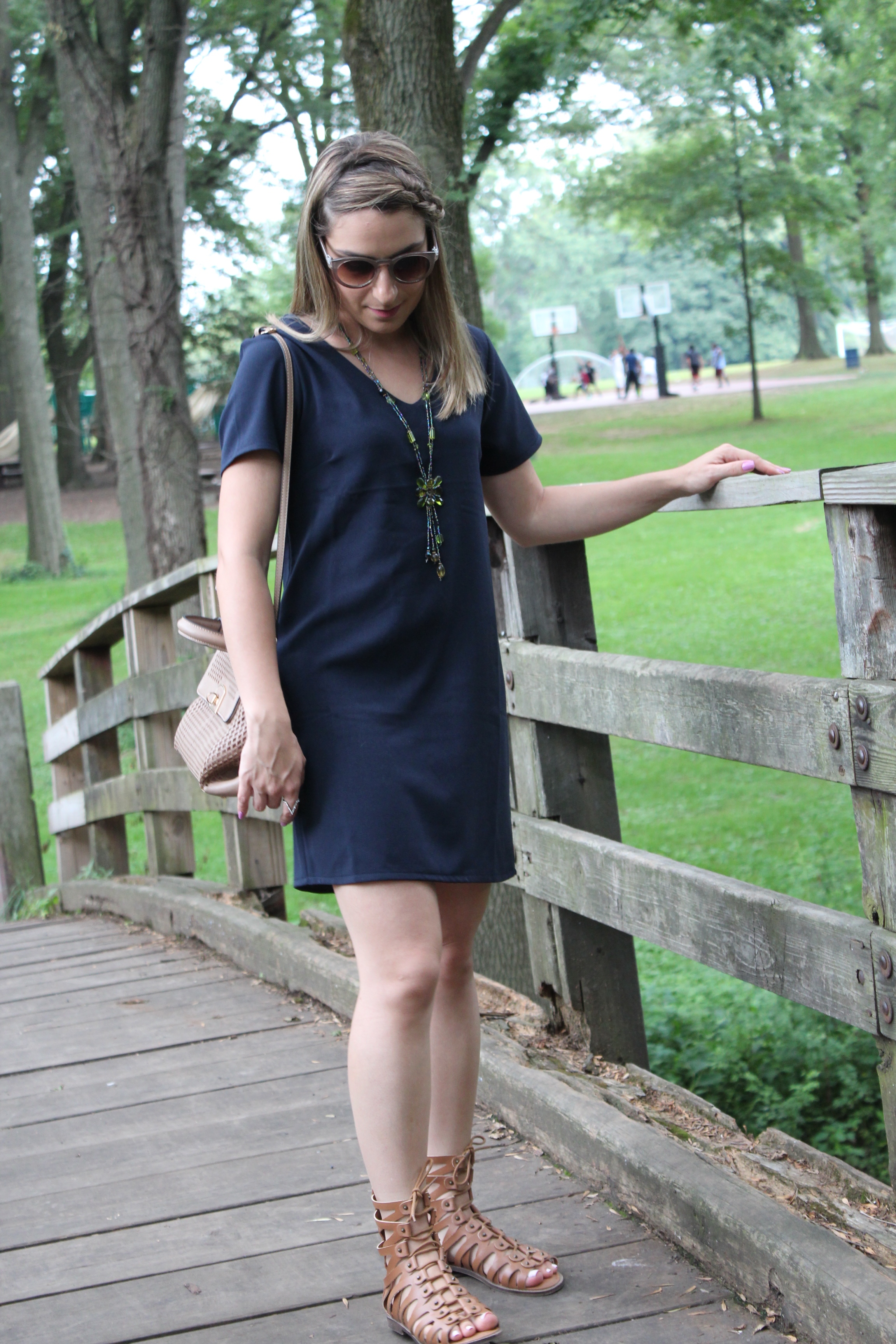 Hoje venho mostrar um look que usei essa semana super “ladylike” e confortável. Saimos para resolver algumas coisas e passei em um parque perto de casa para clicar o look e aproveitar o dia lindo que estava por aqui. Fiz uma mistura de clássico com moderno, usando um vestido em corte trapézio, que fica mais justinho na parte de cima e vai abrindo em forma de A, ou seja, mais larginho na parte de baixo. A quem diga que esse corte é para gravidas, mas não me importo! Adoro! 🙂 Quando eu ficar gravida só vai dar ele entao! hahaha O toque moderno foi a flat gladiadora! Os acessórios ajudaram a compor o look mais clássico do vestido azul marinho. Adoro esses vestidinhos mais básicos, pois posso abusar nos acessórios e sapatos para compor o look. Vejam como ficou: