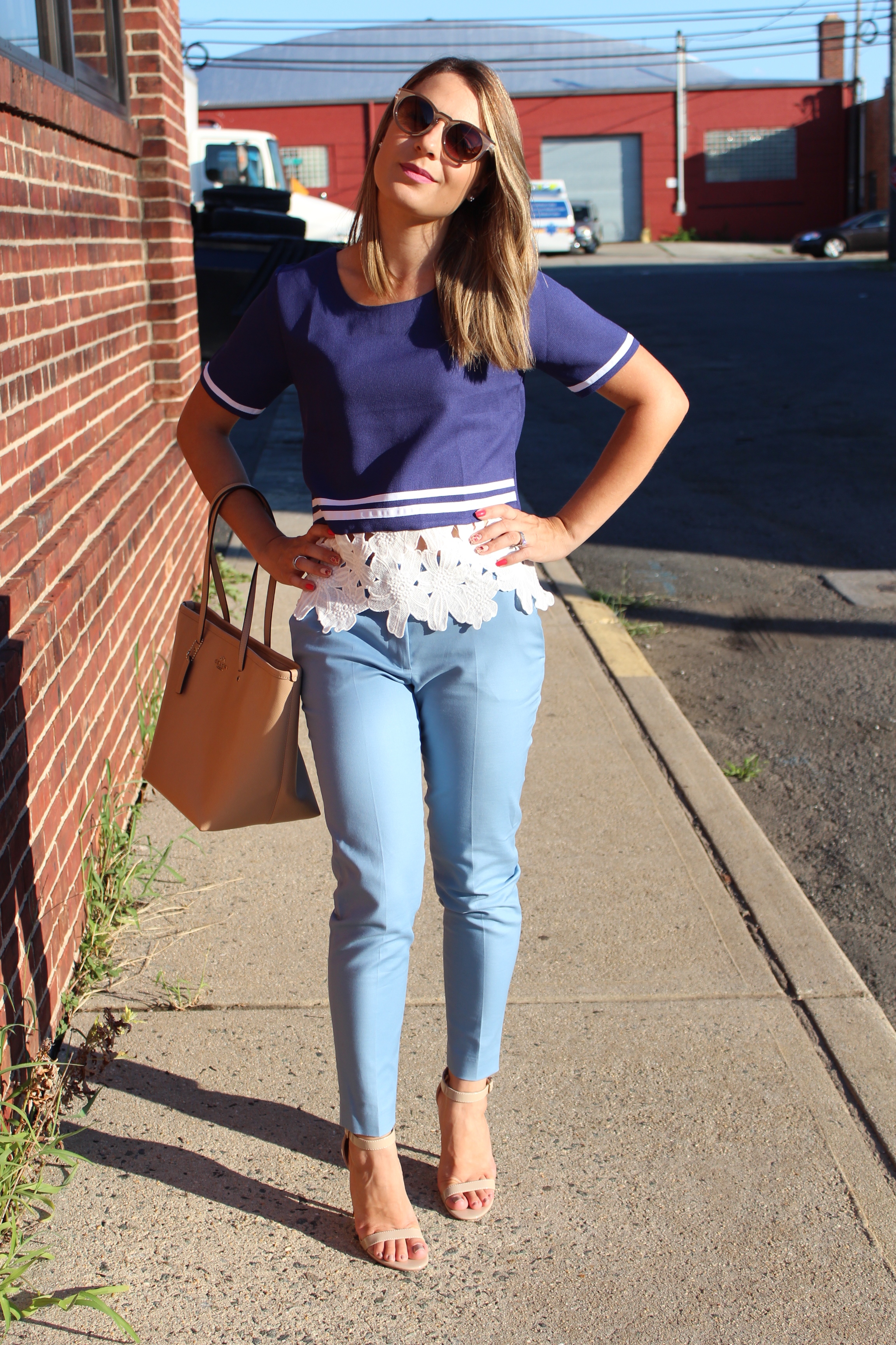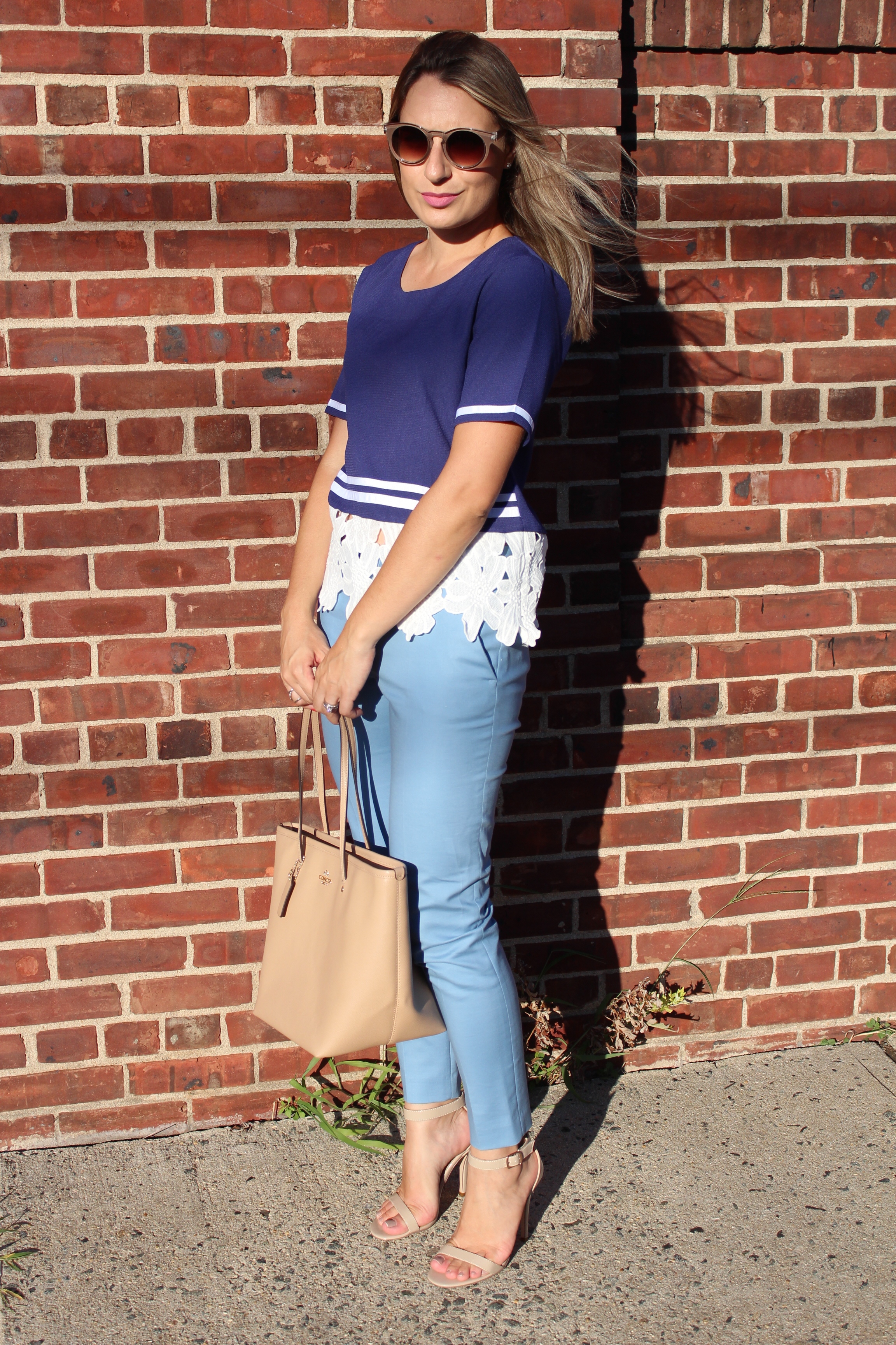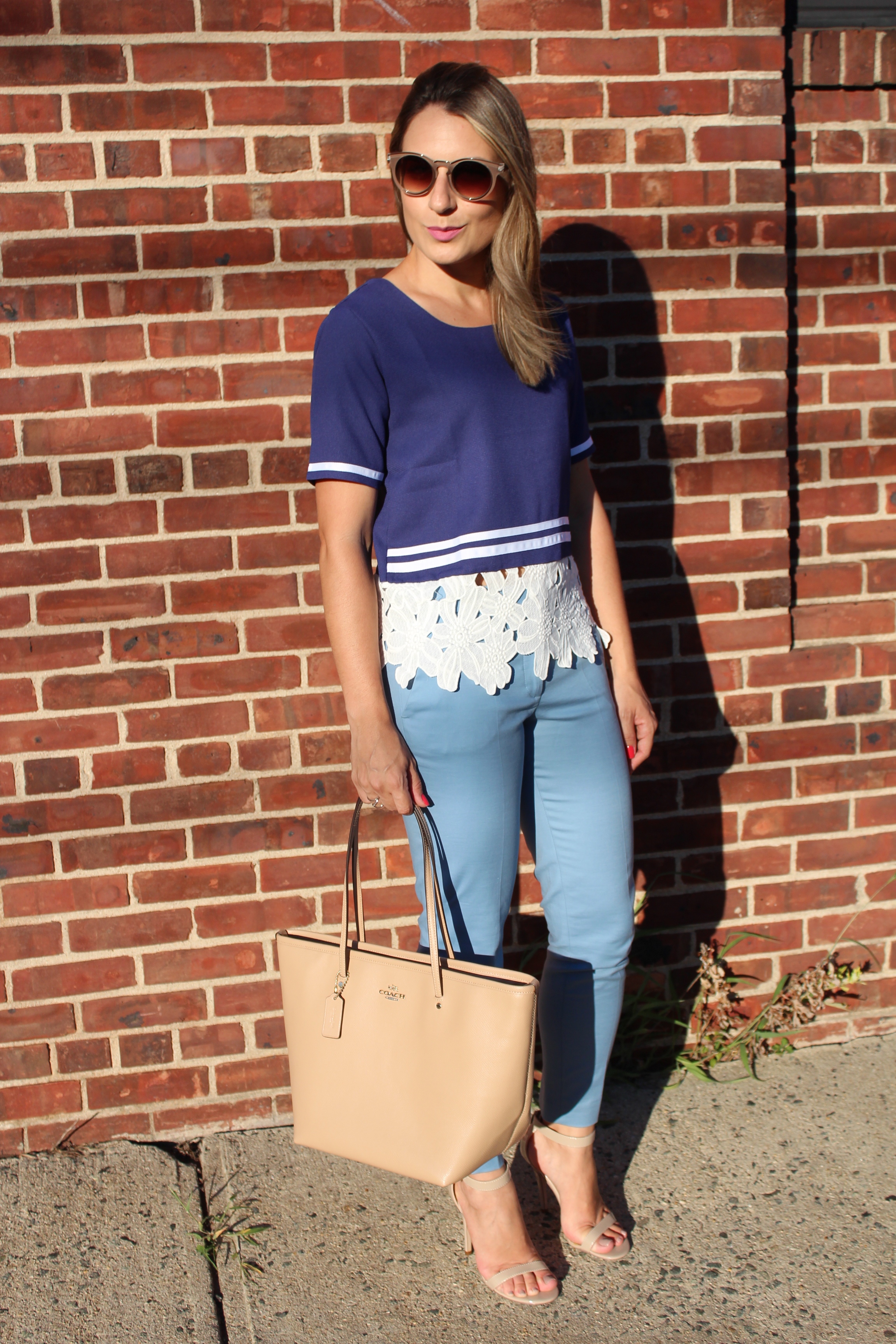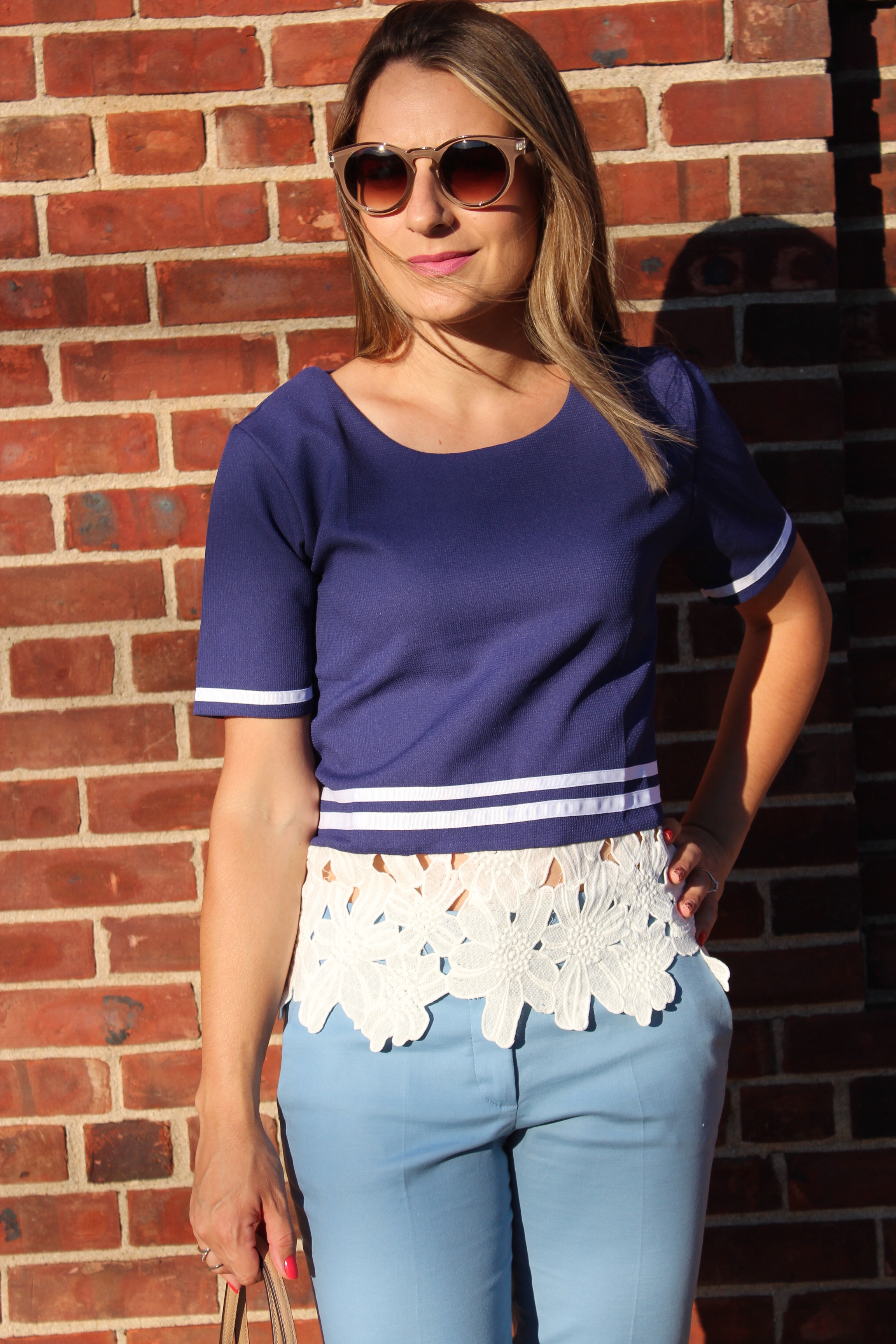 Hoje tem mais um look para alegrar o blog 🙂 Quem assistiu o video de compras e recebidos que postei na terça feira deve ter percebido meu vicio em roupa azul né!? Pois é, ultimamente, quase sem perceber, tenho adquirido varias peças em tons de azul. E no look de hoje venho mostrar como faço para combinar tanto azul junto hahaha. Para esse look, fiz uma mistura monocromática usando tons de azul e acessórios nude. Escolhi uma calça de cós alto, um pouco mais curta e com tom azul bebe e combinei com uma blusa estilo cropped com detalhe de renda branca na parte debaixo. Para deixar o look mais suave e elegante, optei por acessórios em cor neutra: uma sandália bem delicada nude e uma bolsa em modelo bem clássico. Os óculos também em cor neutra e modelo moderno. Um look super usável para trabalhar, ir a um jantar de negócios ou ate mesmo usar num domingo de almoço em família. Vejam como ficou.