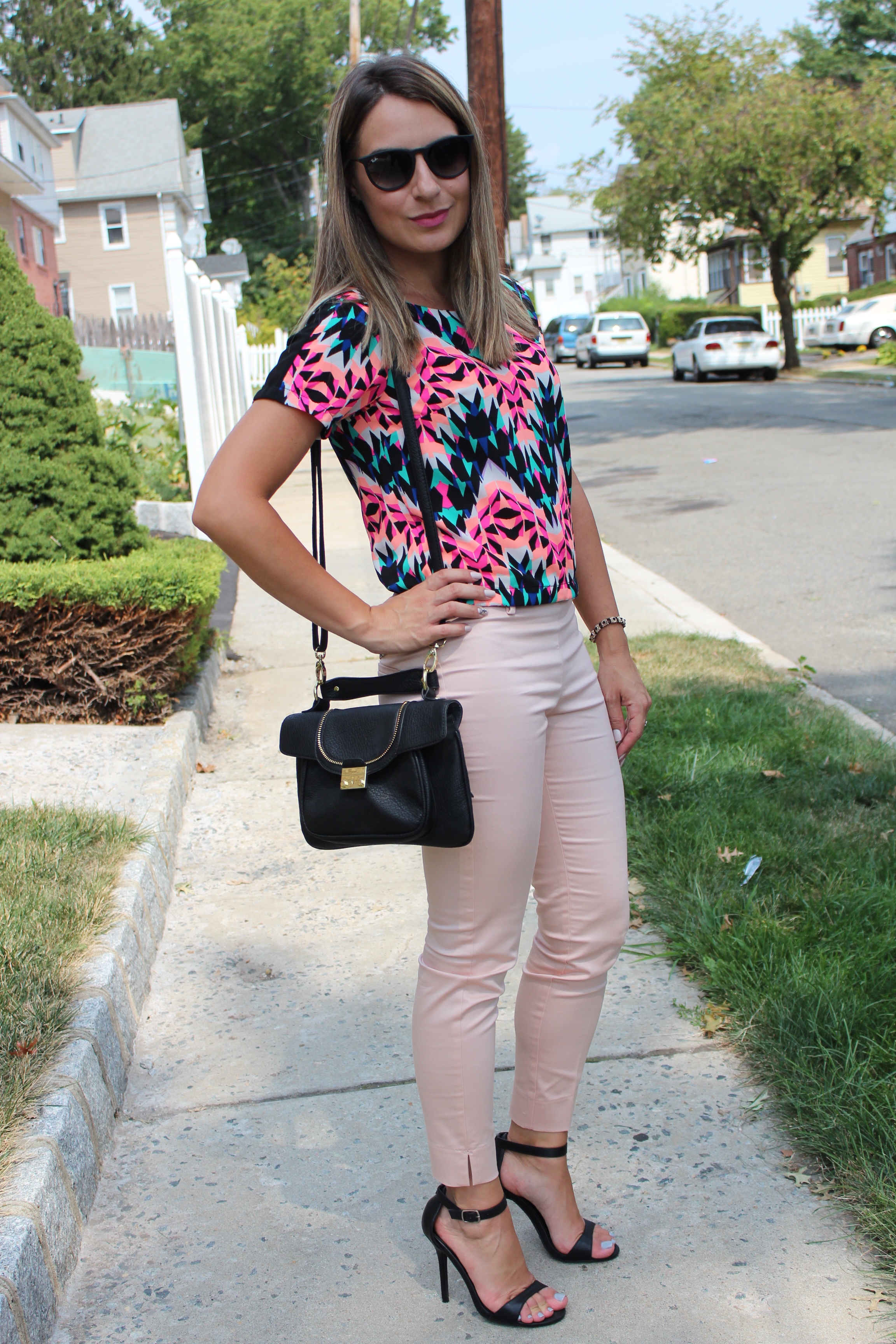 Bom, hoje vim mostrar um look bem simples com toque de cores que é perfeito para o verão. Usei esse look no domingo para ir na igreja e depois almoçar. Escolhi uma calça em tom salmão pastel, e para deixar o look mais alegre, coloquei um top todo trabalhado na estampa colorida. Finalizei com sandália, bolsa e óculos preto deixando o look mais sofisticado. Vamos ver?