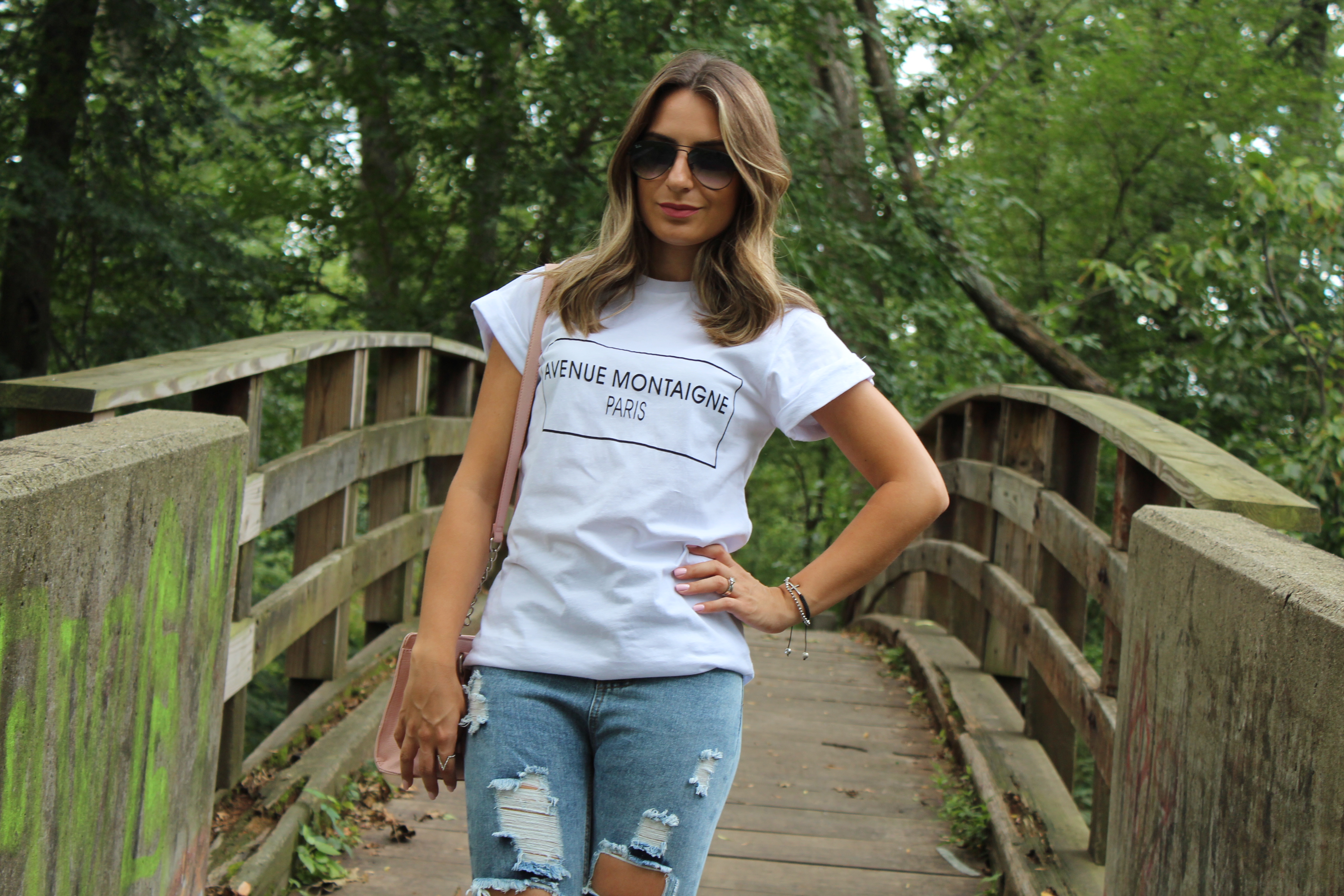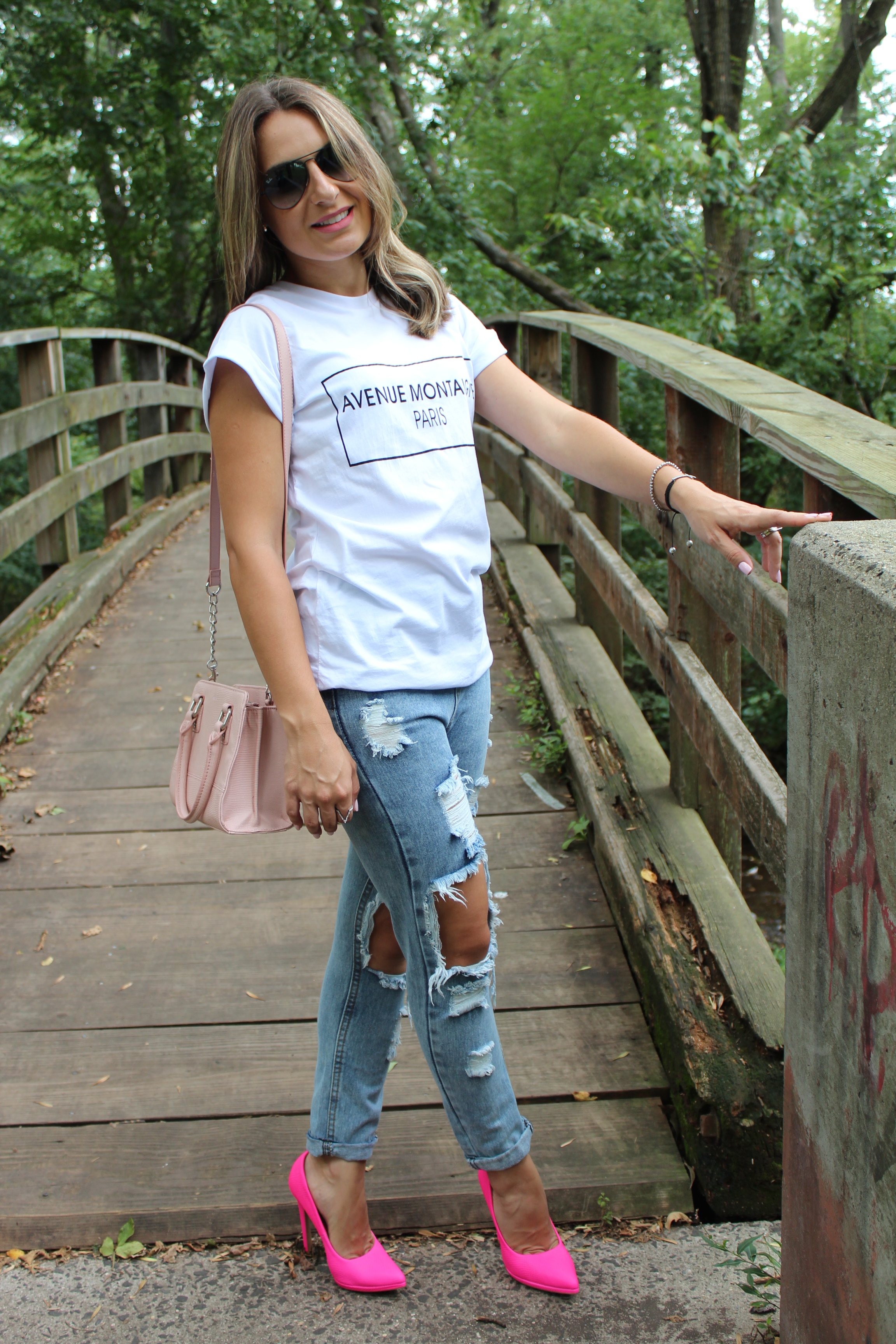 Então, hoje vim mostrar meu look super casual usando um jeans rasgado lindo que recebi da minha parceira querida Sheinside. Optei por uma produção bem cool fazendo uma mistura de básicos (jeans + t-shirt) com ponto de cor. A calca jeans em si, ja traz muita informação, entao escolhi usar com uma camiseta super básica e decidi ousar no sapato. Escolhi um scarpin pink super hot que quebrou o ar básico e deixou o look super despojado. Vejam o resultado: