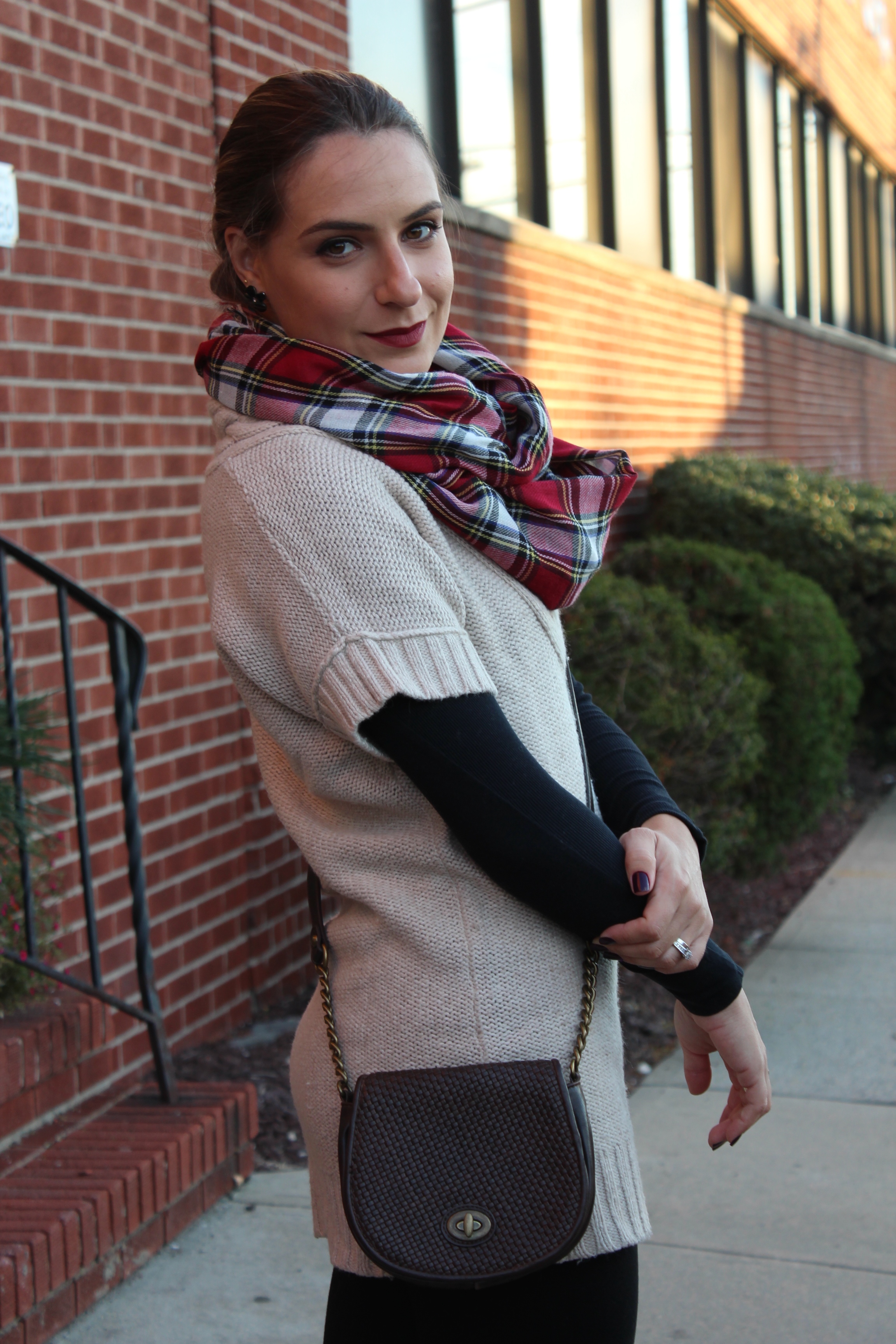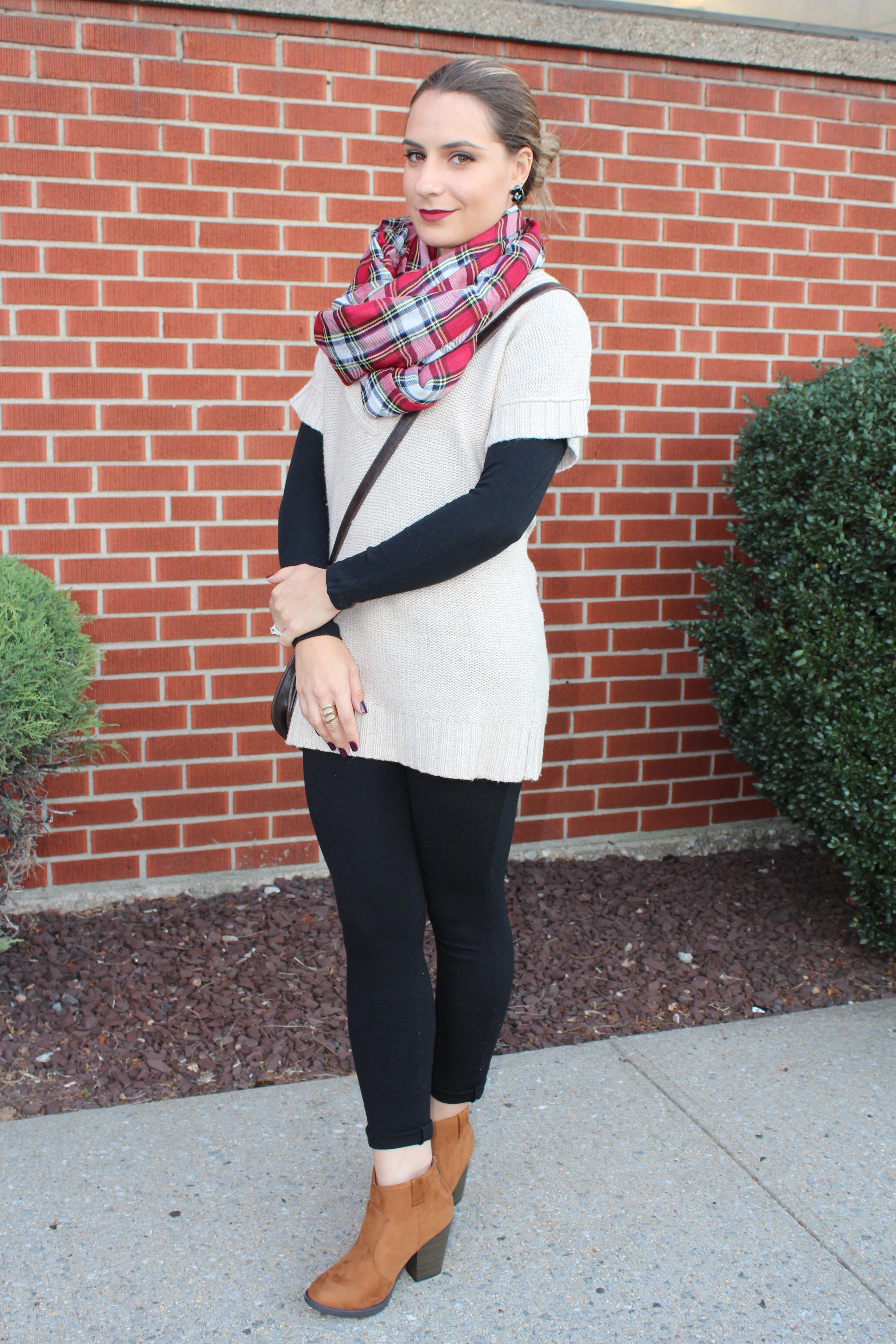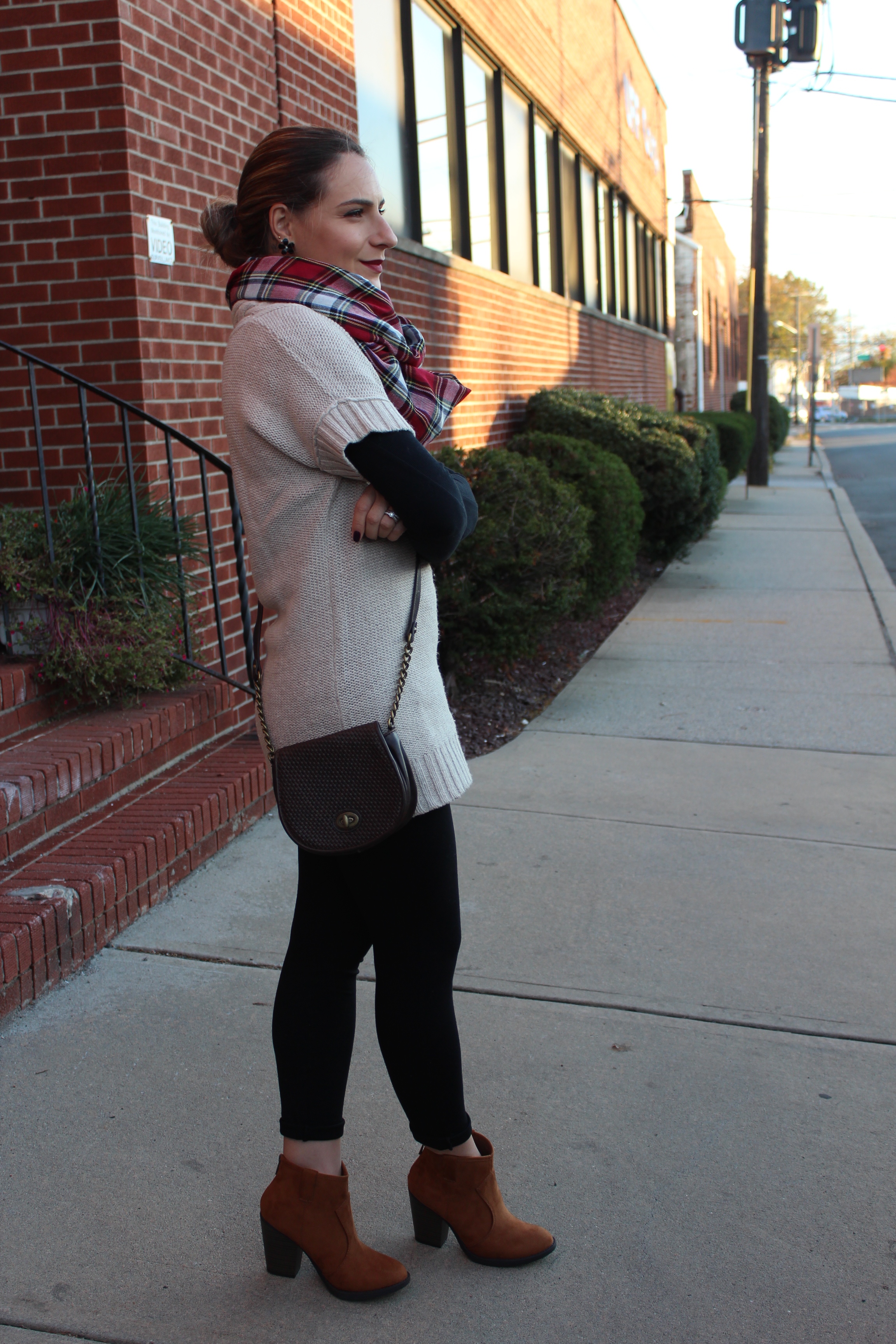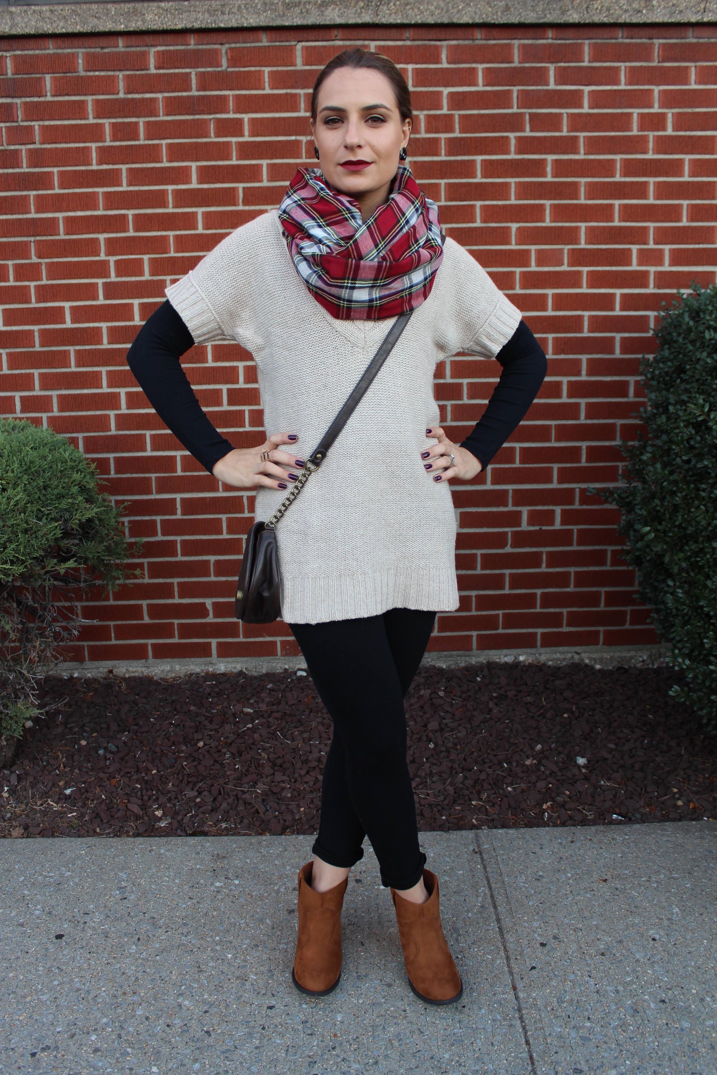 Chegou a hora de tiras as botas, cachecóis, casacos e blusas de frio pra fora! Os dias estão ficando mais frios por aqui e confesso que estou ate gostando. Mas só por enquanto, pois daqui um mês o frio é de doer e não é nada fácil fotografar looks para o blog. Mas, anyway… vim mostrar para vocês um look bem casual e confortável usando botinha de cano baixo que esta super em alta e é essencial para o outono. Escolhi uma malha comprida, tipo um sweater dress e usei com uma legging preta e uma camiseta de manga comprida por baixo do vestido. Finalizei com booties, bolsinha tira colo e um lenço xadrez para deixar o look mais alegre. No cabelo fiz um coque podrinho, quase sempre opto por coque quando uso cachecol ou lenço.