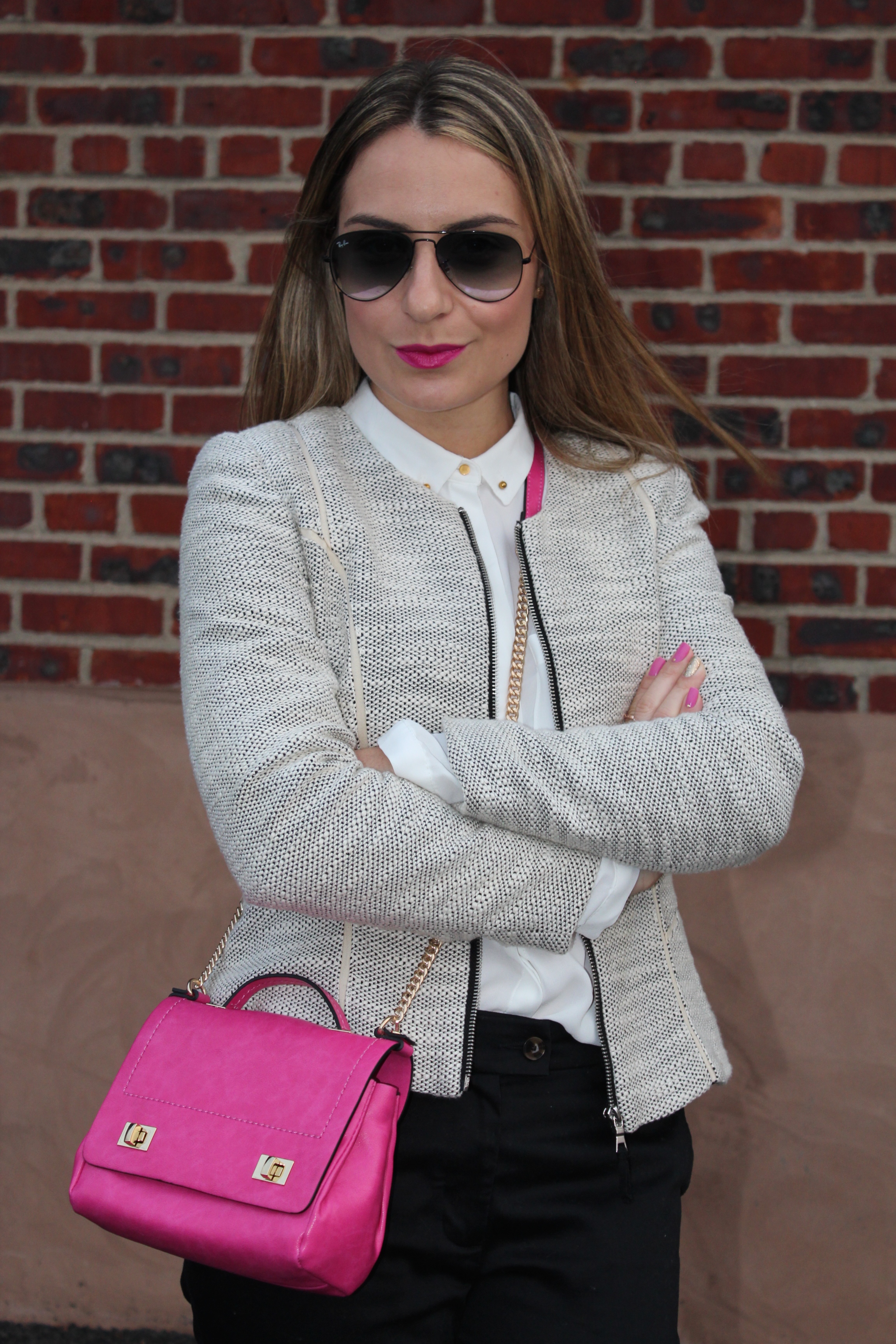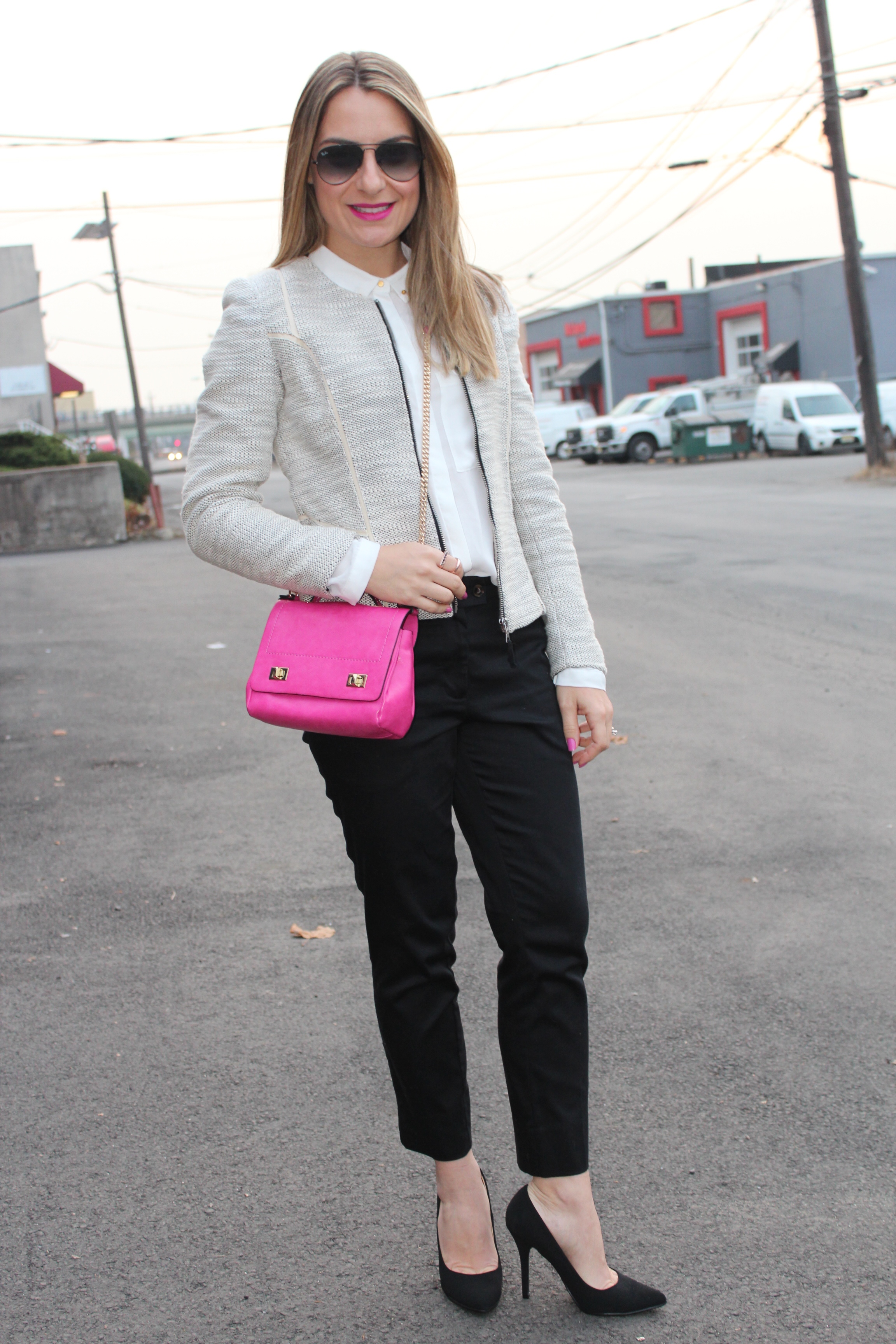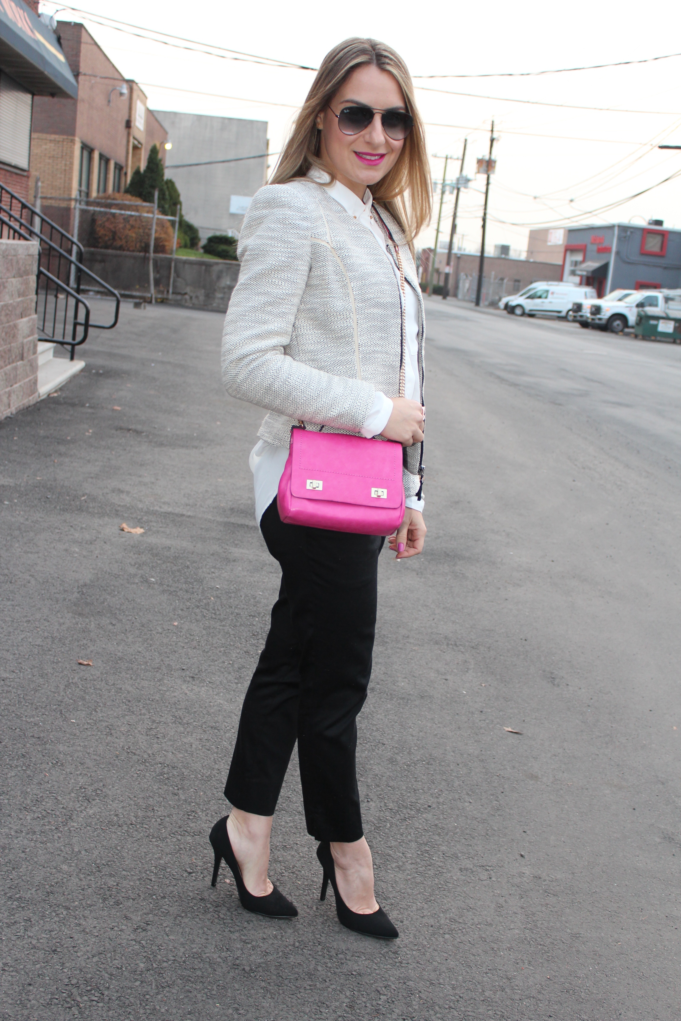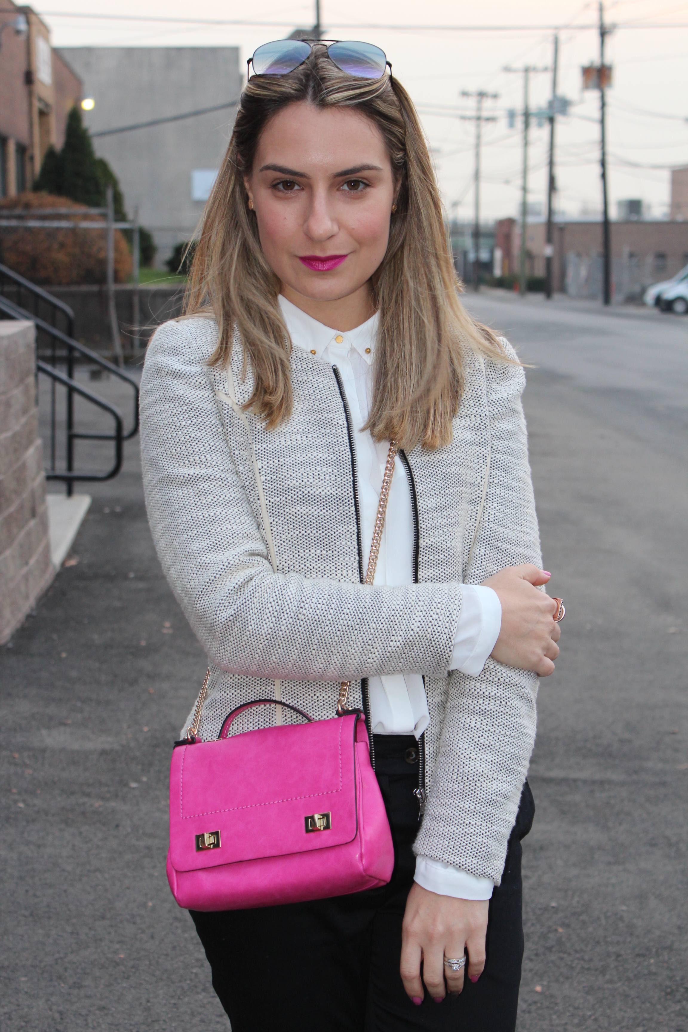 Genteeee estou começando a ficar assustada haha! Aqui em New Jersey nessa época do ano faz muito frio e temos que sair de casa todo empacotado para proteger do frio. Maaaas, aparentemente o frio não quer aparecer. O dia ontem estava lindo e a temperatura subiu que ate parecia primavera. Entao aproveitei para compor um look mais leve com cores bem básicas usando camisa branca clássica, calça social preta e uma jaquetinha de tweed por cima, e para complementar o look de deixar mais alegre usei uma bolsinha tira colo rosa e fiz um matchy- matchy usando batom também rosa!Finalizei com scarpin preto. Esse look ficou perfeito para uma ocasião mais seria e formal e a bolsa deu um toque fashion ao look mais básico. Vejam só: