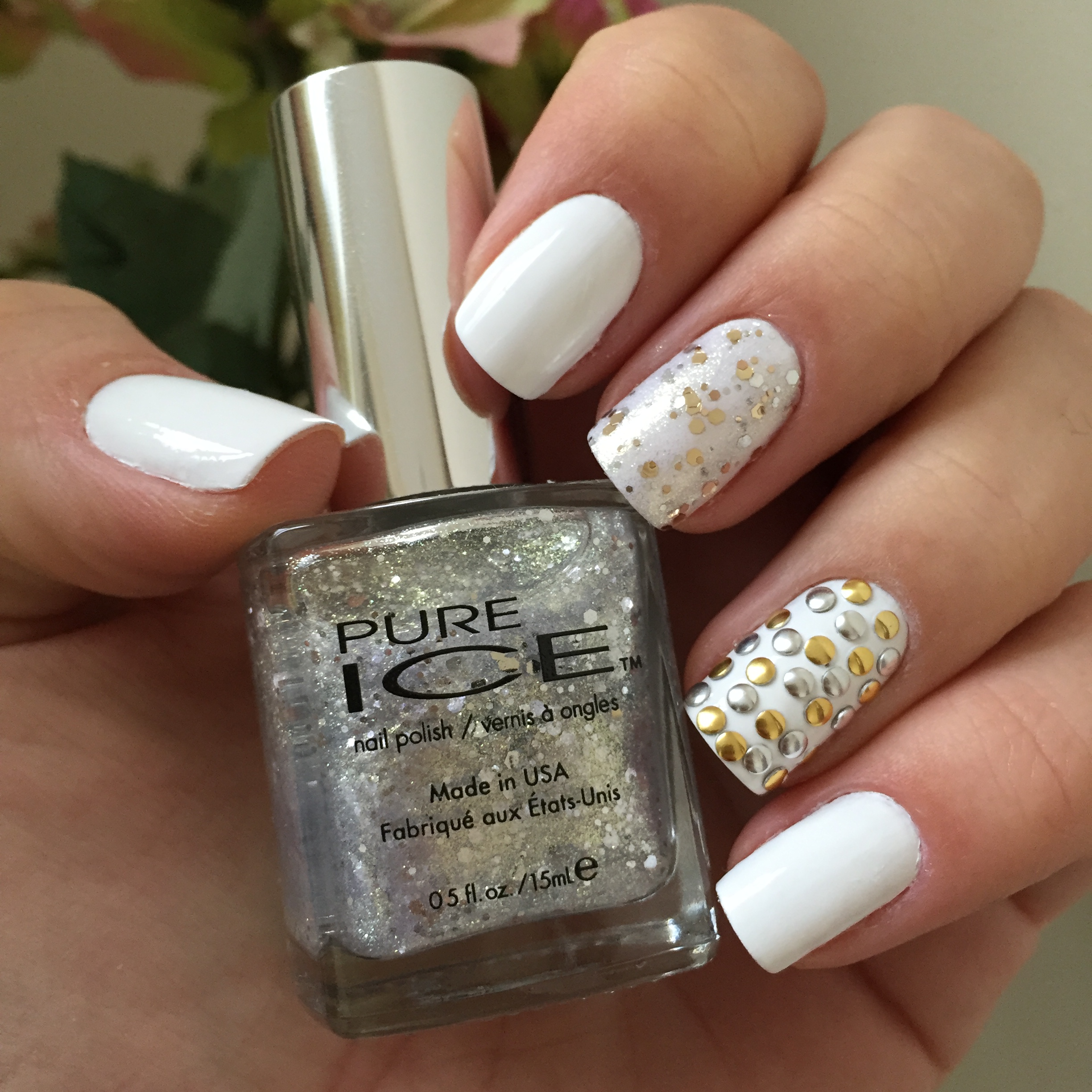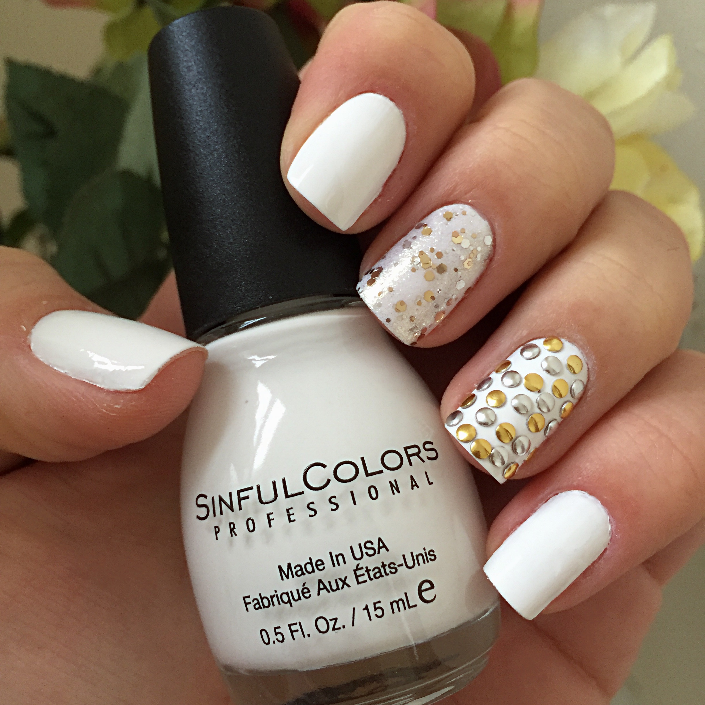 Como vocês já devem saber, sou apaixonada com esmaltes e amo fazer as minhas próprias unhas. Ultimamente tenho feito até duas vezes na semana e acabei acumulando os posts de unhas da semana. Então hoje vou mostrar para vocês a minha escolha de esmalte que usei no Réveillon. E ainda essa semana posto as outras “unhas” de 2016! Lembrando que assim que acabo de fazer minhas unhas eu posto no Fanpage e no Instagram então me sigam por lá para acompanhar ok! Para a virada do ano escolhi um branco clássico na cor Snow me White da Sinful Colors e fiz duas unhas diferentes; uma com glitter dourado e prateado esmalte da ICE e na outra colei tachinhas douradas e prateadas e ficou super charmosa. Vejam só: