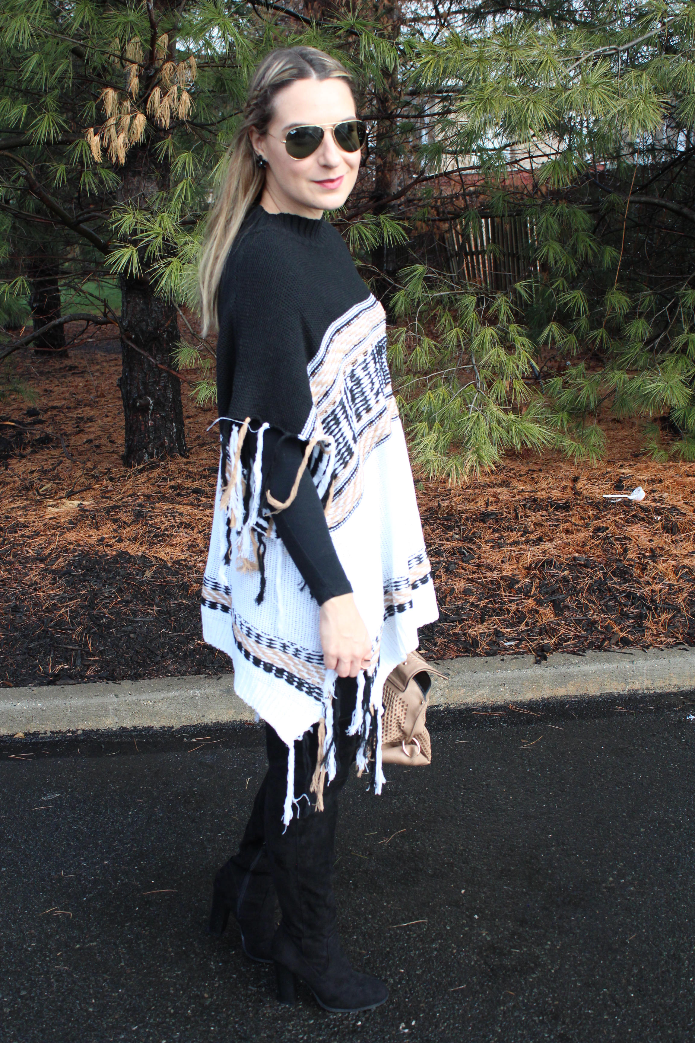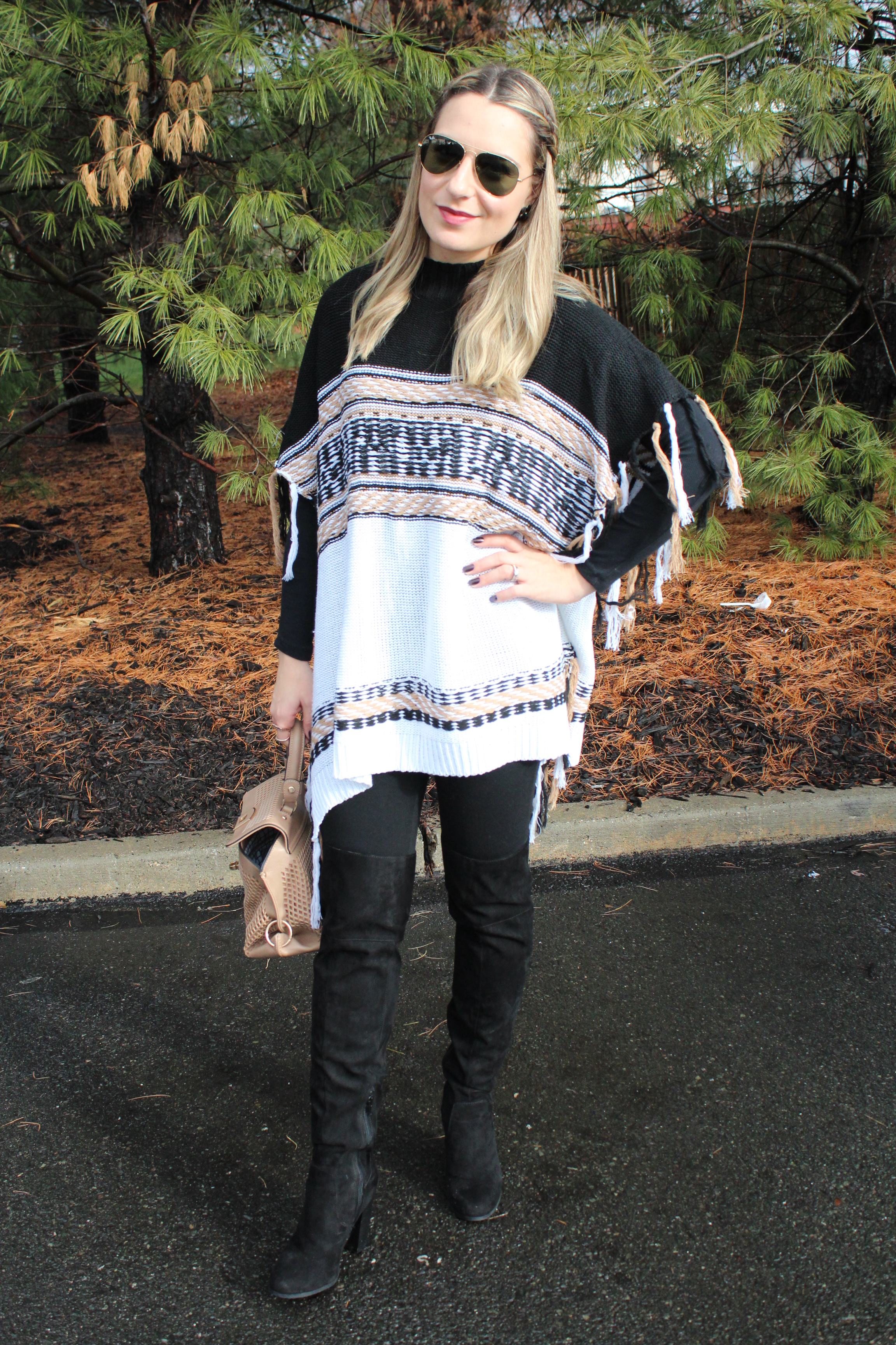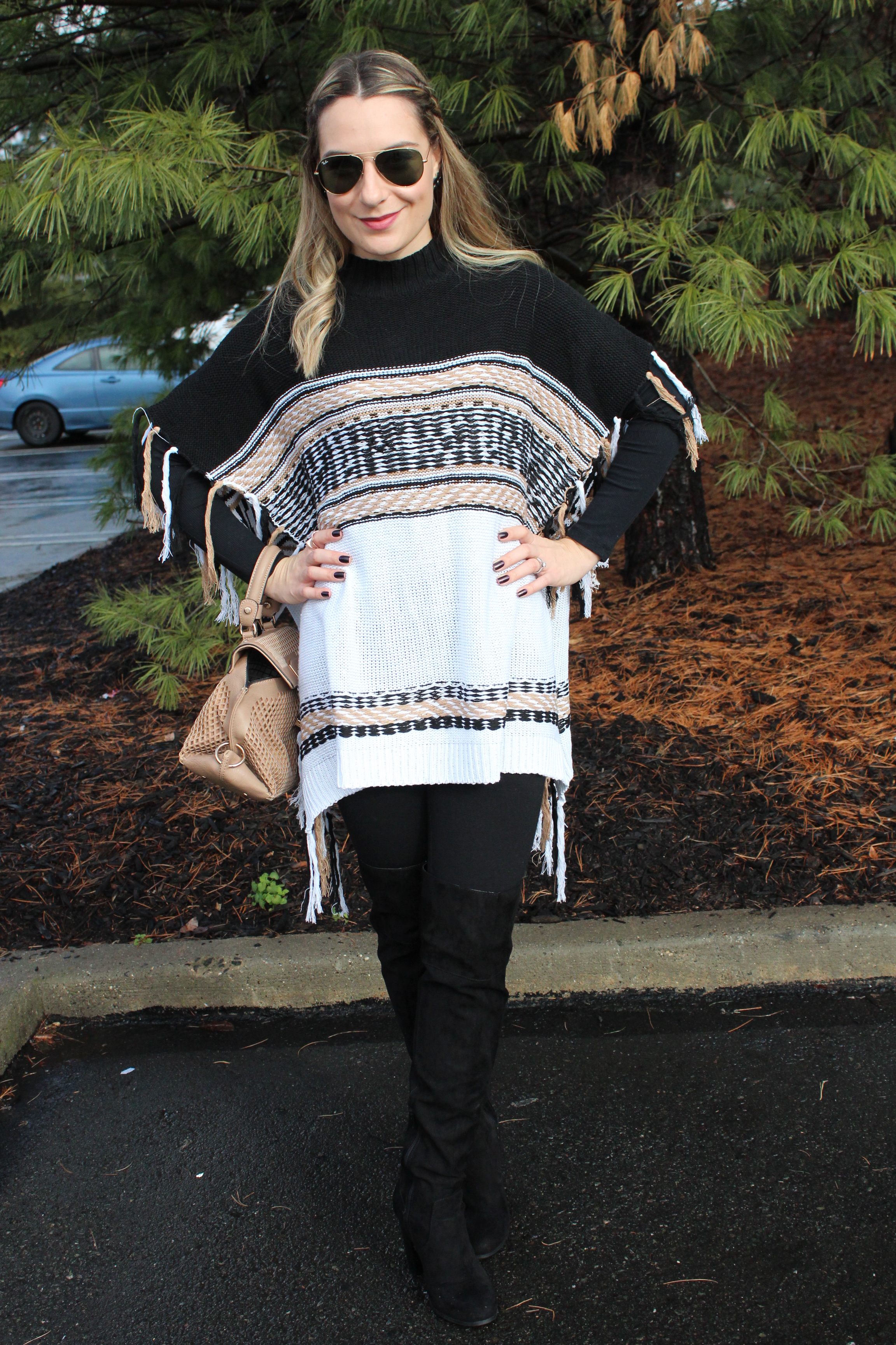 Poncho de Tricô: Shein (aqui) ♥ Camiseta: Forever 21 ♥ Legging: TJMax ♥ Botas OTK: Charlotte Russe ♥ Bolsa: TJMax ♥ Oculos: RayBan