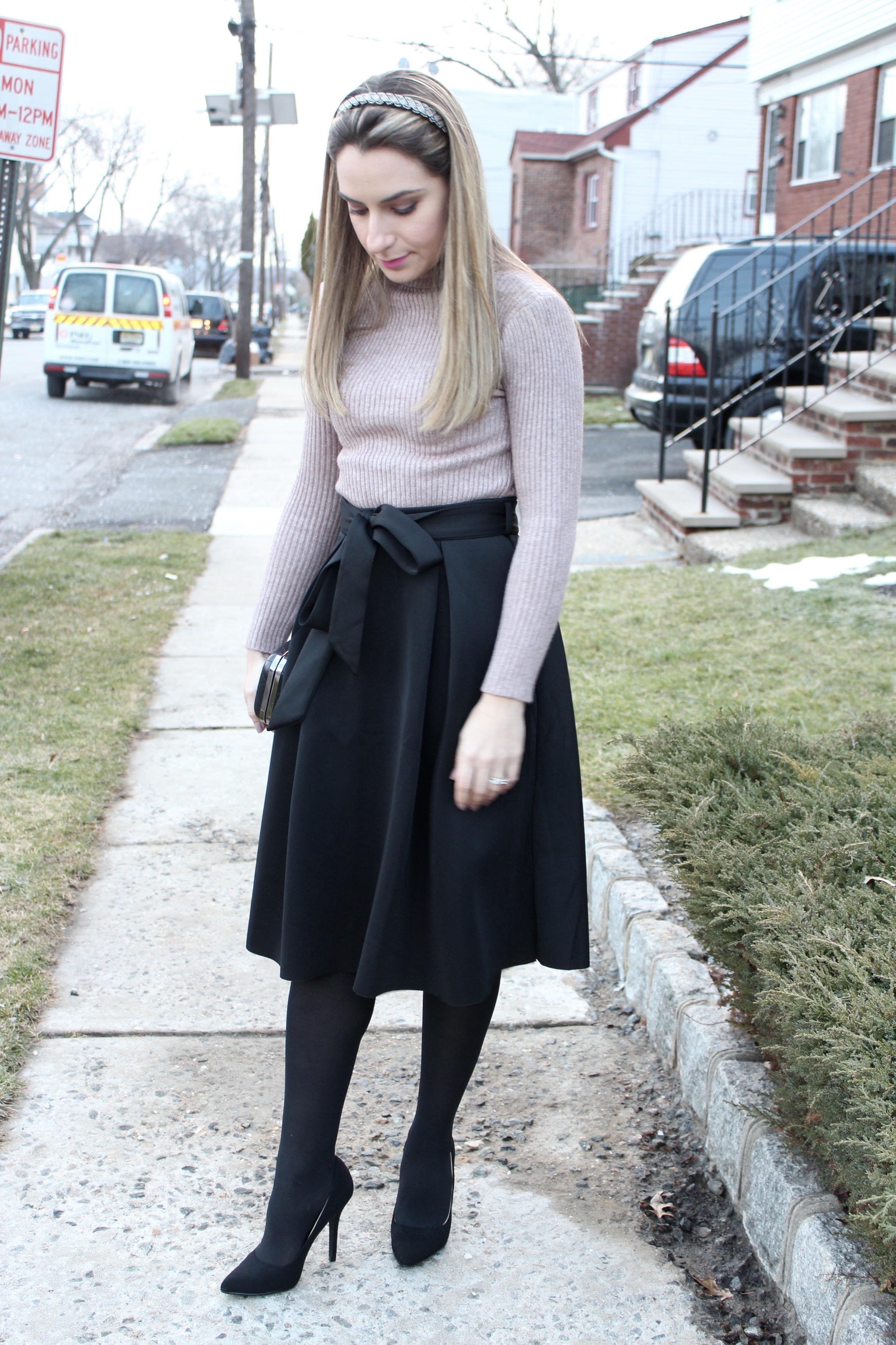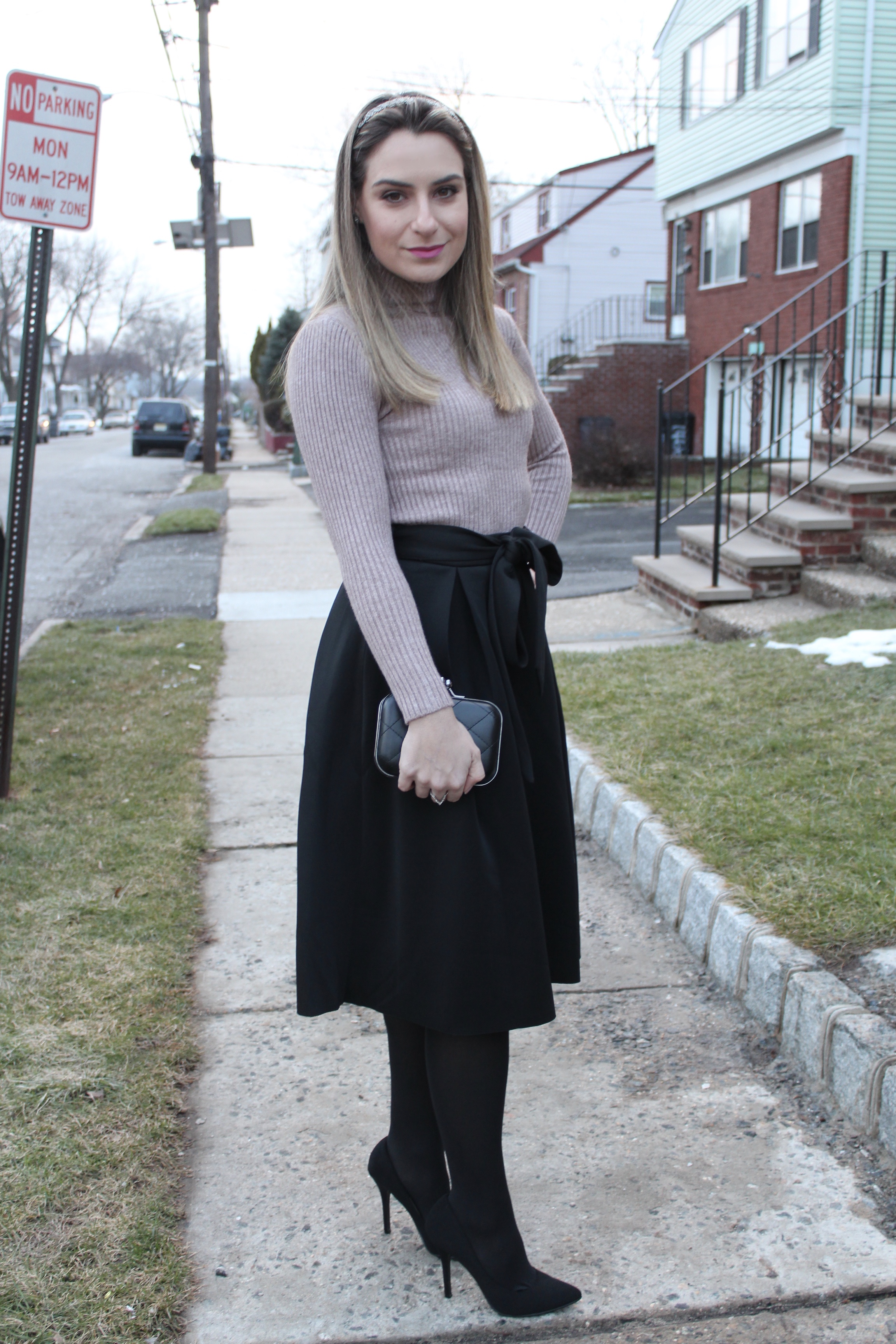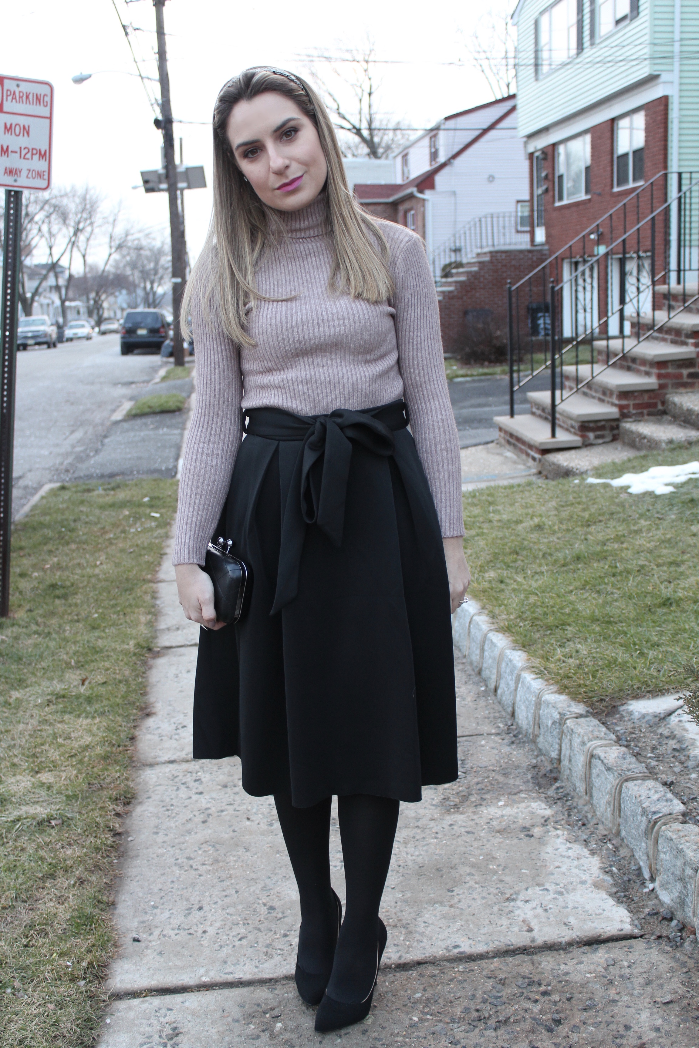 Para o meu look escolhi uma saia midi rodada de cintura alta com cinto em formato de laço  e optei por uma cacharrel de tricô em um rosinha bem neutro. As duas peças são da Shein! Finalizei com meia calça preta (porque não sou obrigada a passar frio haha) e sapato de salto preto que ajudou a alongar a silhueta. Vejam só: