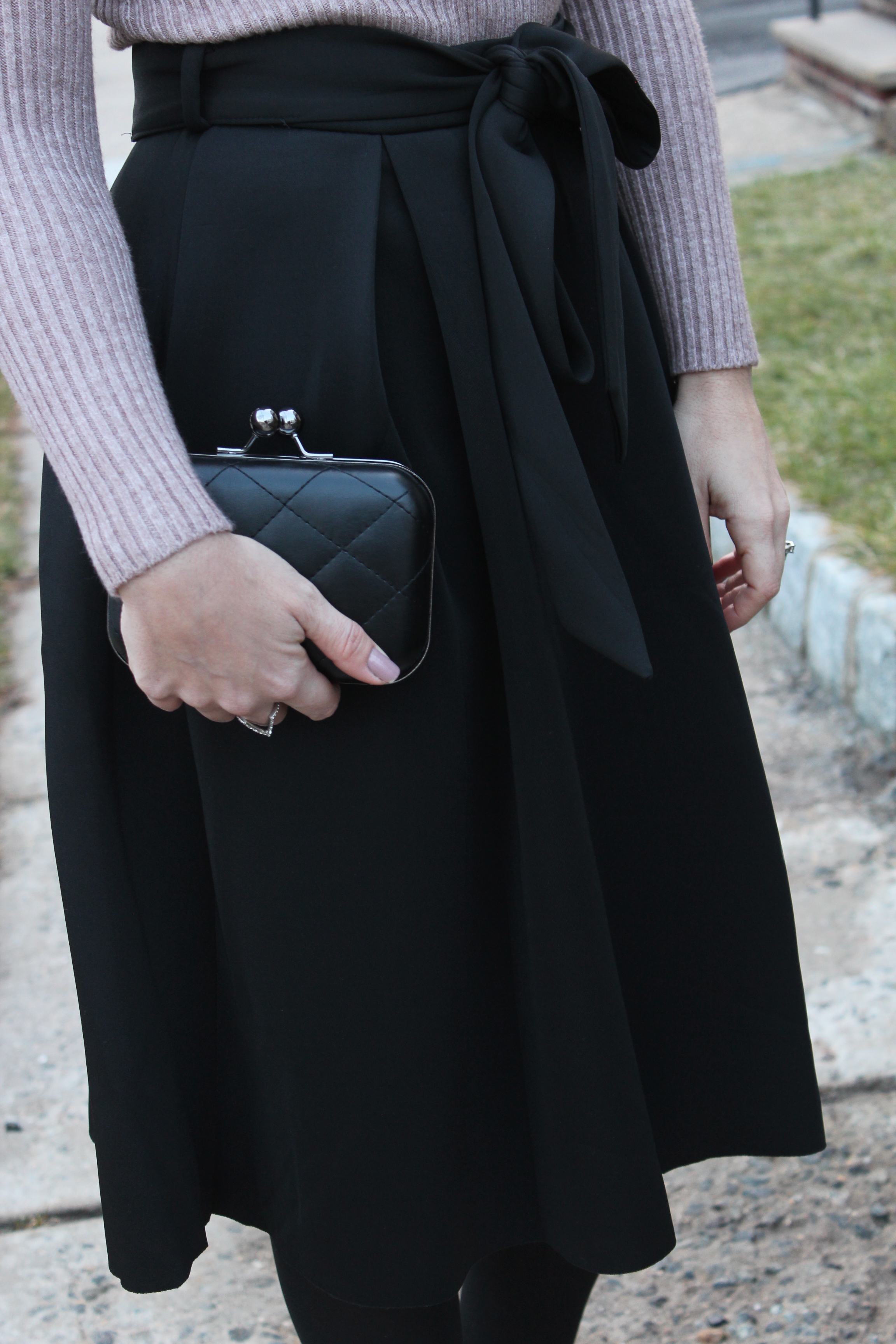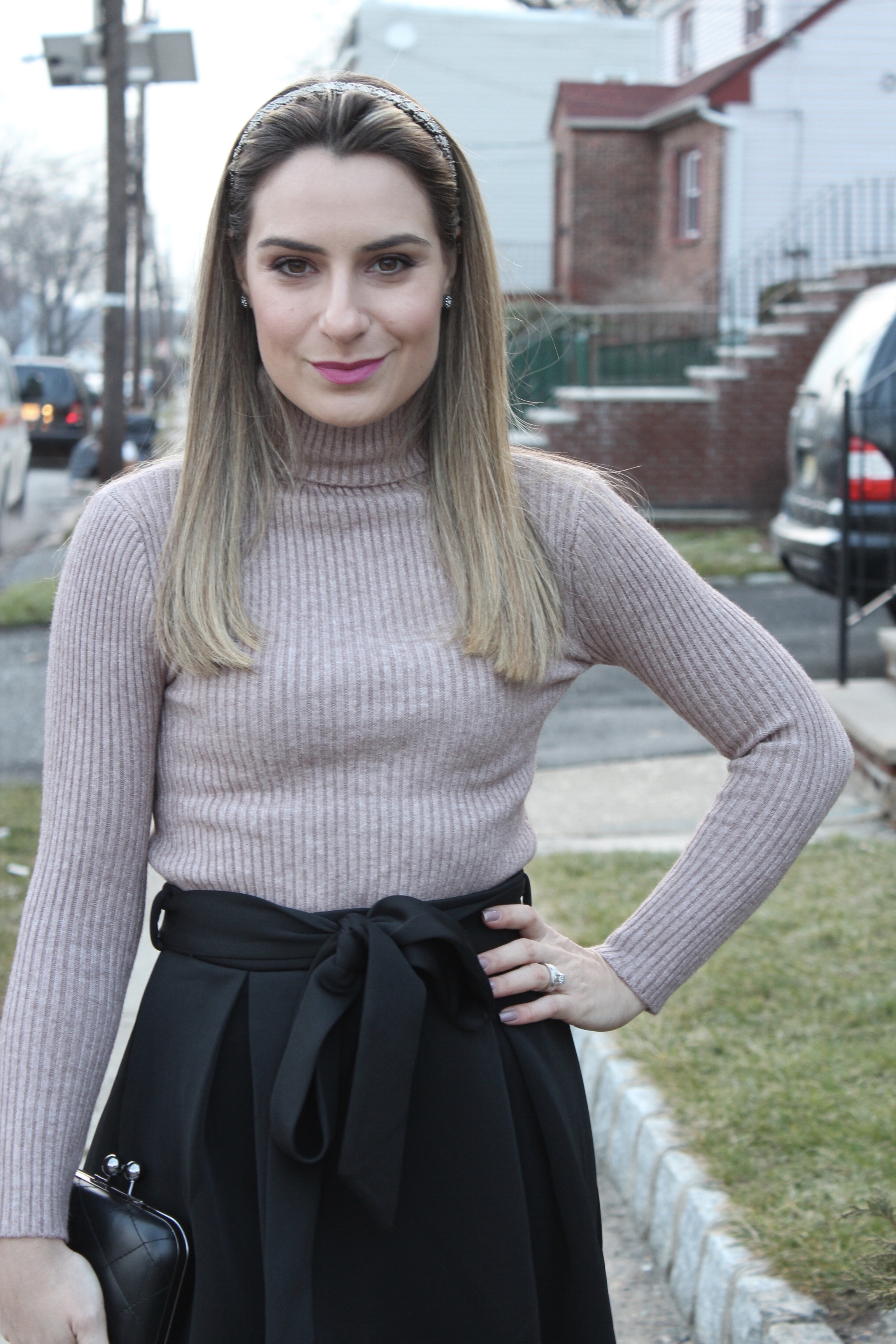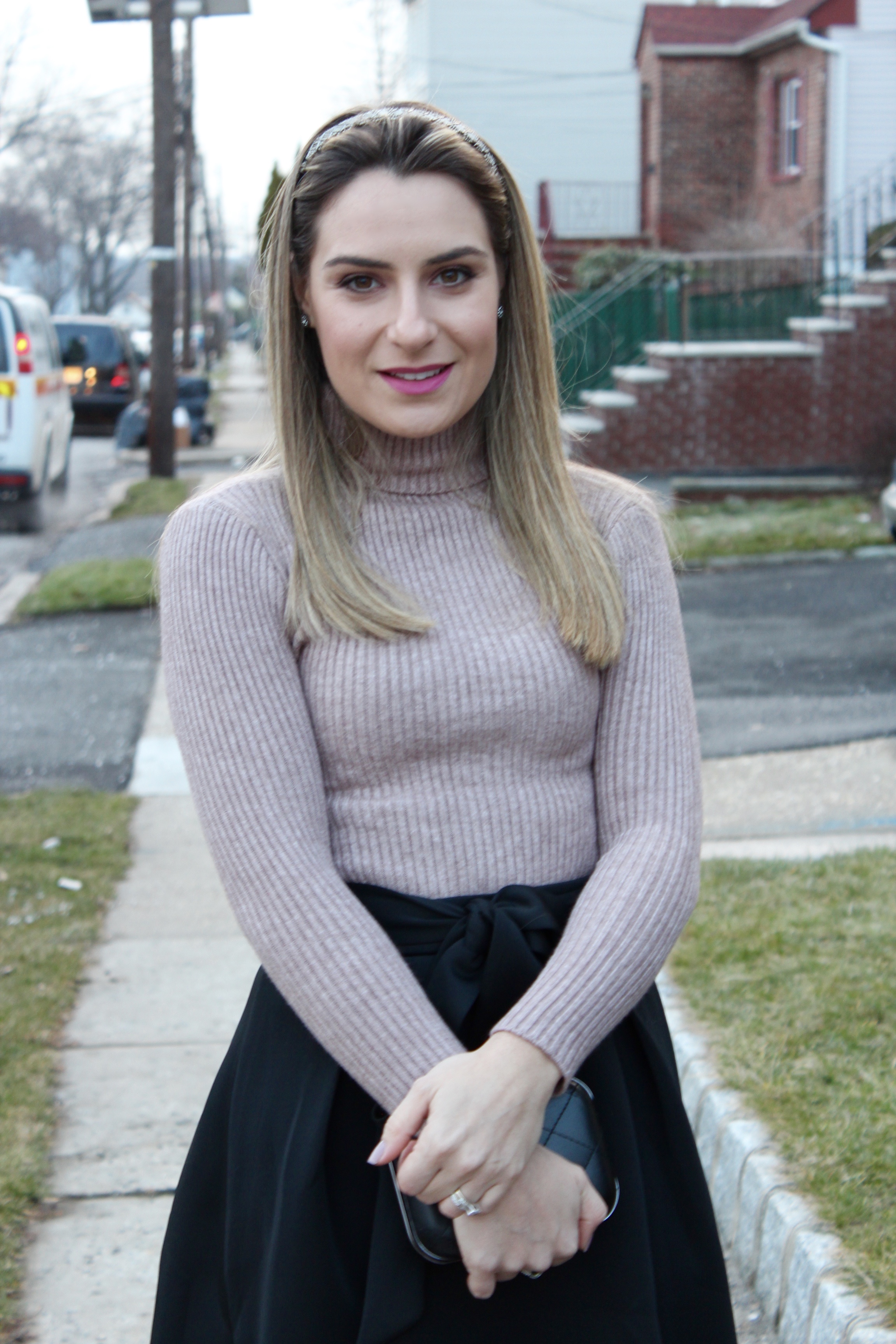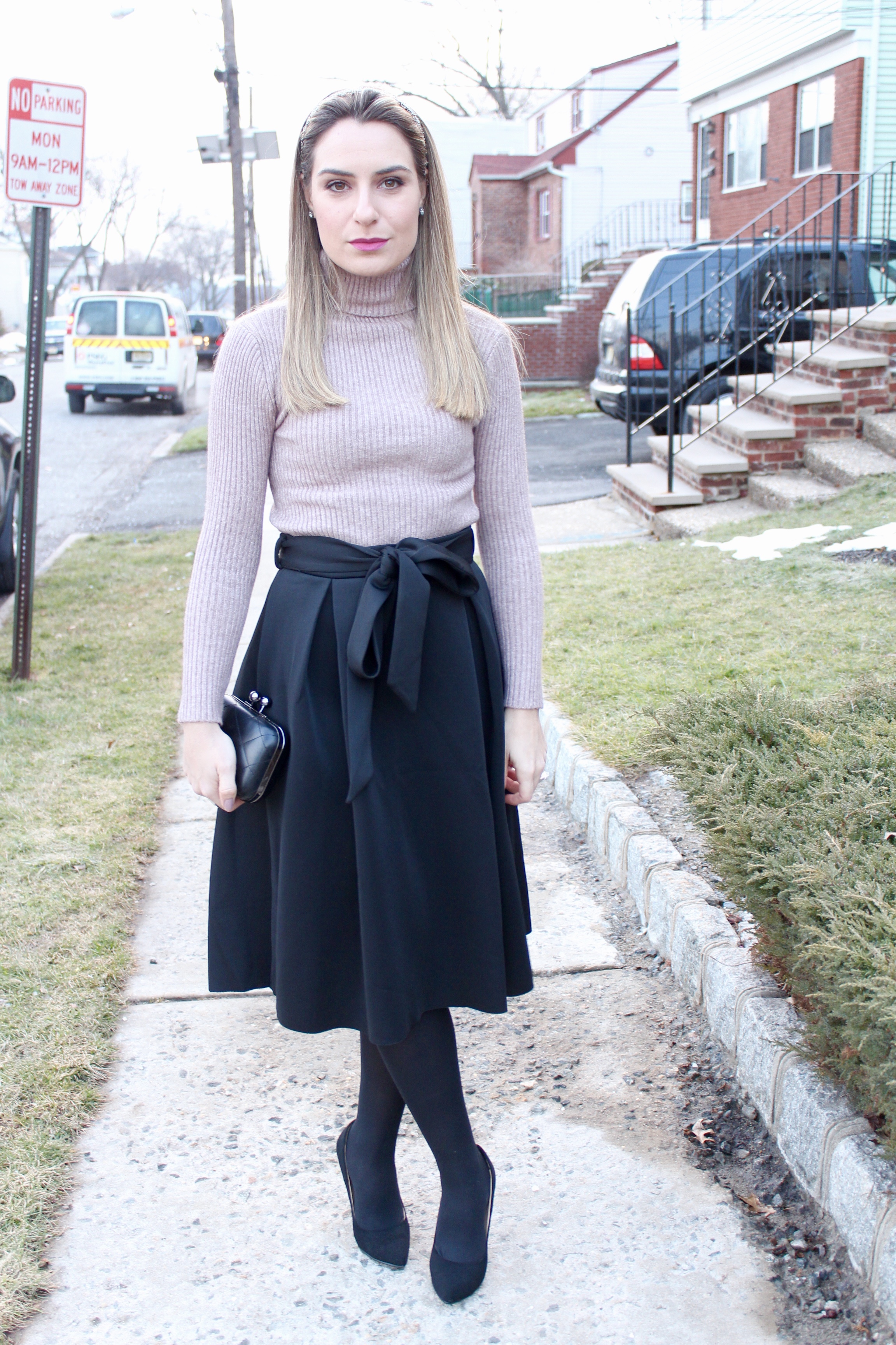 Para o meu look escolhi uma saia midi rodada de cintura alta com cinto em formato de laço  e optei por uma cacharrel de tricô em um rosinha bem neutro. As duas peças são da Shein! Finalizei com meia calça preta (porque não sou obrigada a passar frio haha) e sapato de salto preto que ajudou a alongar a silhueta. Vejam só:
