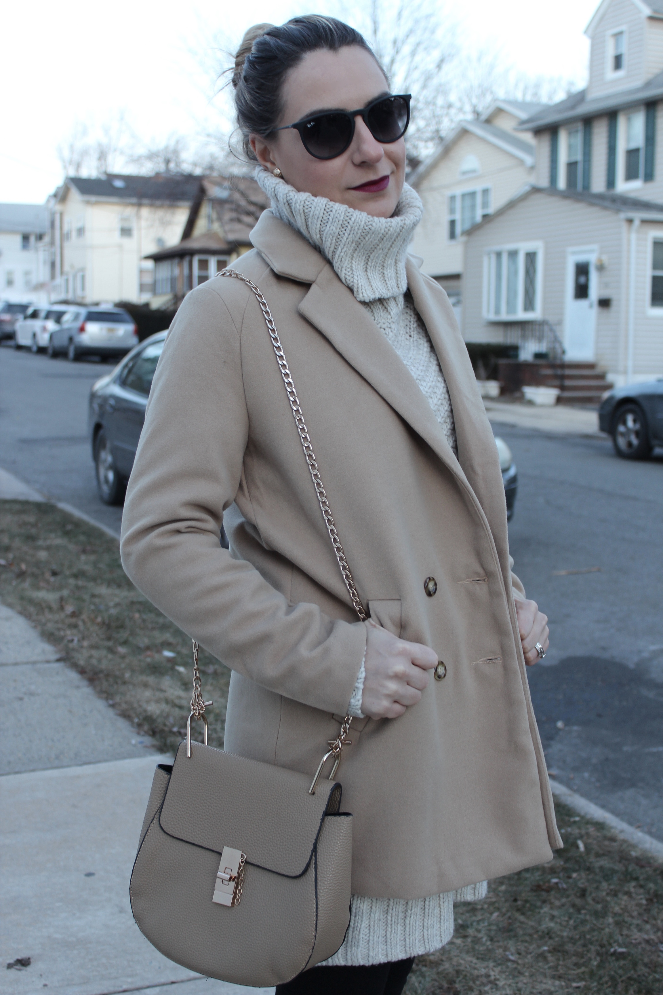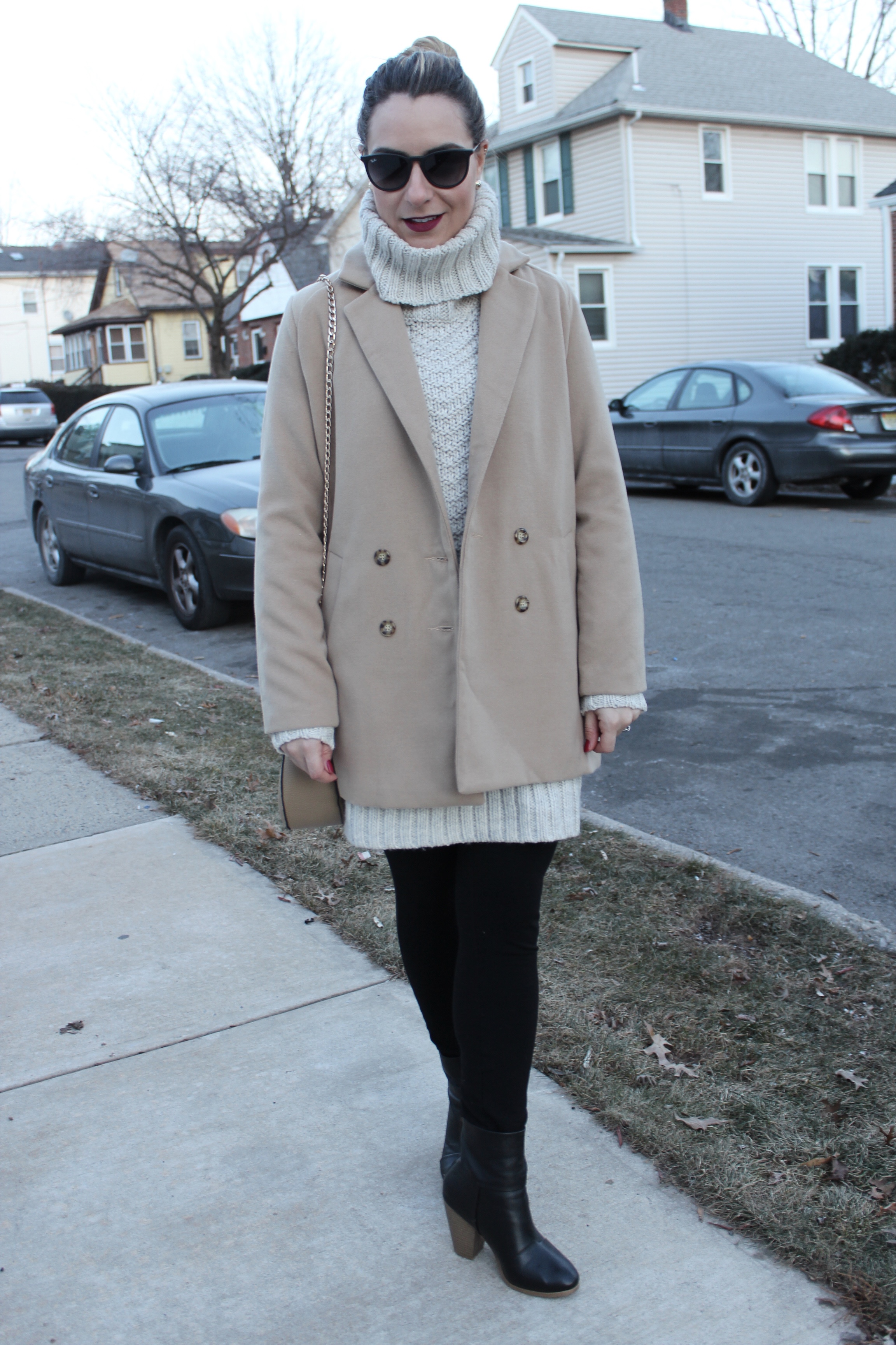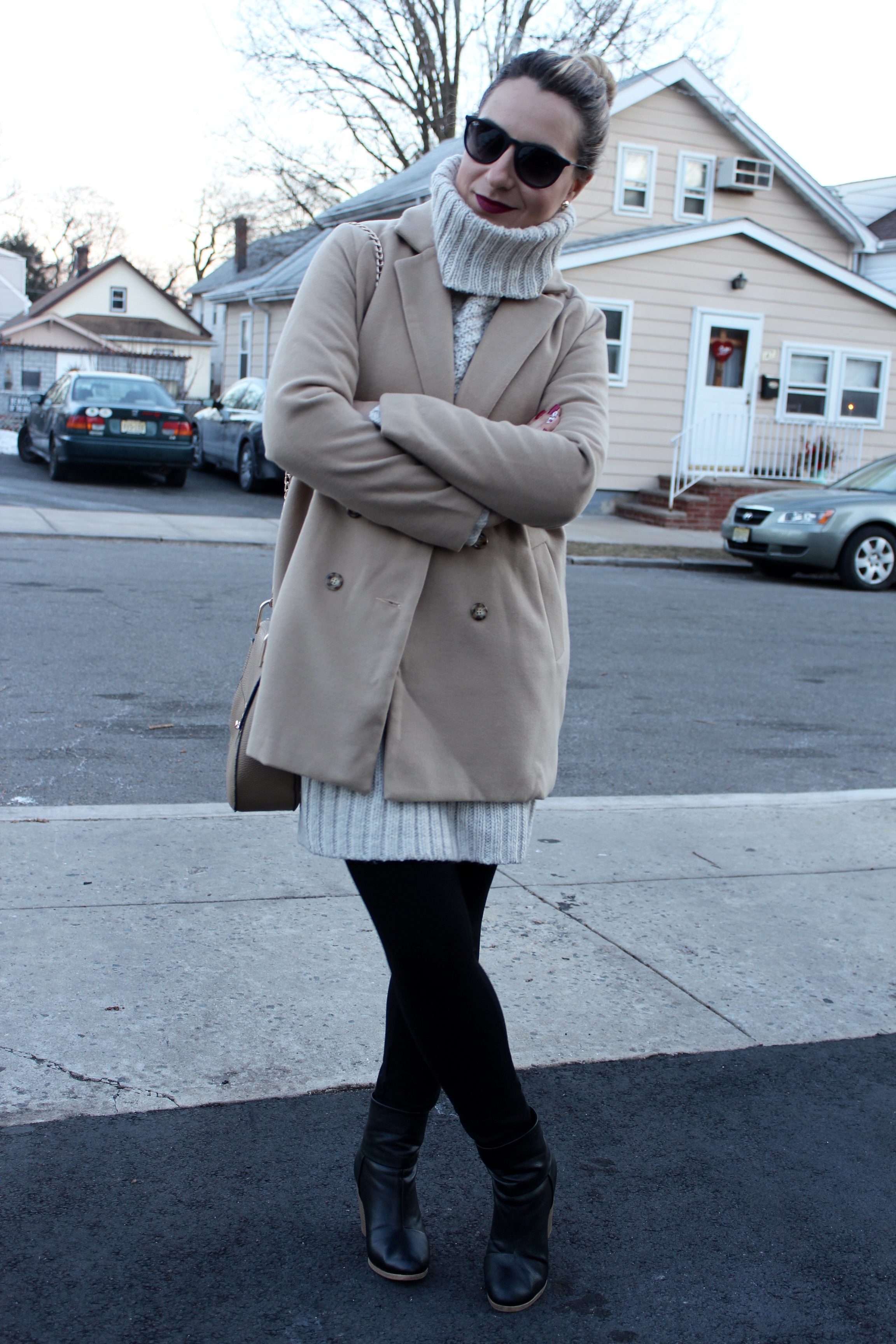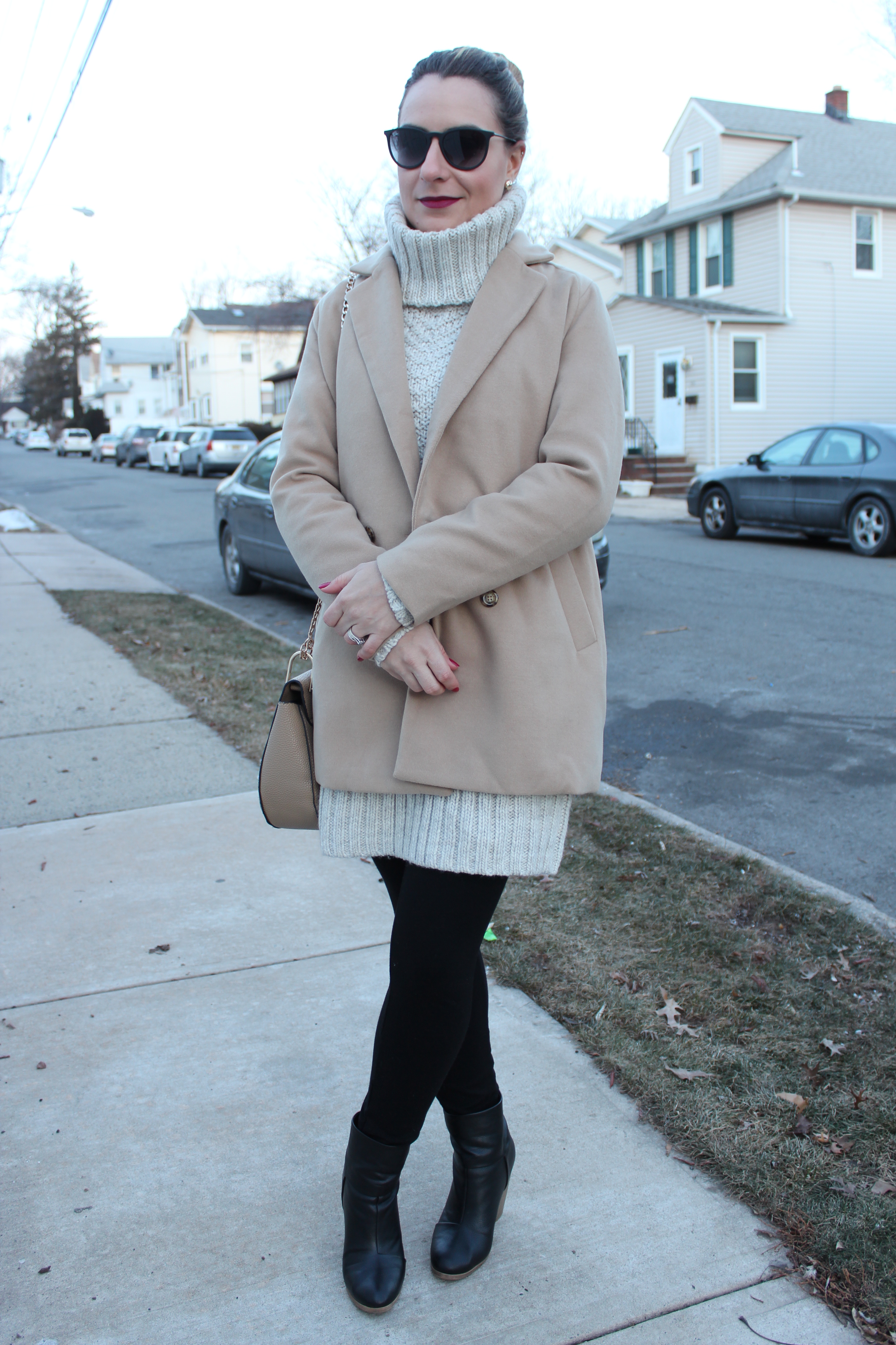 Uma ótima opção para dias frios são os sueters maiorzinhos! Alem de deixar o look mais quentinho, servem como peça única, podendo ser usado como vestido. Eu adoro e quanto mais “oversized” for, melhor! E para o look de hoje, que usei para enfrentar a frente fria aqui em New Jersey, escolhi uma suéter bem grandona! O look todo ficou bem neutro e o mais importante, quentinho! Combinei com um casaco bege da Shein estilo um sobretudo de lã que esta super em alta, legging preta, botinha de cano curto e bolsa tira colo. Vejam como ficou: