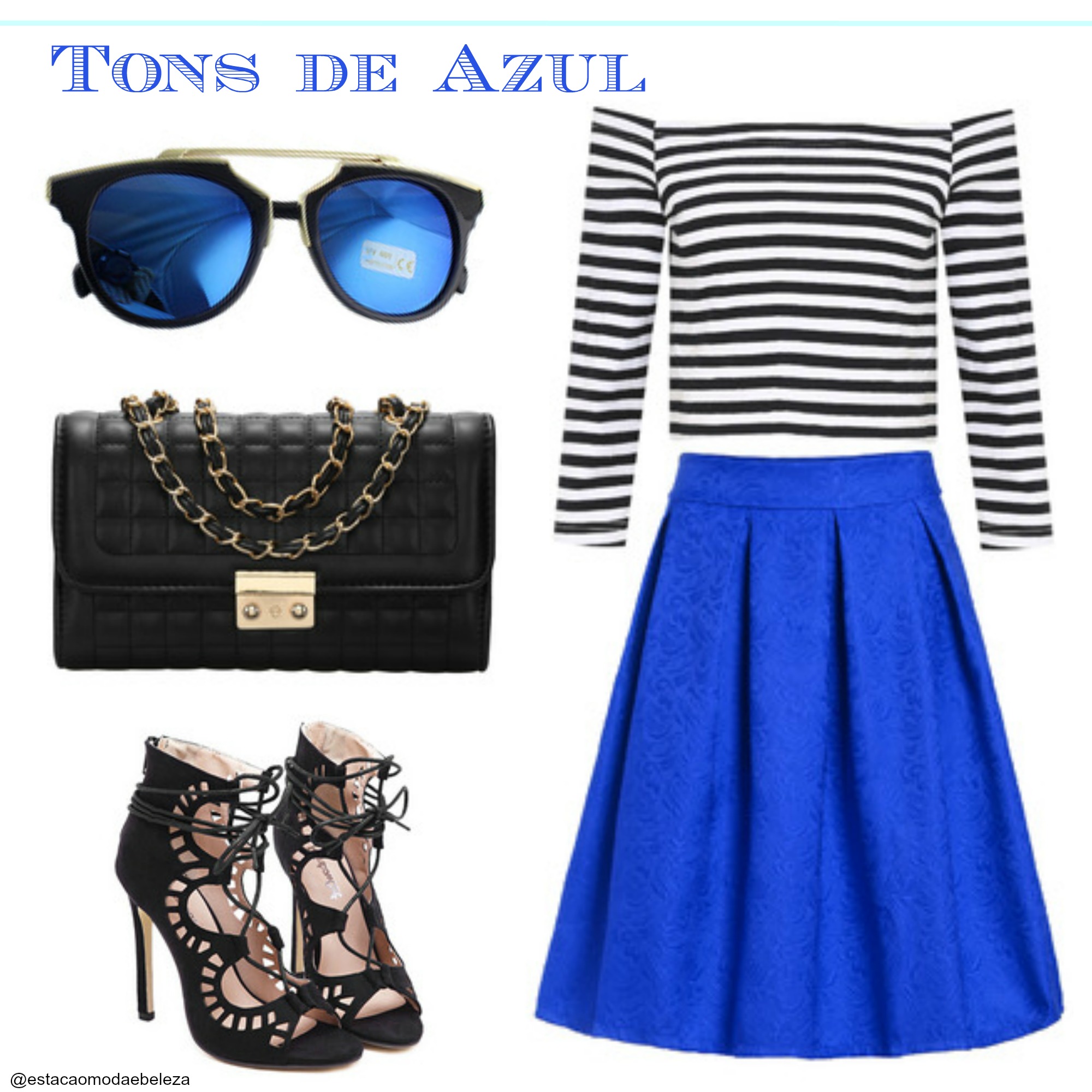 O ultimo look é com uma das minhas cores favoritas: o azul royal! Amo look azul royal com preto. Acho que fica super chique! E essa produção tem mistura de clássico com tendências que continuam em alta. A saia midi combinada com um cropped top deixa o look super poderoso. Escolhi uma bolsa mais clássica, óculos espelhado e sandália de straps para deixar o look estiloso e moderno!