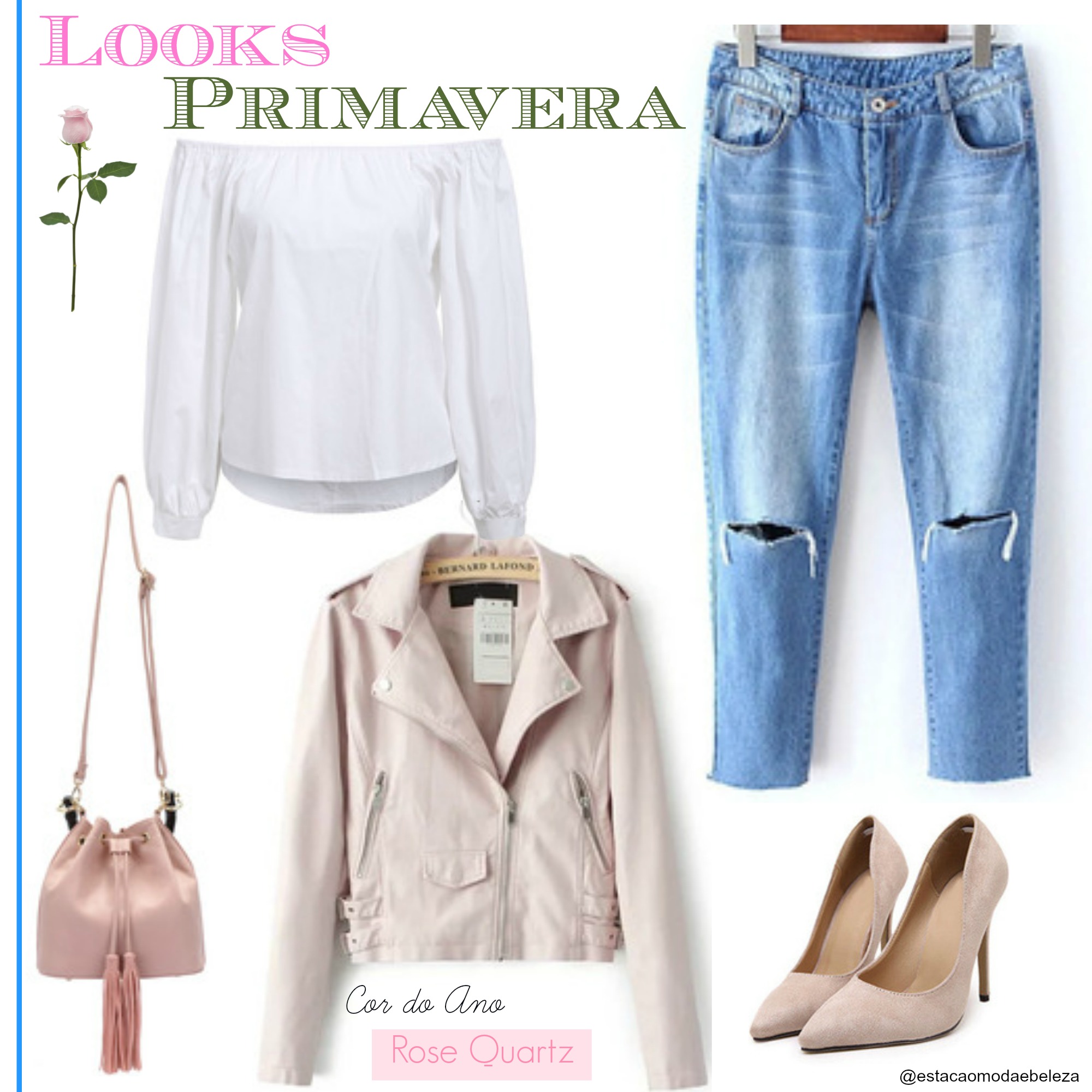E para o segundo look não podia faltar a cor do ano né! Segundo o Pantone, o Rose Quartz será a cor top de 2016. E para esse look escolhi pecas mais despojadas e com toque moderno. Calca jeans rasgada que não pode faltar em nenhuma estação, blusa bem basiquinha ombro a ombro que super valoriza o colo e uma jaqueta de couro rosinha com corte estilo biker que deixa o look super relax. Para as amantes de salto, um escarpim nude com jeans rasgado fica muito top! E a bolsa saco para finalizar e deixar o look super trendy!
