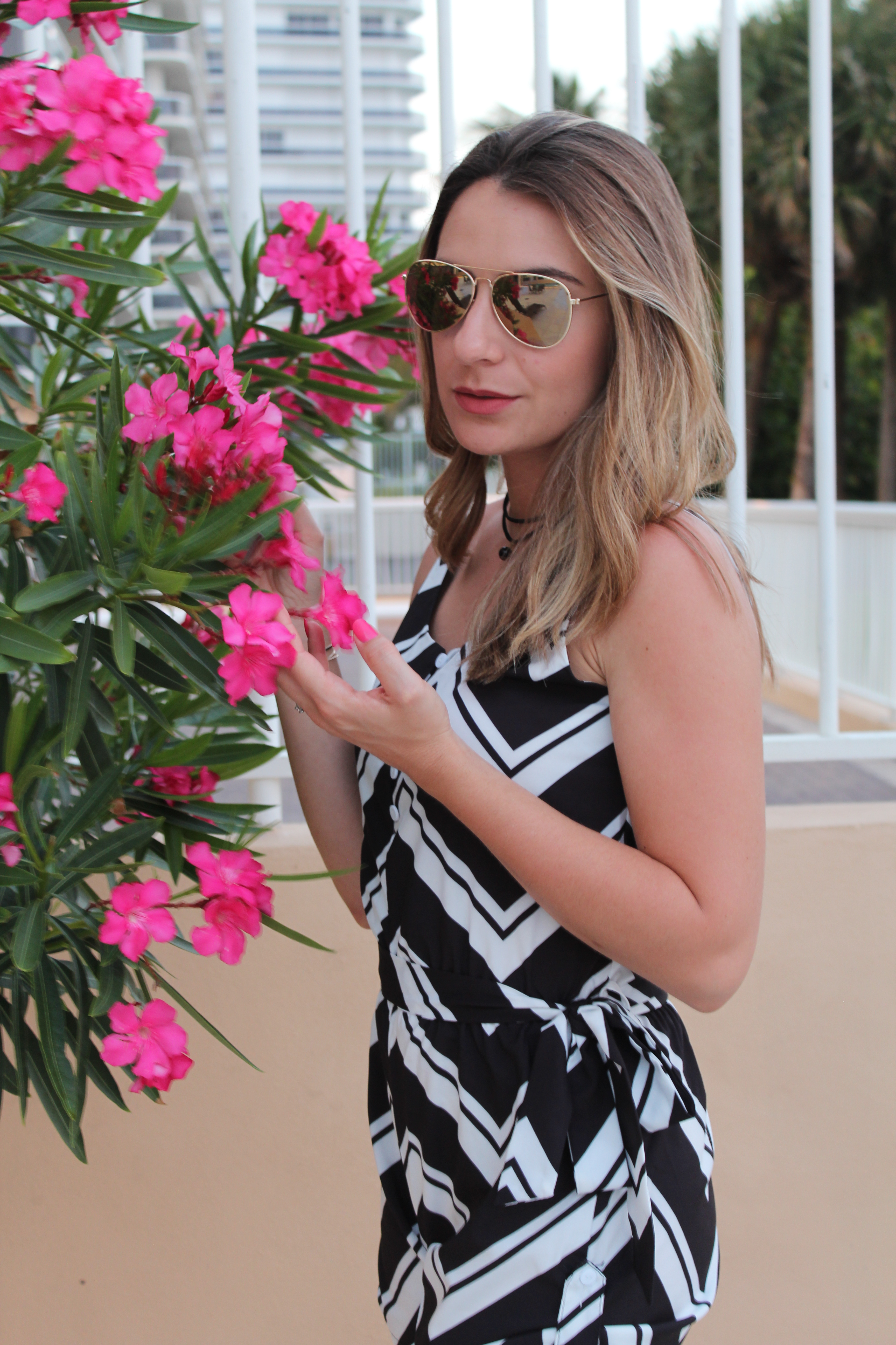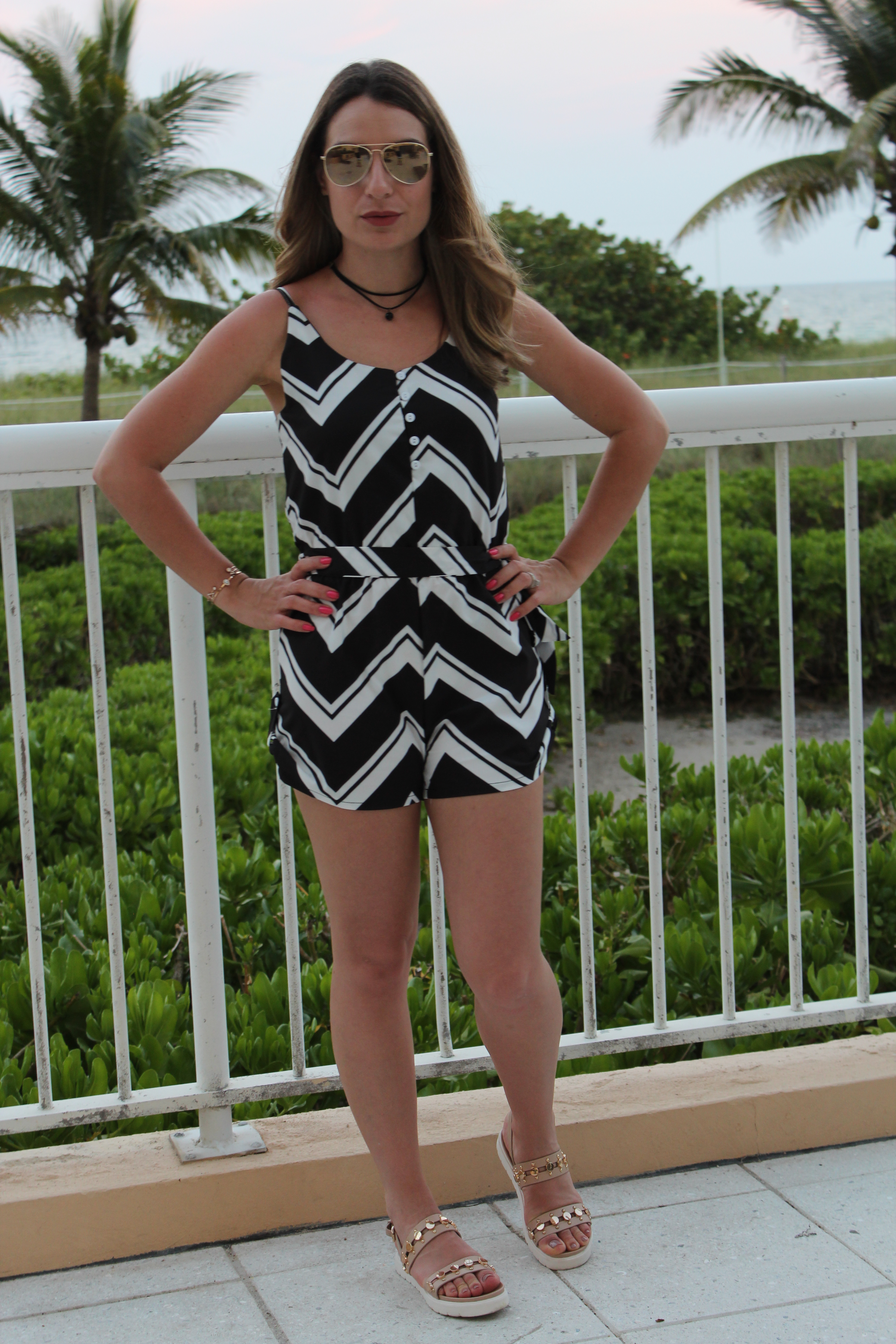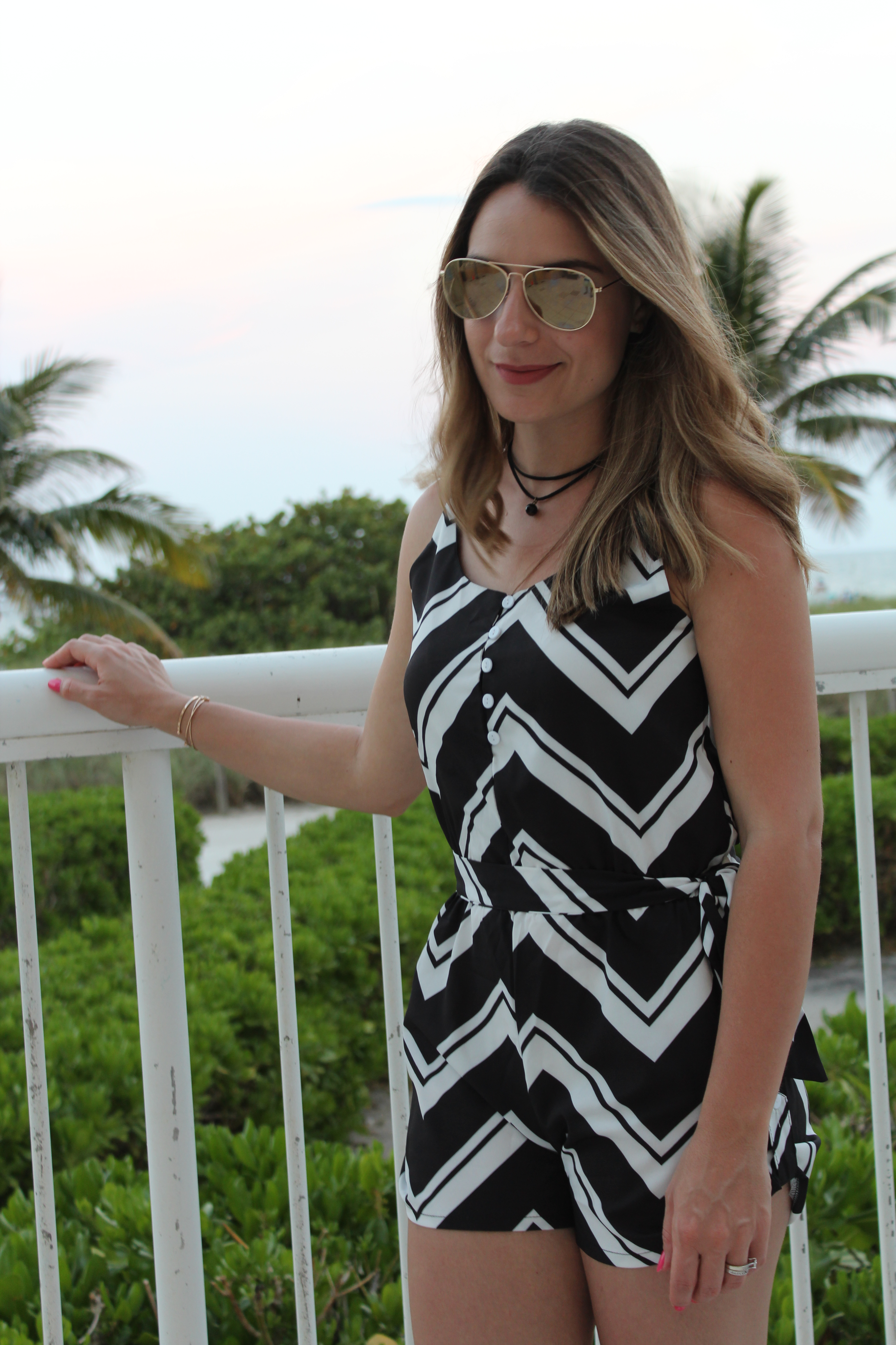 Essa semana estou descansando um pouquinho e aproveitando alguns dias de sol aqui em Miami. Saímos de New Jersey no sábado bem cedinho e chegamos por aqui ainda de manha e ja fui correndo para a praia 🙂 No sábado estava muito cansada da viagem e de acordar super cedo para ir para o aeroporto então nem fotografei look. Mas ontem, depois de um dia de muito calor e praia, resolvemos dar uma volta e sair para jantar pelo famoso Bal Harbor Shops que fica pertinho da onde estamos hospedados. E para o look escolhi um macaquinho super fofinho que recebi da Shein. Alem de super fresquinho e perfeito pra um dia pós praia, a estampa de listras preto e branco é super moderna! Combinei com uma flats nude com detalhes dourado que vocês ja viram por aqui e uma gargantilha preta que também esta super em alta. Vejam como ficou: