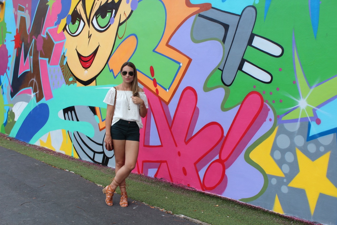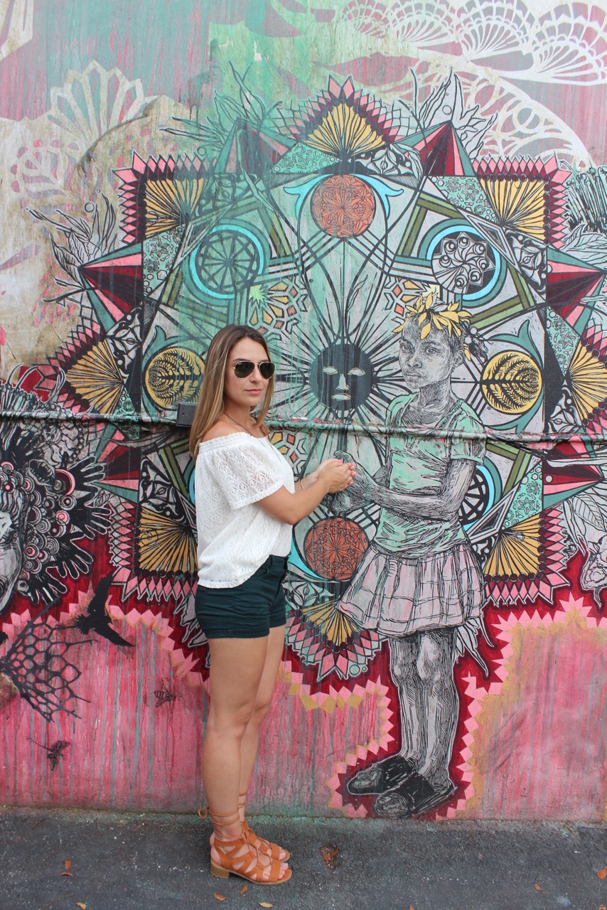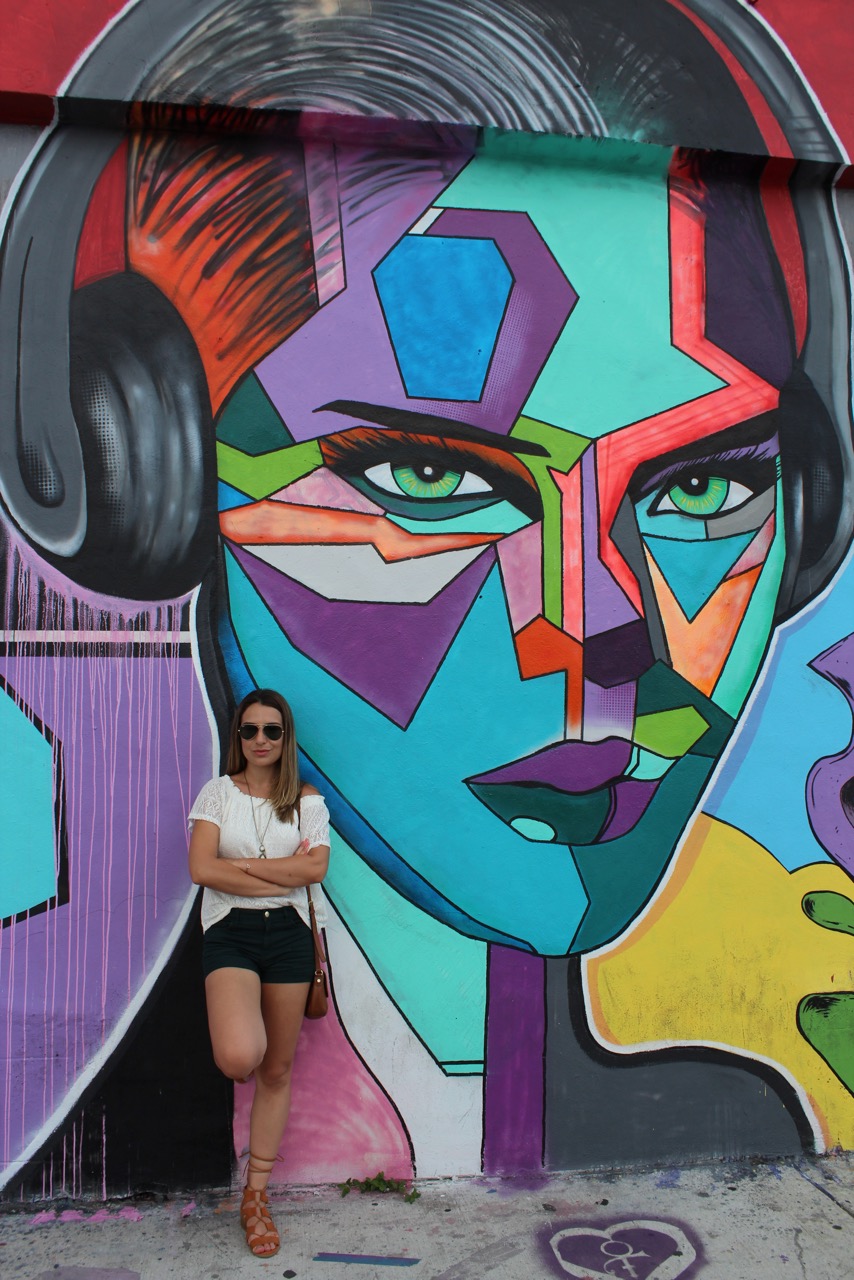 Wynwood é um bairro localizado em Miami, que por muitos anos ficou degradado, mas que hoje em dia é muito famoso pela instalação de galerias de arte e com obras de street art dos mais famosos grafiteiros do mundo. Praticamente todo o bairro tem suas paredes pintadas: lojas, cafés, prédios residenciais, restaurantes, bares… Porém, o centro de tudo é o famoso Wynwood Walls, um espaço onde se concentram as obras dos artistas mais famosos, como se fosse um museu a céu aberto! Chegando la fiquei encantada com os murais e com a vibe do bairro. Tudo super moderno com um toque artístico. Feirinha de artesanatos e comida na rua, musica por todo lado e muita gente bonita. E lógico que me empolguei com as fotos e fiz o marido clicar quase todos os grafites. Vejam que legal: