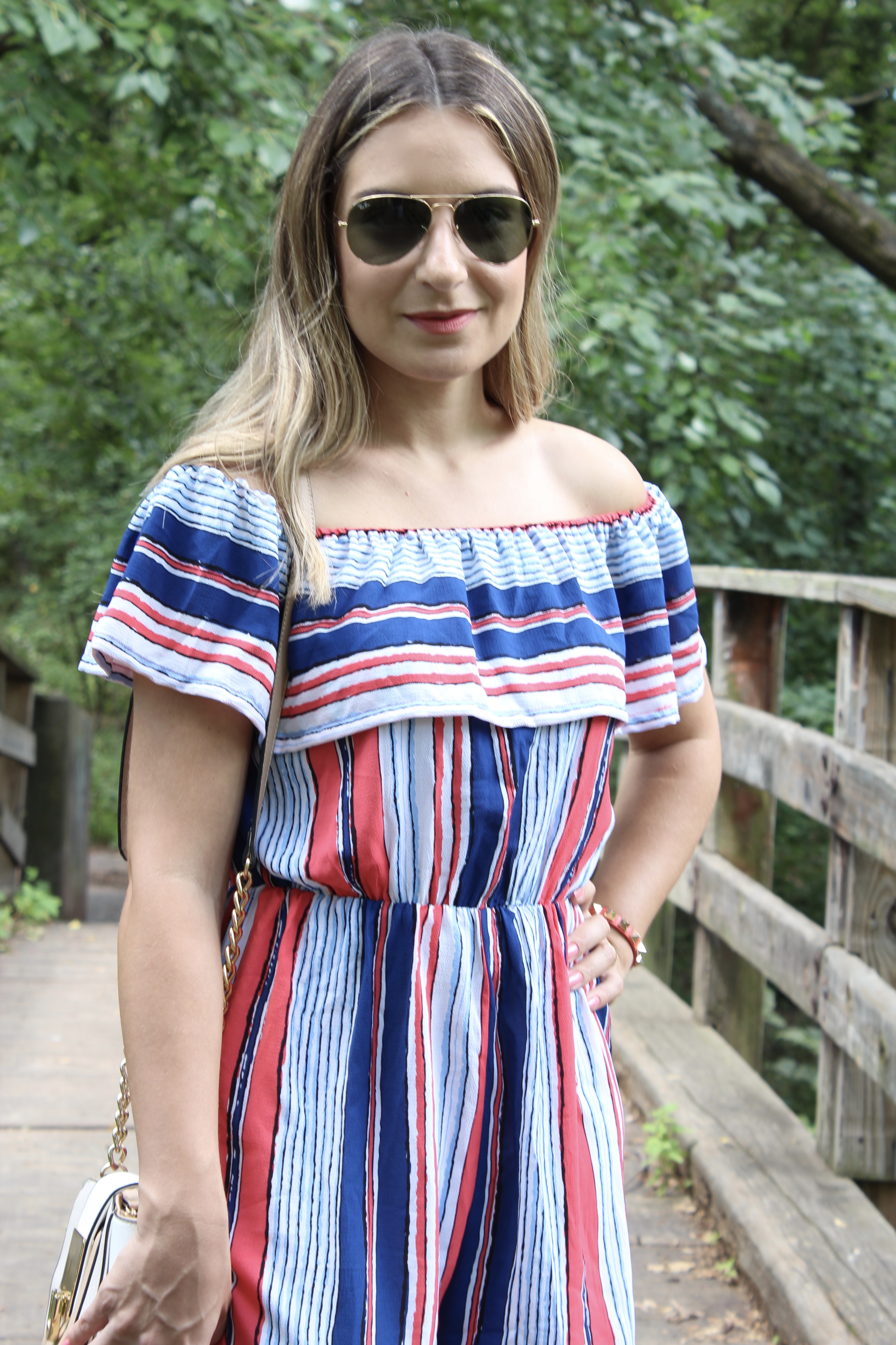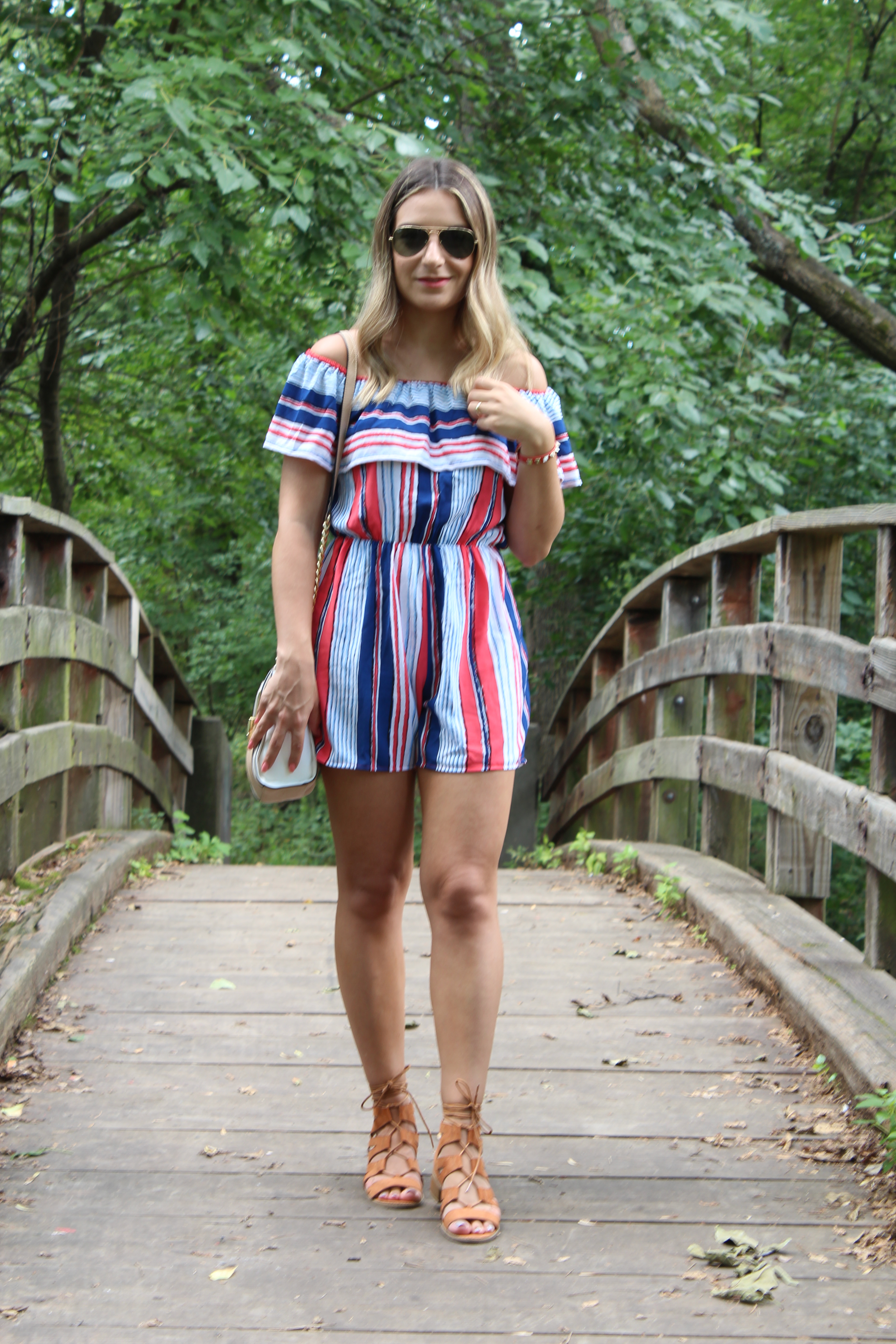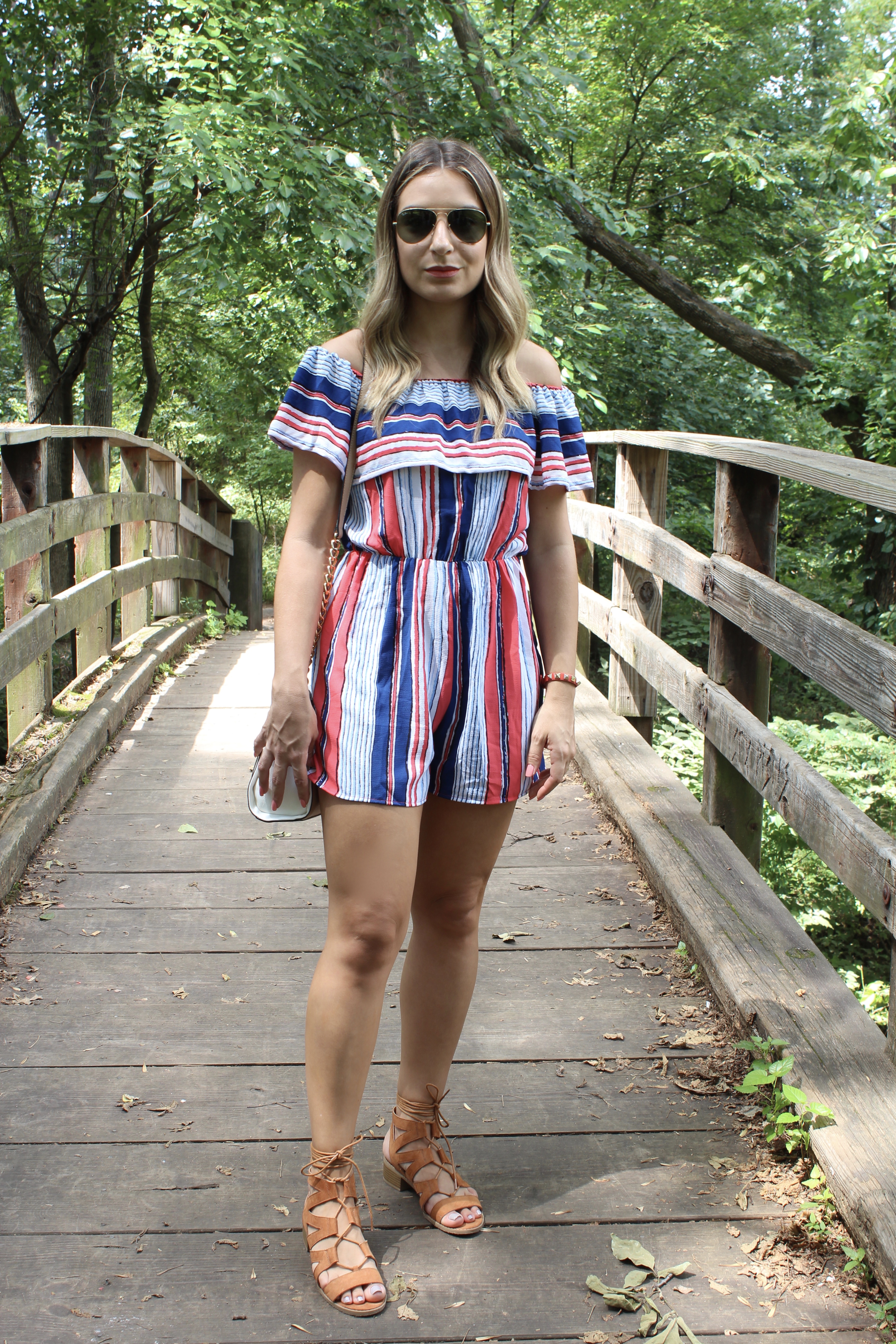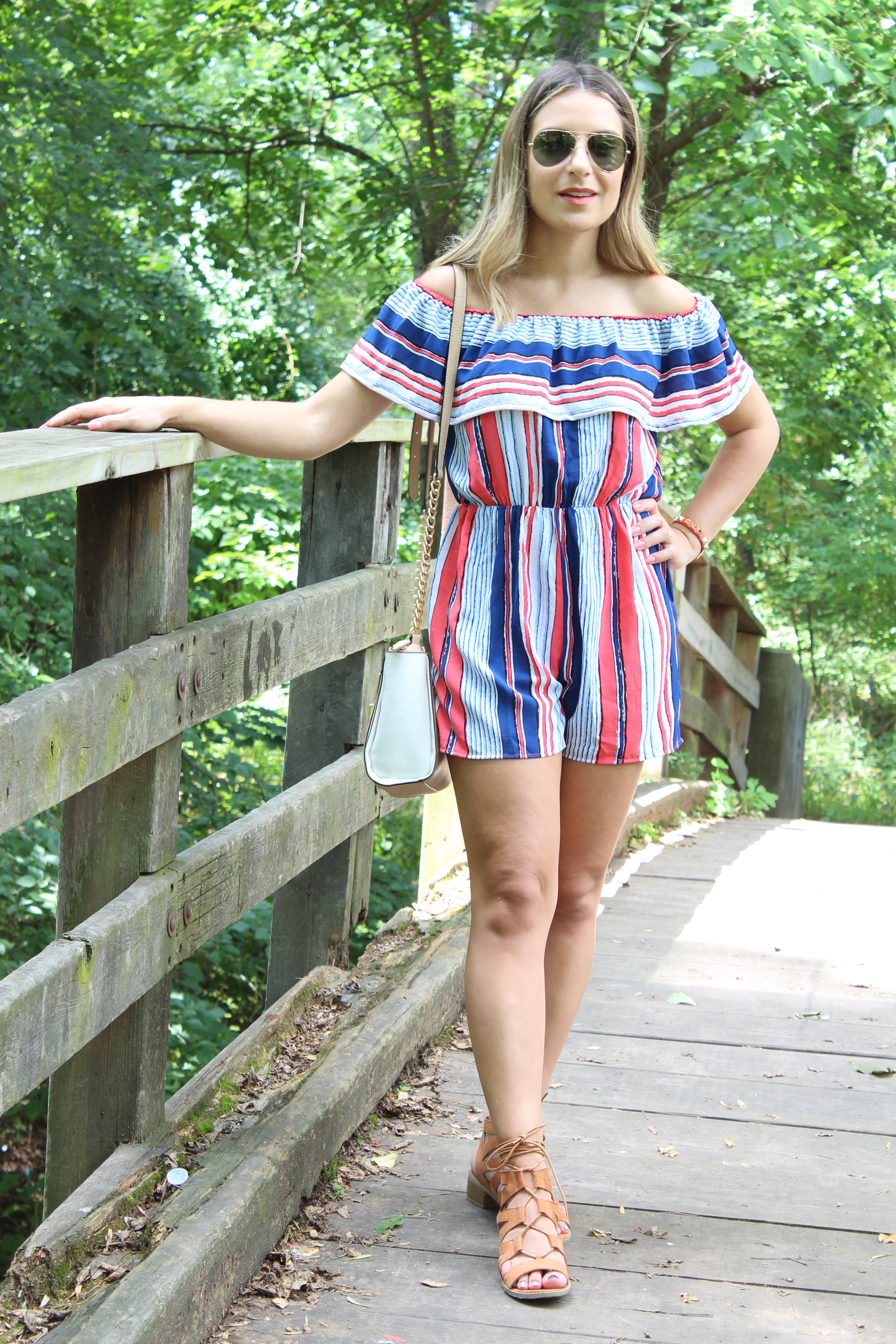 O look de hoje é a cara do verão! Estou amando os macaquinhos para essa estação, pois alem de serem uma peca super versátil e fácil de usar, são super confortáveis. E o escolhido de hoje foi esse macaquinho super fofo da Shein. Todo listrado com cores que estão super em alta, modelinho ombro a ombro (tendência que adoro) e babados. O tecido bem leve fica soltinho no corpo e veste super bem! Combinei com uma sandália estilo gladiadora com saltinho bem baixo. Look perfeito e super confortável para uma tarde de passeio em NYC. Mas tirei as fotos em New Jersey 🙂 Vejam só: