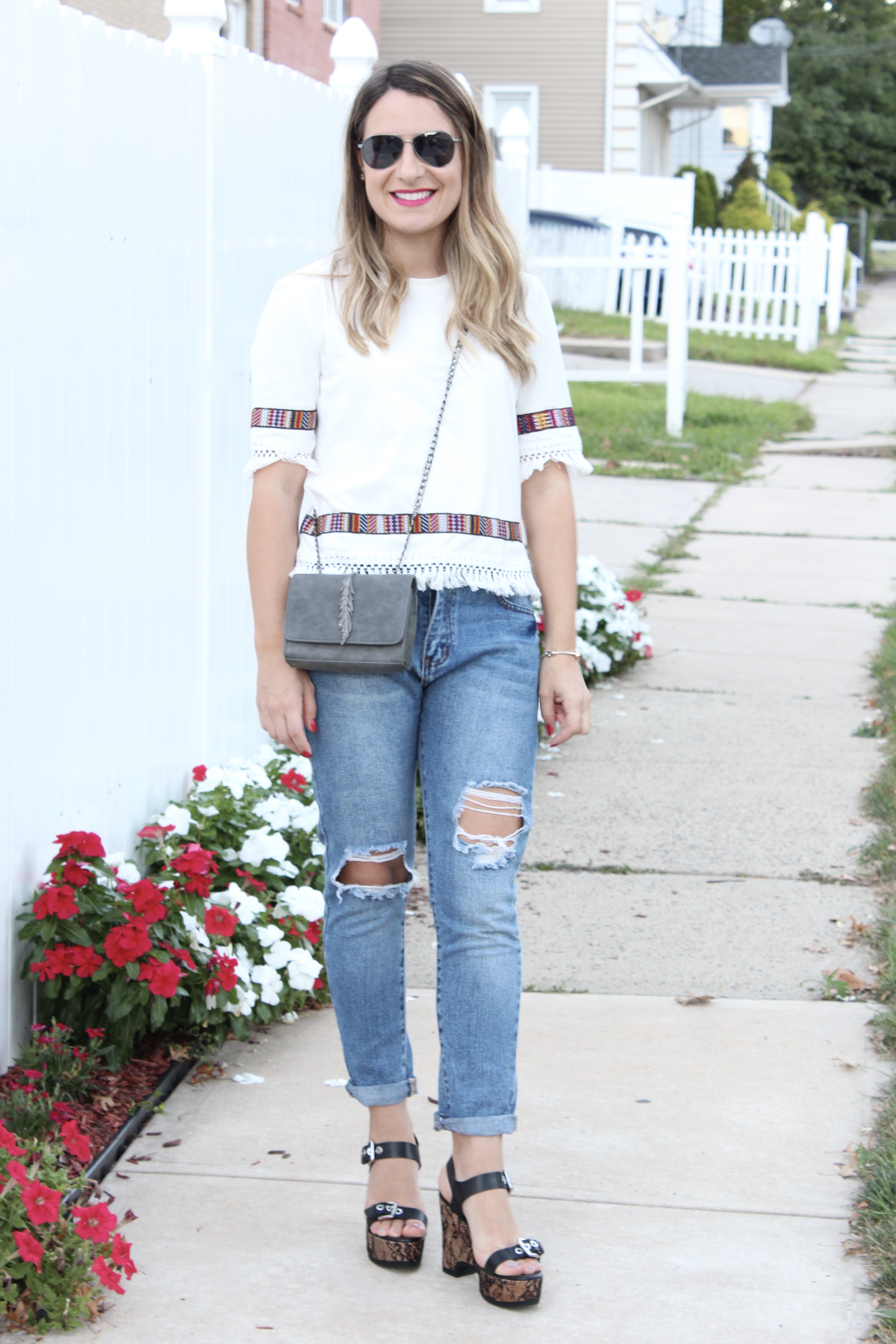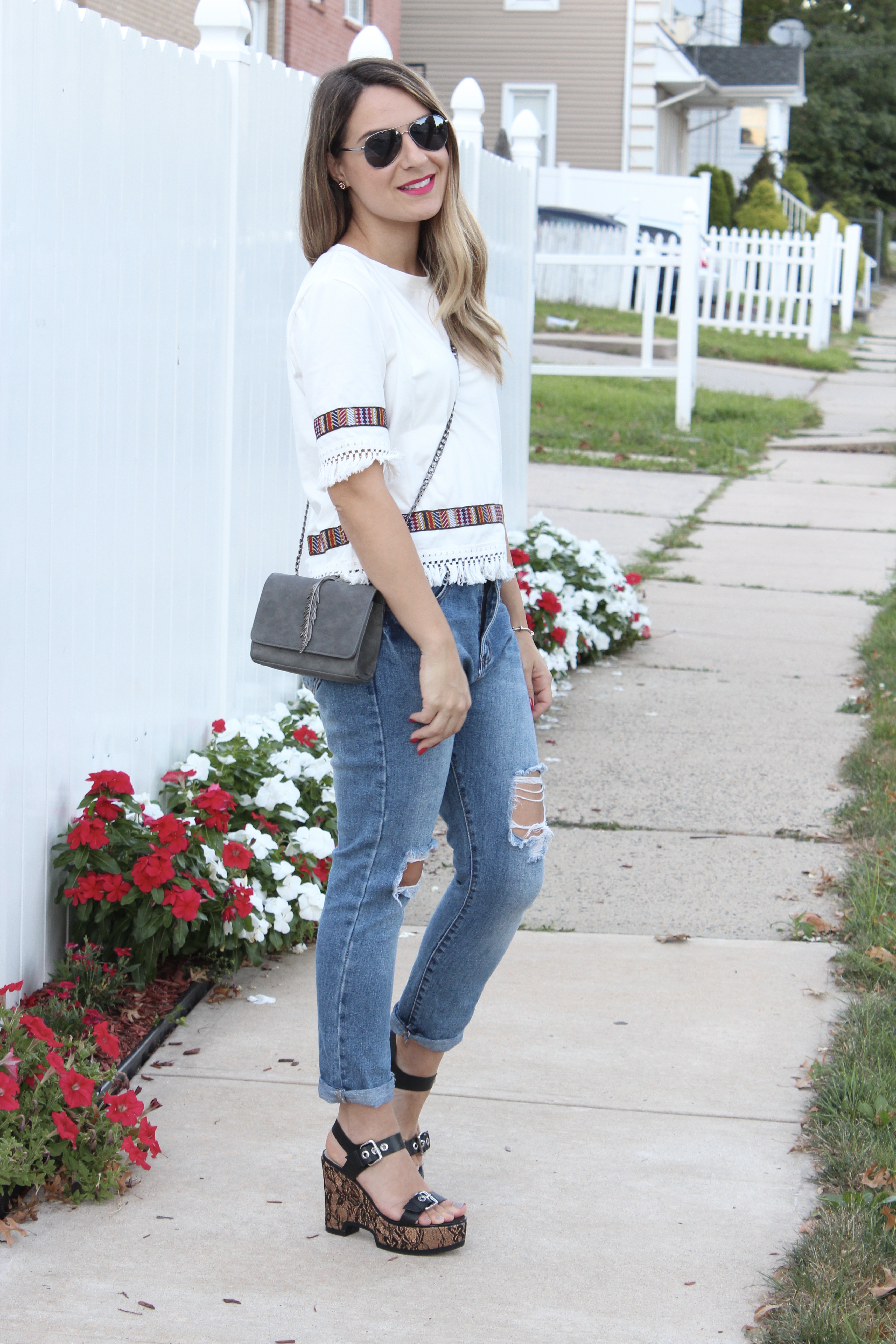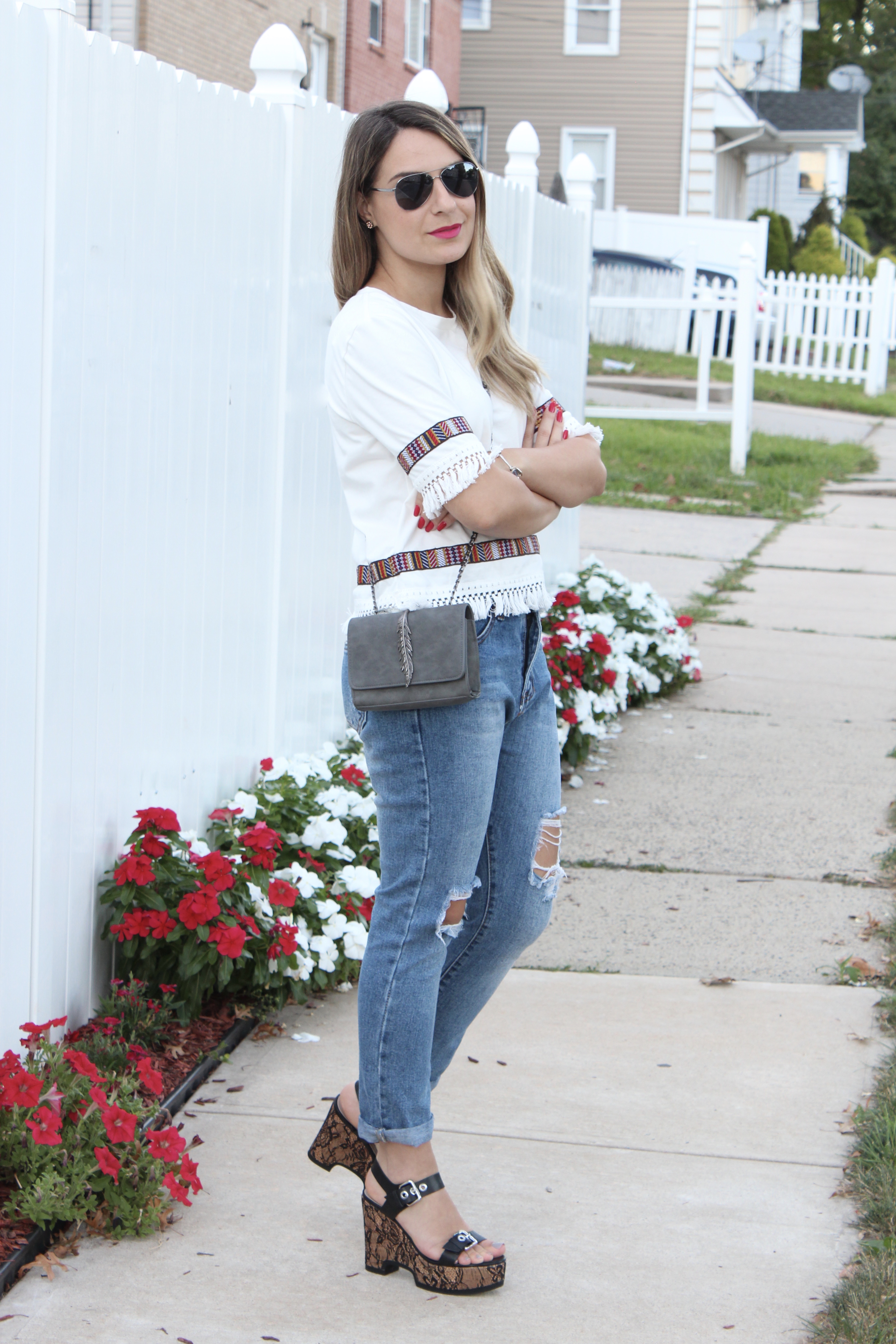 Hoje temos mais um look super despojado por aqui. As calcas jeans rasgadas vieram com tanta forca que entra e sai estacao e elas continuam fazendo sucesso. Eu particularmente adoro! Tanto para um look mais arrumadinho, quanto para uma producao mais casual. E para o look de hoje resolve combinar essa jeans destroyed de cintura alta da Shein com um top estilo vintage, cropped e com detalhes etnico e franjas tambem da Shein. Usei uma sandalia plataforma com fivelas prateada e detalhes de renda no salto que deixou o look super moderninho. Dobrei a barra da calca para alongar as pernas e deixar o look mais despojado. Vejam como ficou: